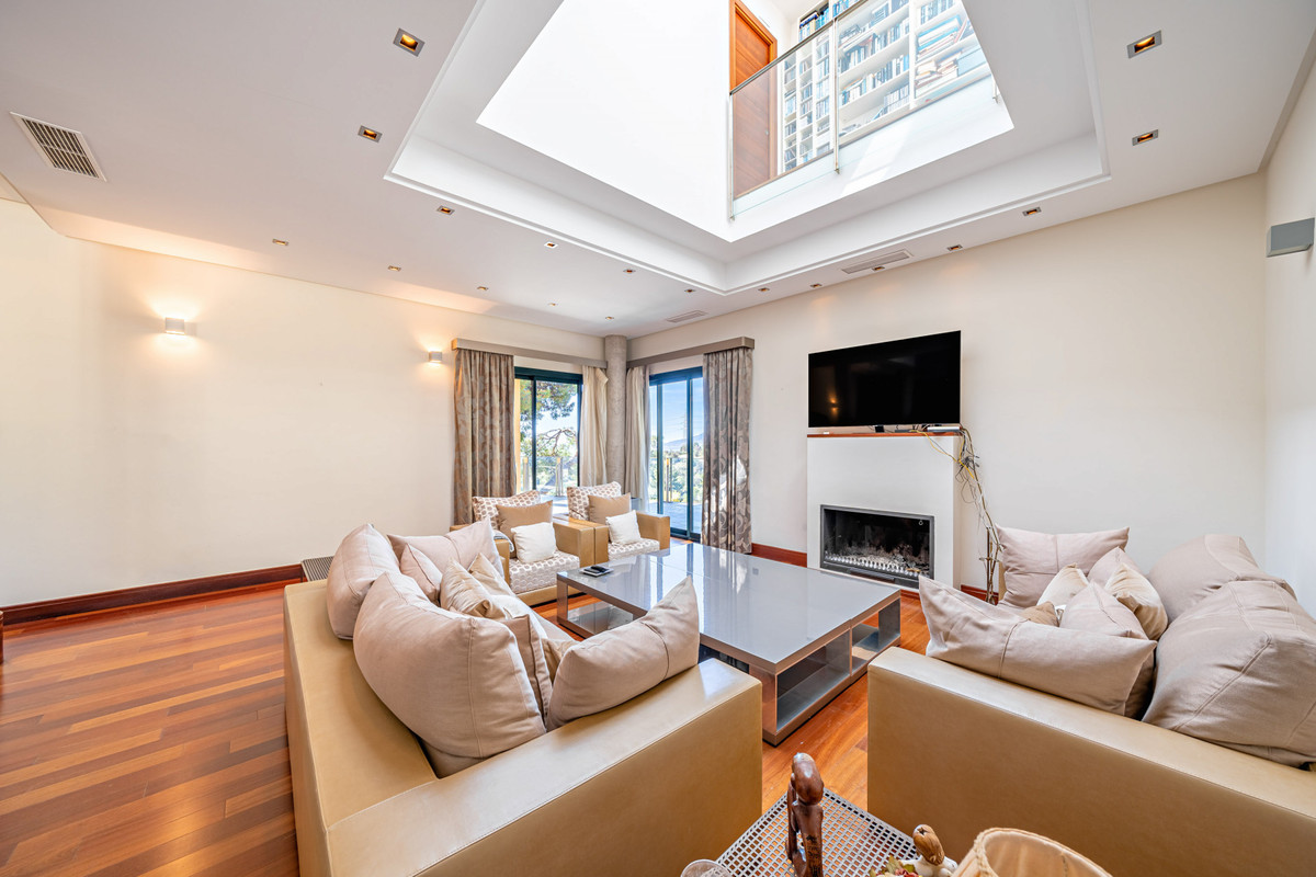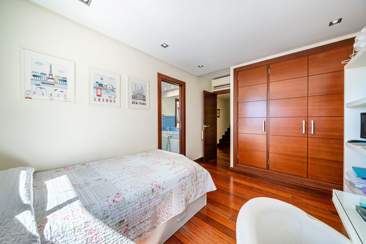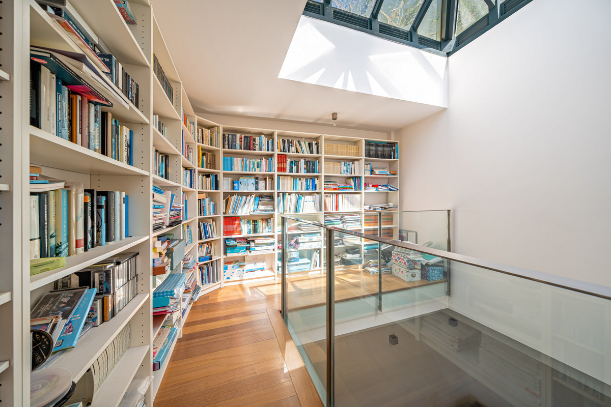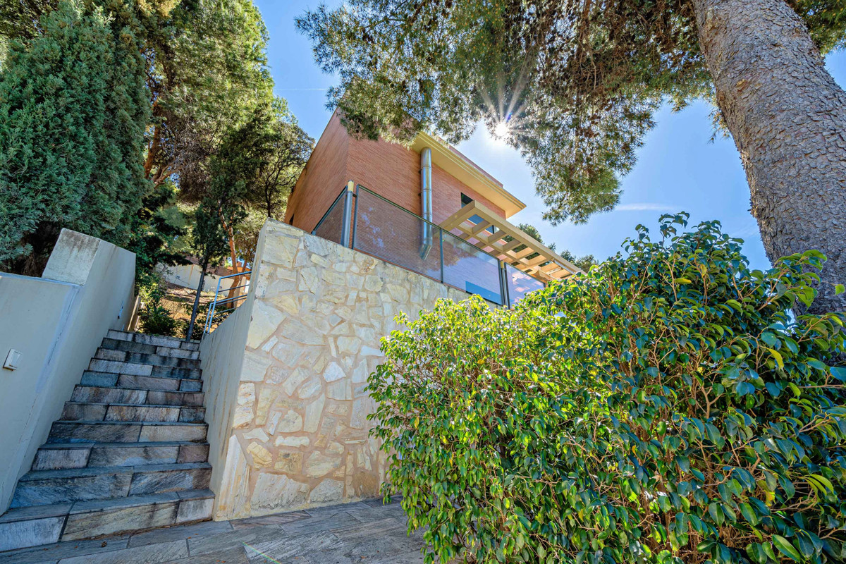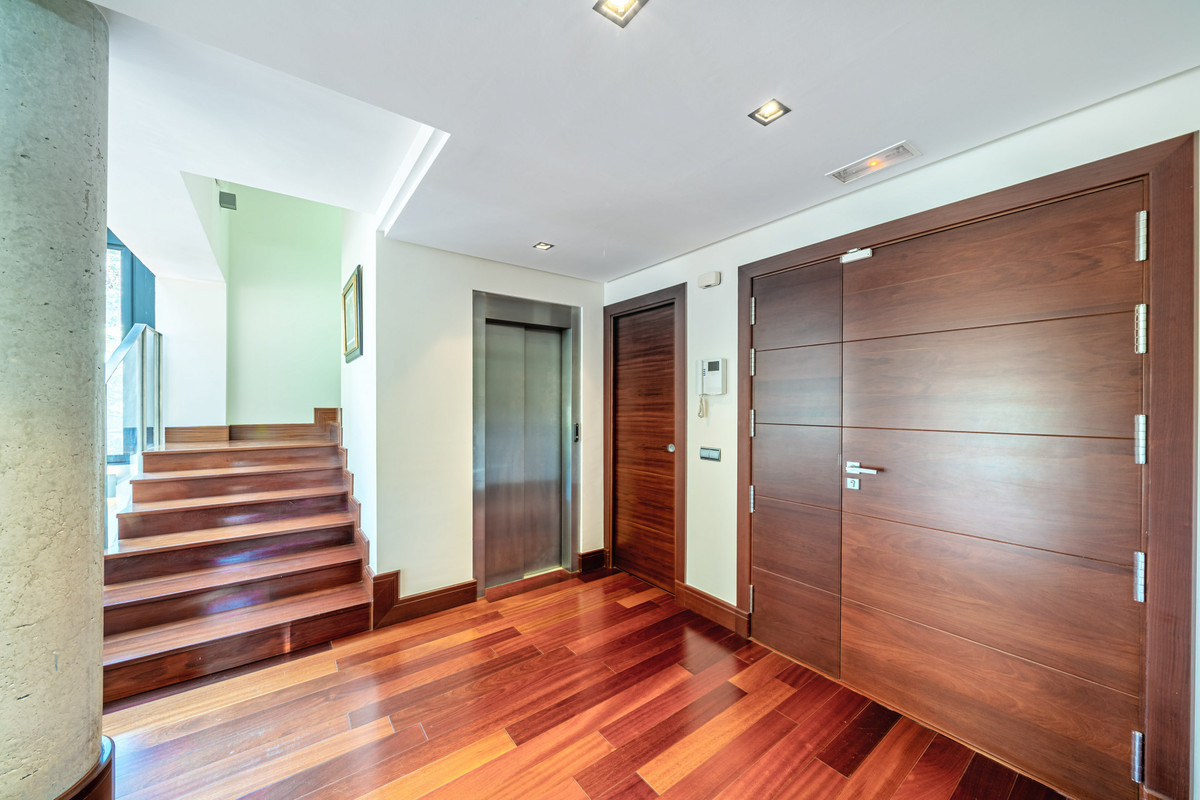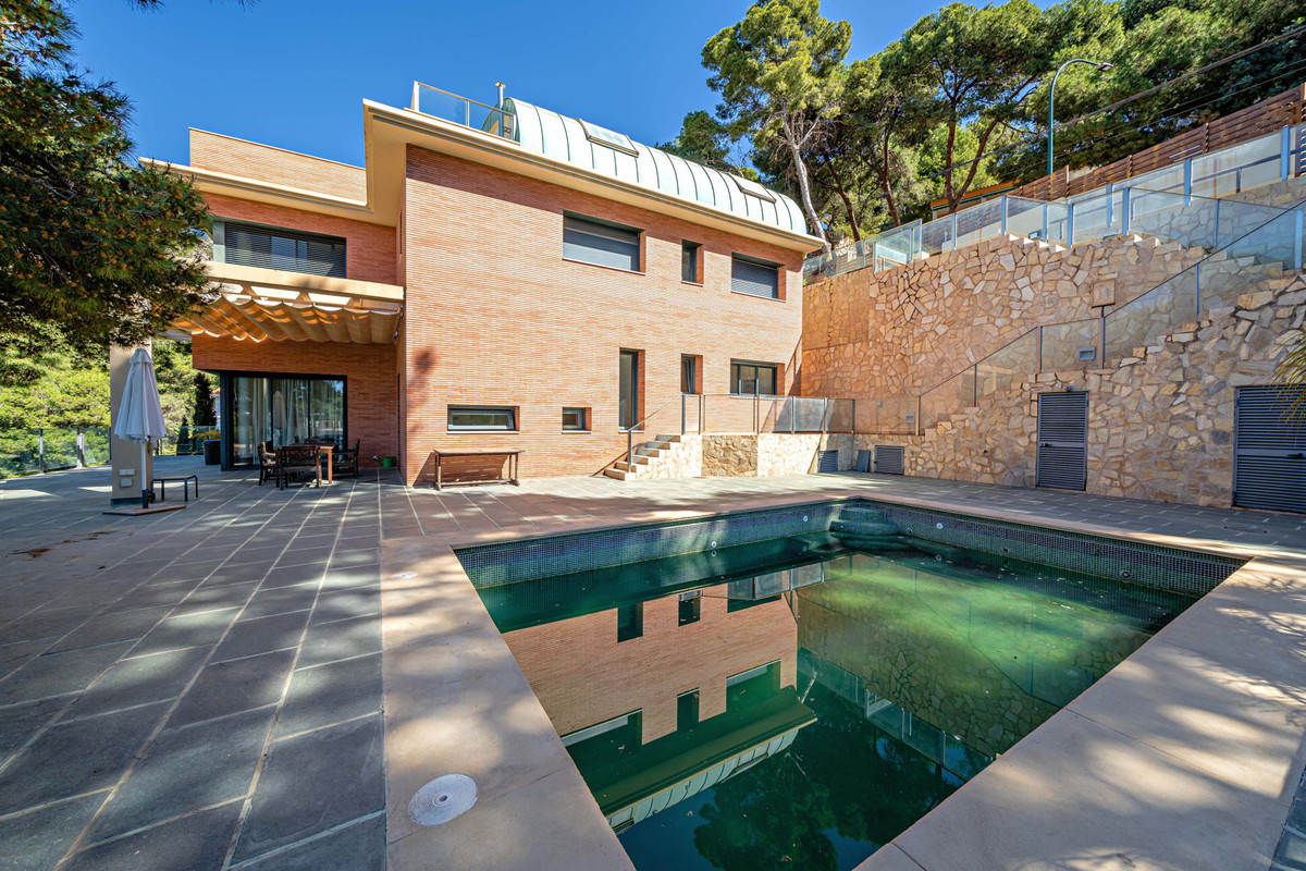 This property, boasting modern design and excellent qualities, has 2 entrances from different streets and a private lift. Distributed over 3 levels, it comprises, on entrance level: large luminous living-dining room featuring double-height ceilings, a fireplace and exit to the porch and further onto the yard with a swimming pool. This level also houses a guest bedroom, a bathroom and a fully-equipped kitchen.