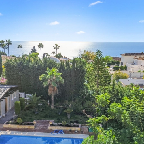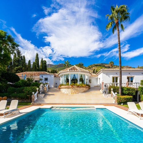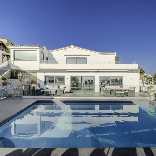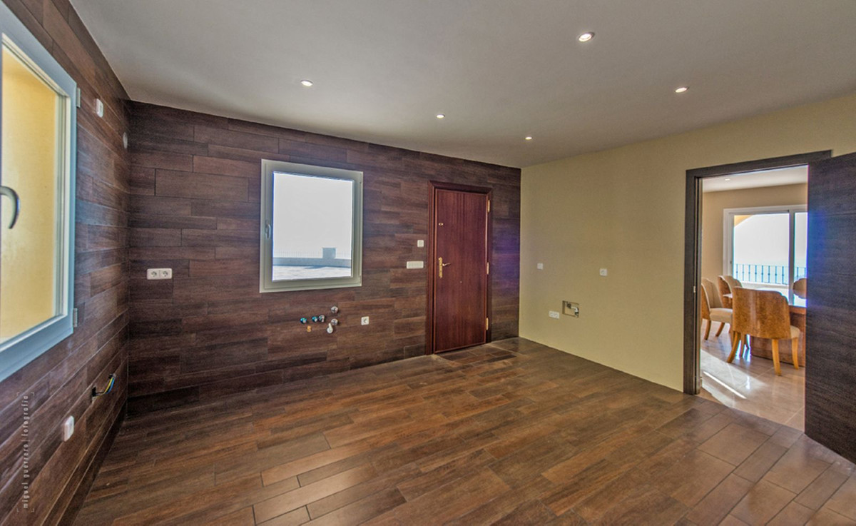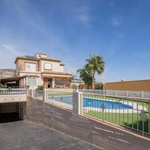It has 4 big bedrooms, all of them with en suite bathrooms, the master one with walking dressing room, a well equipped kitchen, a dining room, a large living room with a fire place, a covered terrace, a guess toilette, a closed garage for 1 car, a big parking space for 4 cars, and a large patio with a swimming pool.