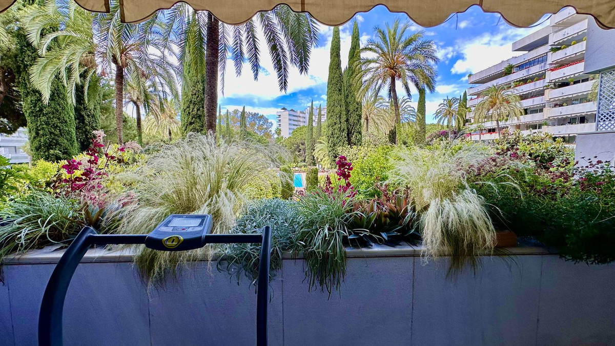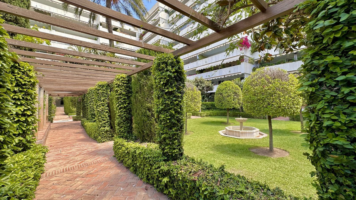 Beautiful and very private apartment in the prestigious complex, located in the center of Marbella, on the second line of the beach and the famous Paseo Maritimo. The complex offers beautiful gardens with two swimming pools, one for children, 24 hour security and concierge service. There is als a new gym with SPA under construction. The apartment offers beautiful views to the garden and pool and has West orientation, it consists of an entrance that leads to the large living room with access to the terrace, the renovated kitchen with the laundry room, the master bedroom en-suite with access to the terrace, two other bedrooms with their bathrooms. The bathrooms are renovated. An ideal property for investment, permanent or vacation residence.