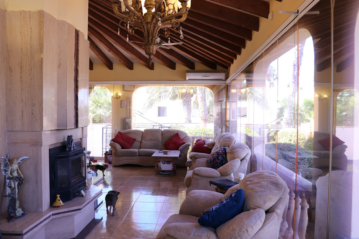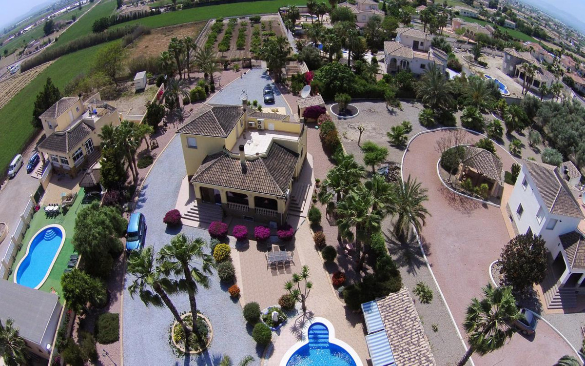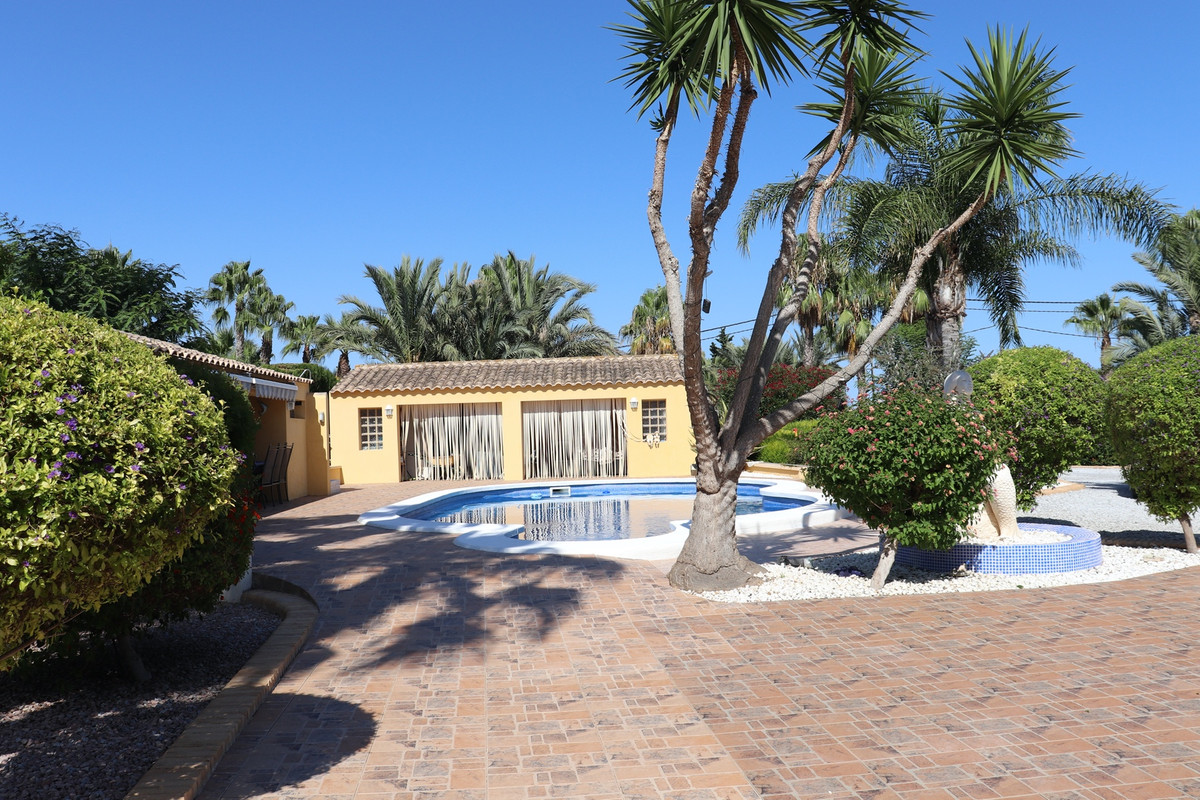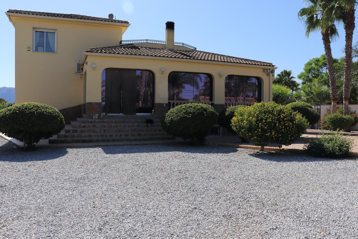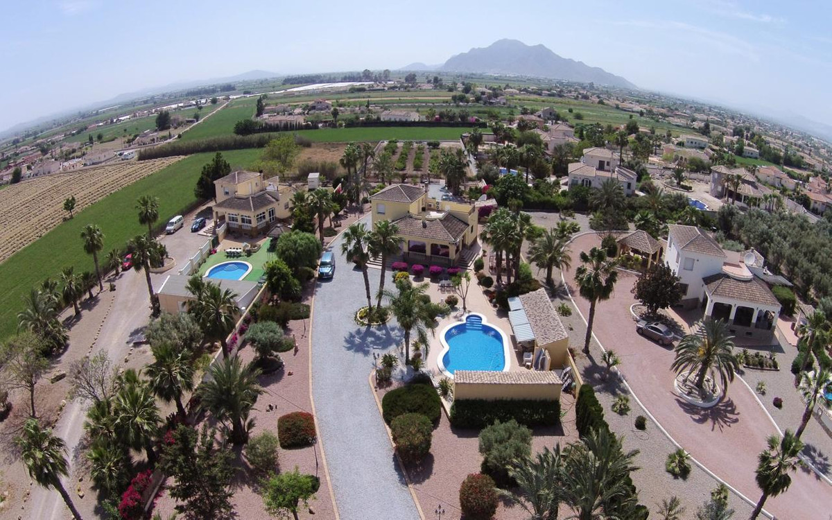 We are very pleased to offer this amazing property in Catral outskirts. This  stunning six bedroom country property in Catral is located in the outskirts countryside just within a five minutes drive of all the amenities, shops, bars, restaurants, etc… When you enter this impressive very wel maintained property you walk in the glazed in terrace area, currently used as a 2nd lounge overlooking the pool area with a feature fireplace and amazing rustic ceiling with wooden beams. This area leading in to the main lounge/dining room which is a very spacious and homely area. The stylish open plan fully fitted kitchen looks into this living area. There are 4 double bedrooms, 2 of which have en suite shower rooms & the master with access out to a private solarium, where there are stunning garden-, country- and mountain views; and there is a family shower room. This master bedrooms has a curved wall which gives this bedroom a luxurious feeling. With this spectacularly spacious property are two one bed, one shower room guests, each with there own fully fitted kitchen & living areas… Outside is a well landscaped garden a private pool, outside kitchen & toilet, parking, orchard to the rear & many extras too!