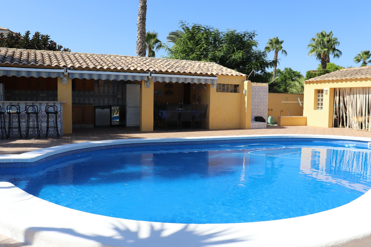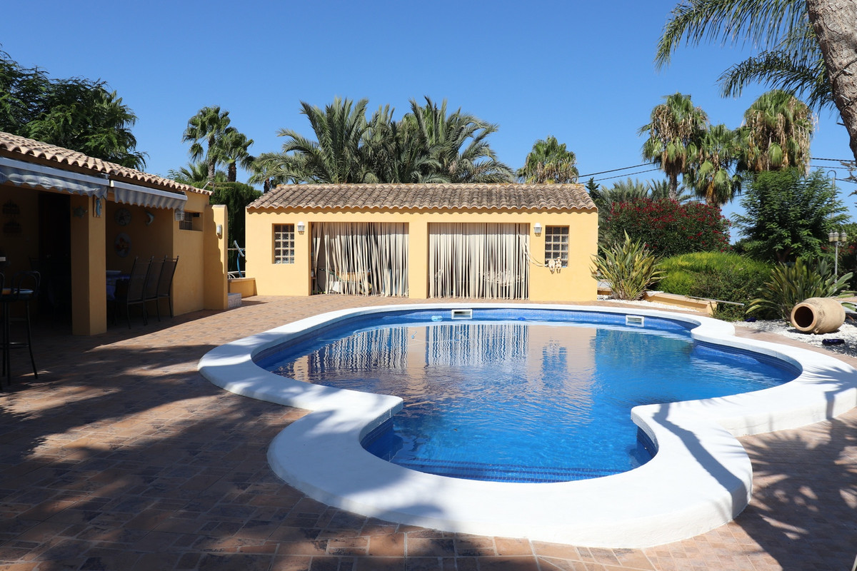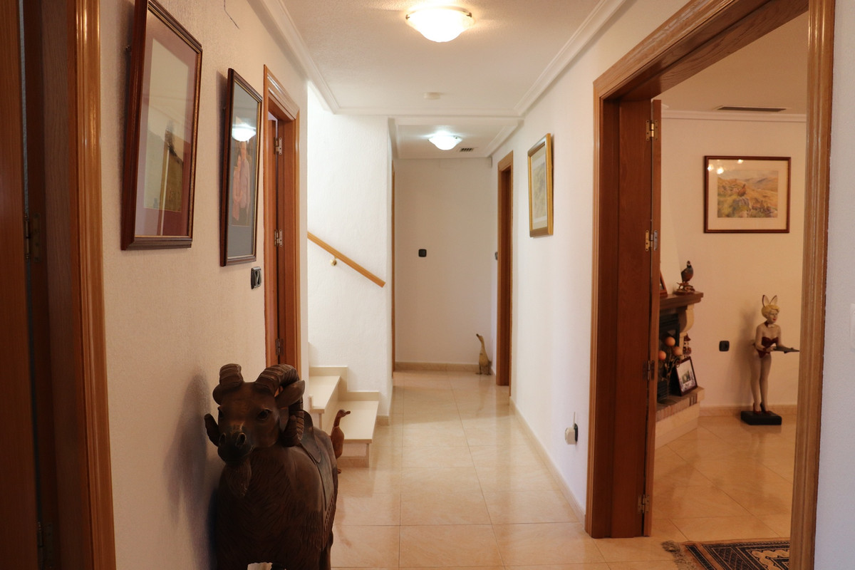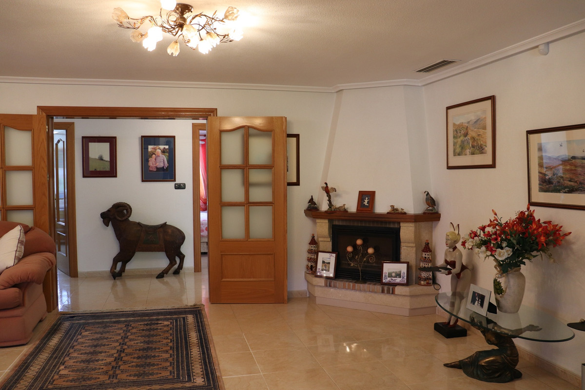 We are very pleased to offer this amazing property in Catral outskirts. This  stunning six bedroom country property in Catral is located in the outskirts countryside just within a five minutes drive of all the amenities, shops, bars, restaurants, etc… When you enter this impressive very wel maintained property you walk in the glazed in terrace area, currently used as a 2nd lounge overlooking the pool area with a feature fireplace and amazing rustic ceiling with wooden beams. This area leading in to the main lounge/dining room which is a very spacious and homely area. The stylish open plan fully fitted kitchen looks into this living area. There are 4 double bedrooms, 2 of which have en suite shower rooms & the master with access out to a private solarium, where there are stunning garden-, country- and mountain views; and there is a family shower room. This master bedrooms has a curved wall which gives this bedroom a luxurious feeling. With this spectacularly spacious property are two one bed, one shower room guests, each with there own fully fitted kitchen & living areas… Outside is a well landscaped garden a private pool, outside kitchen & toilet, parking, orchard to the rear & many extras too!