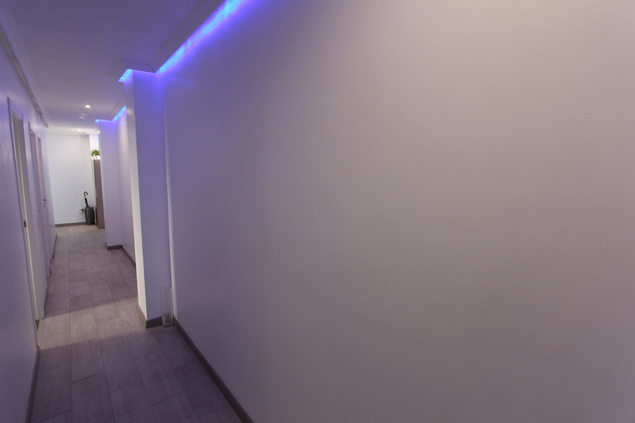 The entrance hall with its led lighting leads to the 2 large double bedrooms with fully fitted wardrobes with views to the sea, there are two further single bedrooms complete with fitted wardrobes.