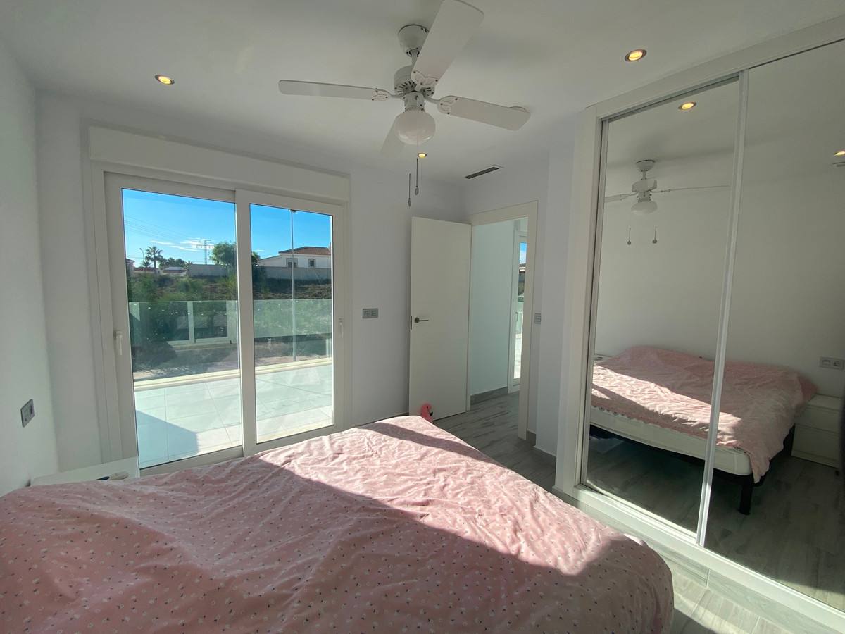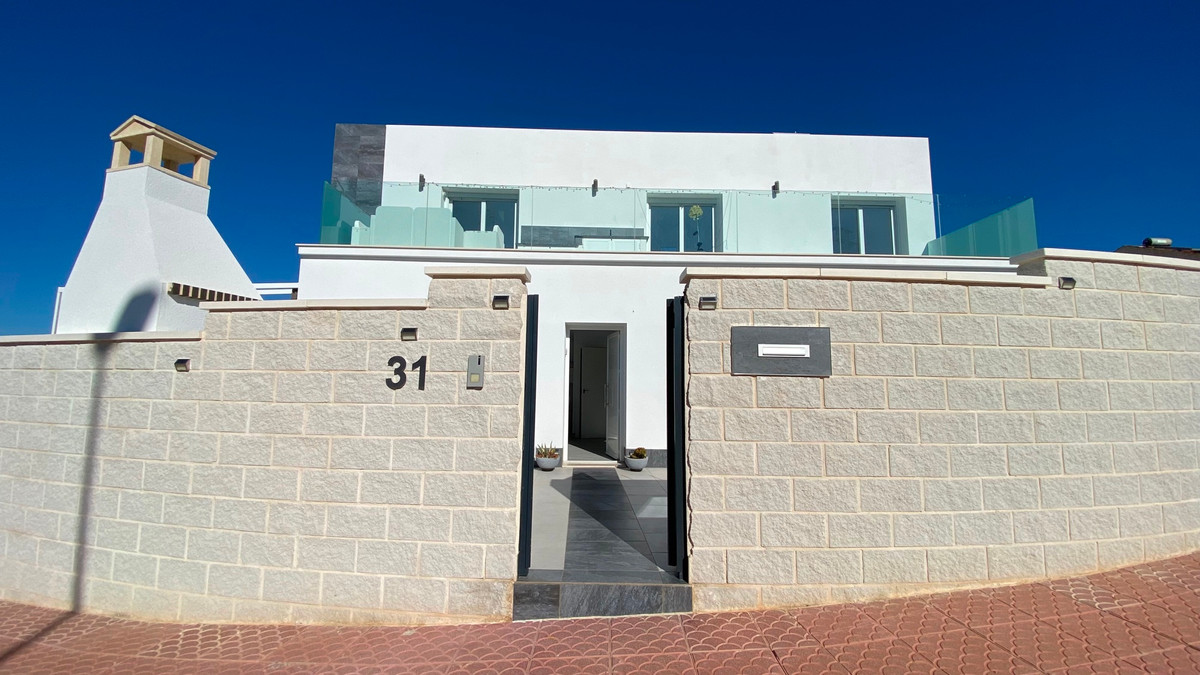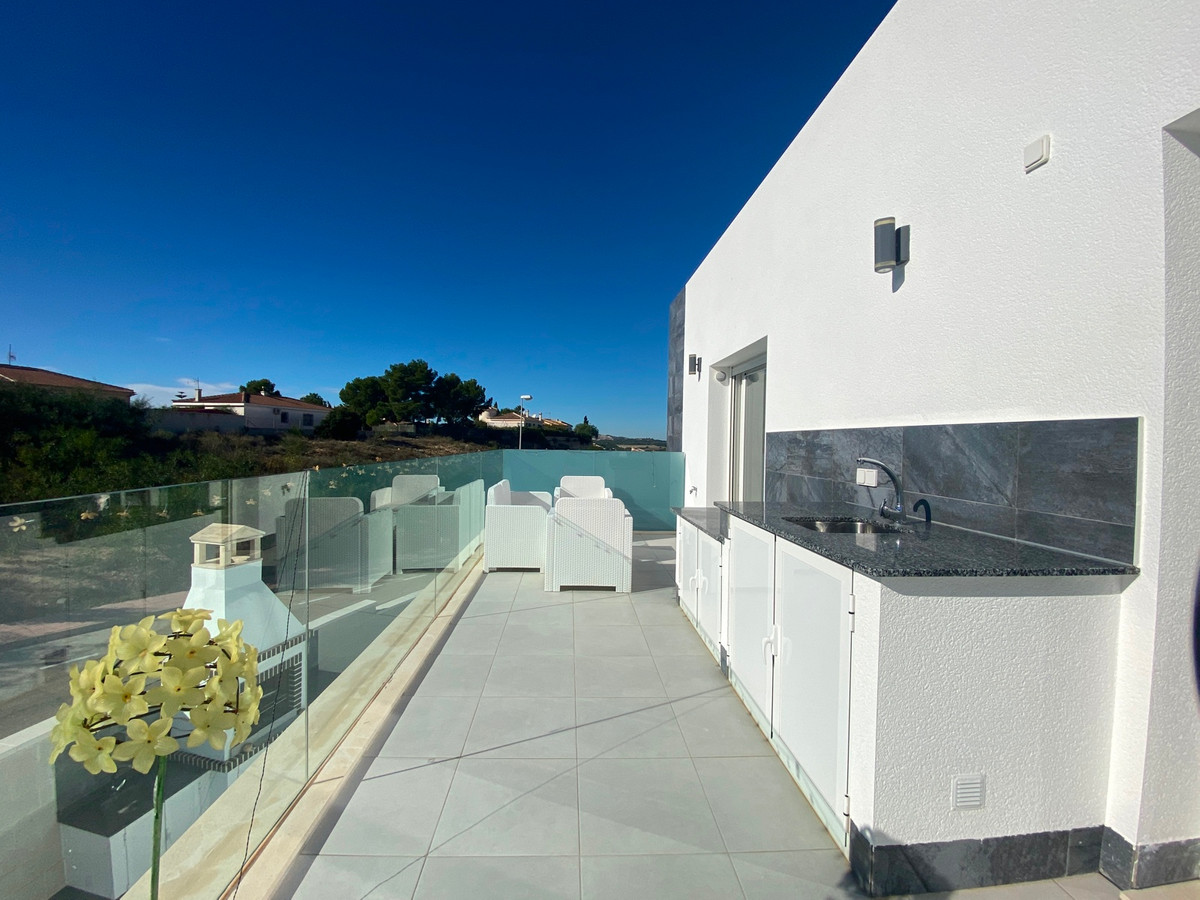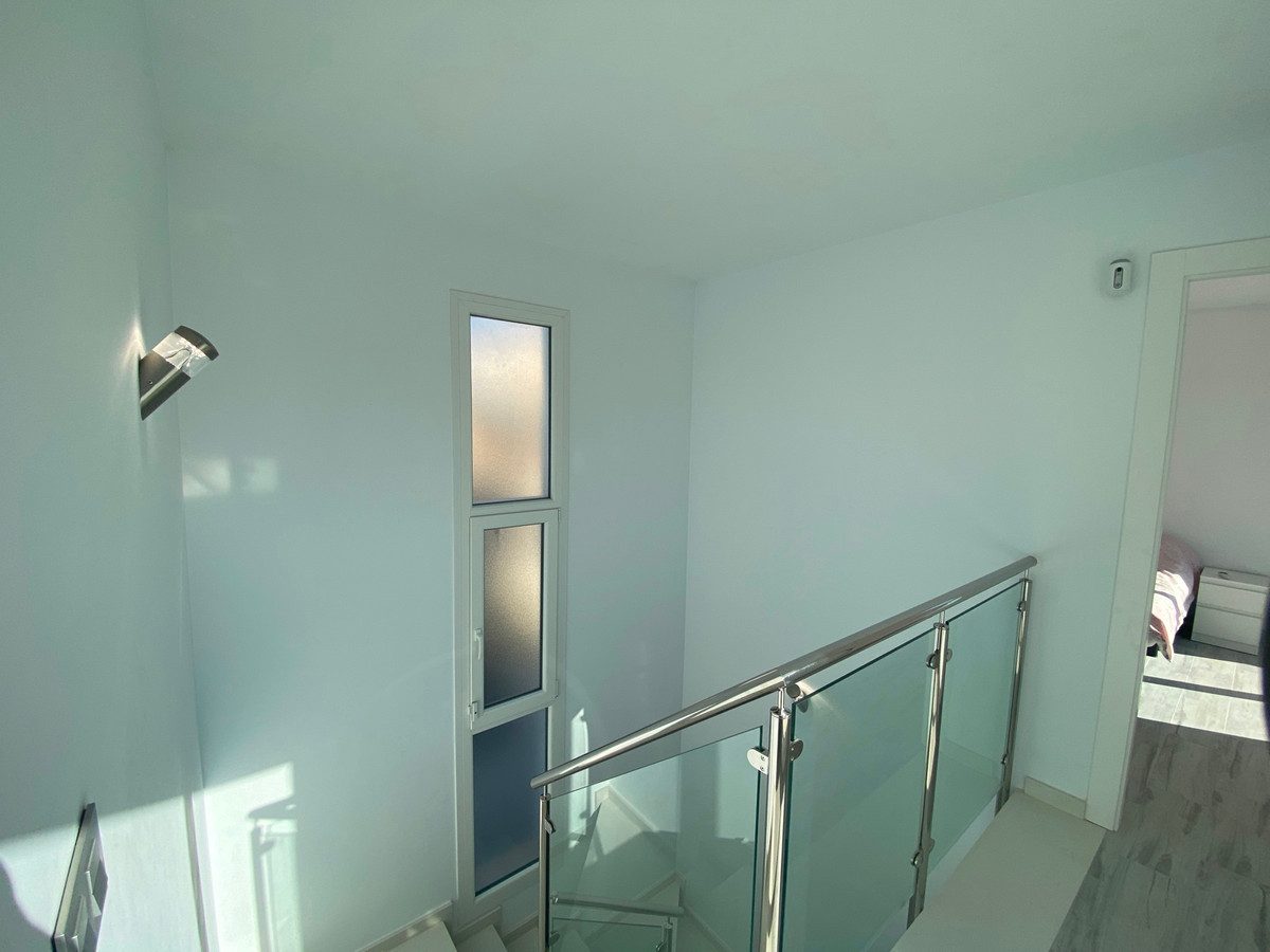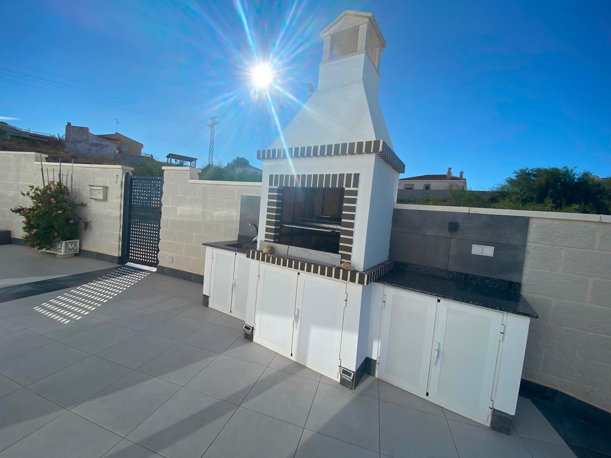 With enthusiasm we present you this beautiful luxury villa located in Quesada. To the left of the entrance is the outdoor barbecue, followed by the swimming pool with a large terrace with a view. To the right of the entrance is the private driveway with storage where the batteries for the solar panels of the house are housed. The house has 3 bedrooms and 2 bathrooms. Upon entering you enter the open plan living and dining area. Nicely equipped open kitchen with all mod cons. On the ground floor there is 1 bedroom and 1 bathroom. A beautiful light staircase takes you to the first floor where there are 2 bedrooms and 1 bathroom. All bedrooms have large sliding doors to which you can go directly outside. There is an open balcony / roof solarium with outdoor kitchen where you can enjoy the sun. There is a heated swimming pool, 8 solar panels and this property has been designed and installed with the highest quality materials and innovative systems such as air filtration, underfloor heating and much more! The house is sold fully furnished.
