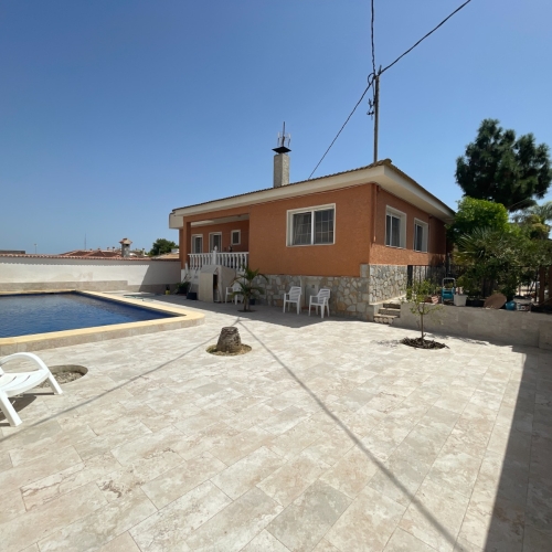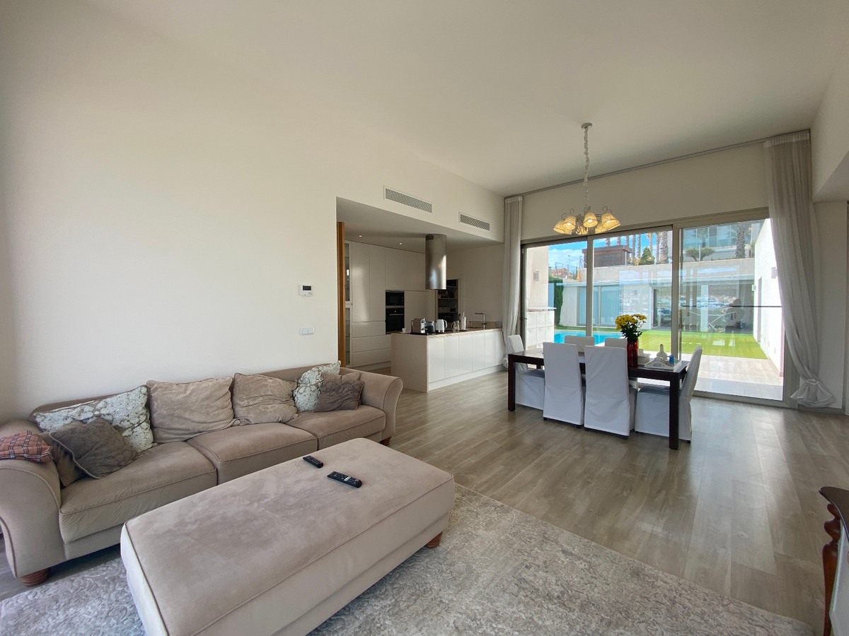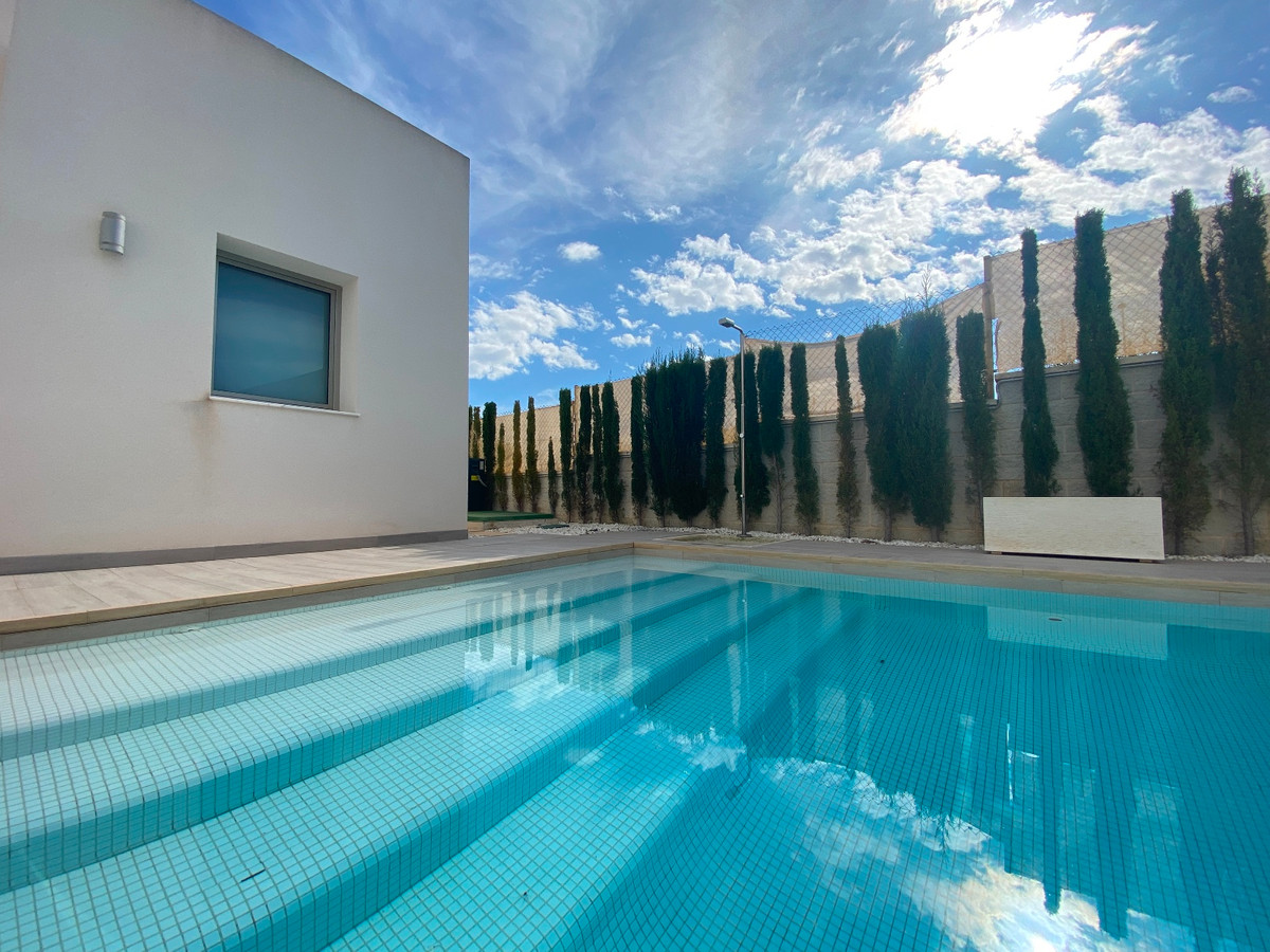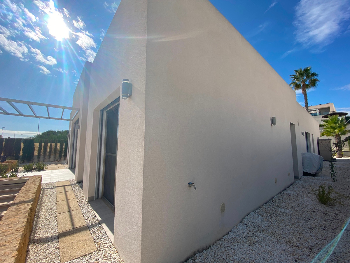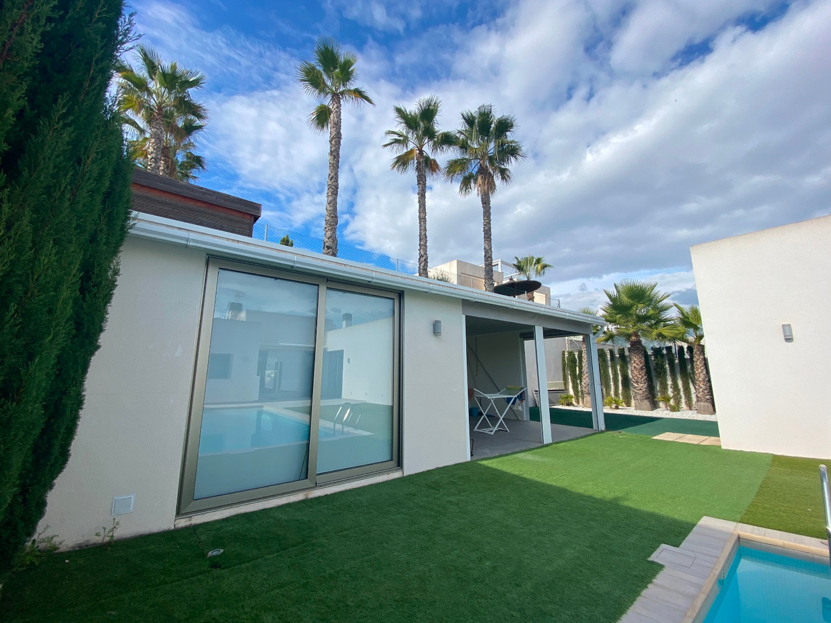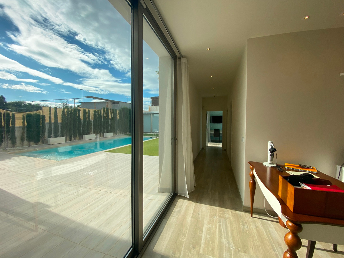 This beautiful modern villa is located in Benijofar. Within walking distance of all amenities, Cañada Marsa Natural Park, close to Agua Park Quesada and La Marquesa Golf in Rojales. The villa was built in 2006 and is on one level. Outside there is a (heated) private swimming pool, low-maintenance garden, covered parking for two cars, several places where you can enjoy the sun and a large closed space that could be turned into a fourth bedroom or an office space. The house has a large bright living and dining room with fireplace. A sleek open kitchen with utility room. There are 3 double bedrooms, all with fitted wardrobes. The 2 bathrooms have underfloor heating, heated towel rails and 1 has a bath. The master bedroom has an en-suite bathroom and a walk-in closet. Ducted air conditioning hot/cold with air freshener. This villa is sold fully furnished. Benijófar is a typical Spanish village with a variety of services such as bakeries, supermarkets, pharmacies, medical center, mini golf, shopping centers, bars and restaurants. Located approximately 30 minutes from Alicante Airport, 15 minutes from the beaches in Guardamar. La Zenia boulevard and Habaneras shopping centers are also within easy reach.