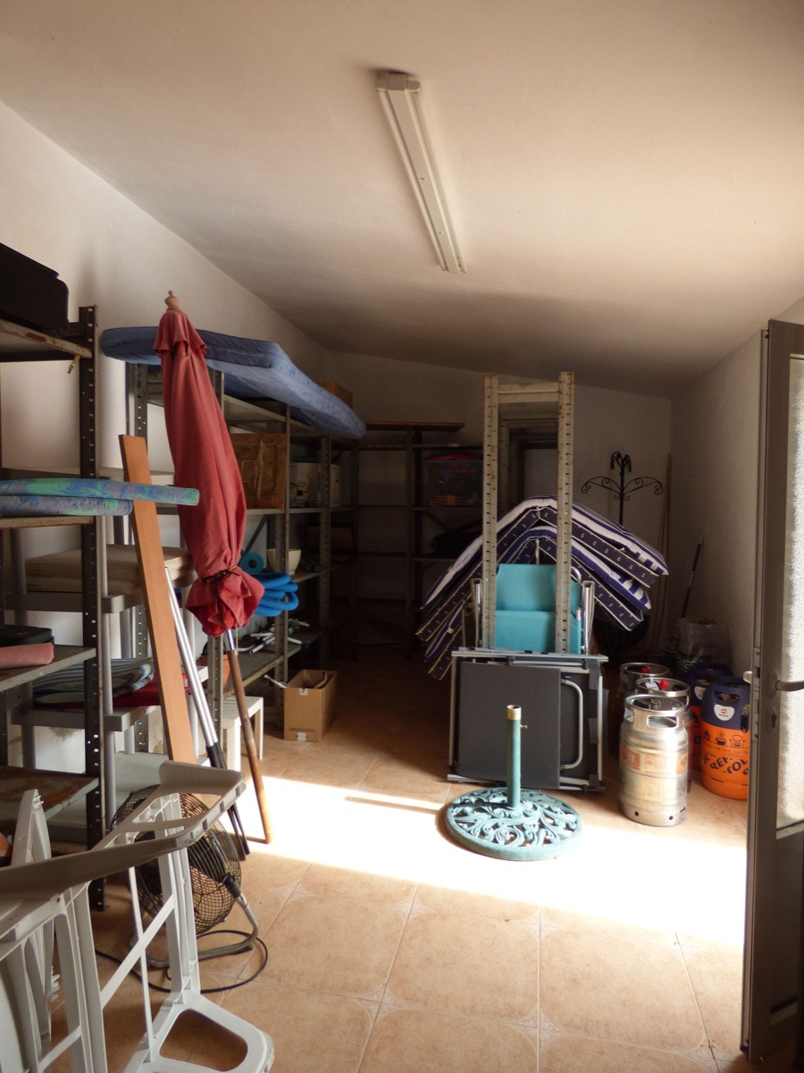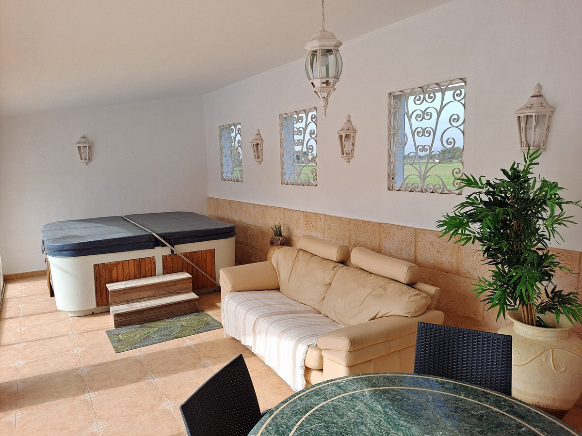 The size of the private pool is 10m x 5m with indoor seating area and a large sun terrace. Adjacent to the pool there is a large living room with a hot tub, jacuzzi and sofa and table for winter use or summer when using the pool. The plot is landscaped and there is a pergola, terrace and fruit and palm trees and large storage workshop.