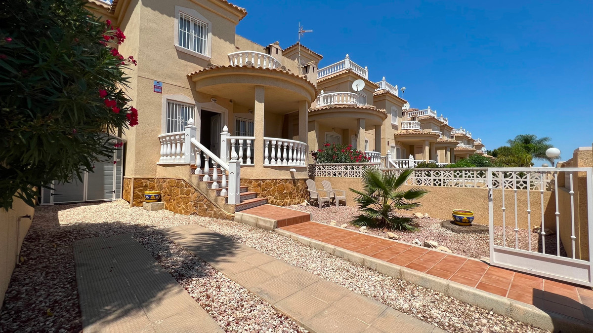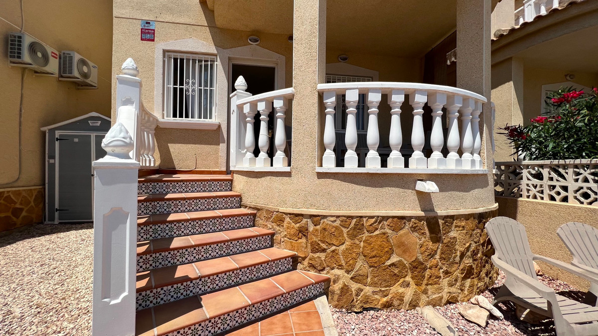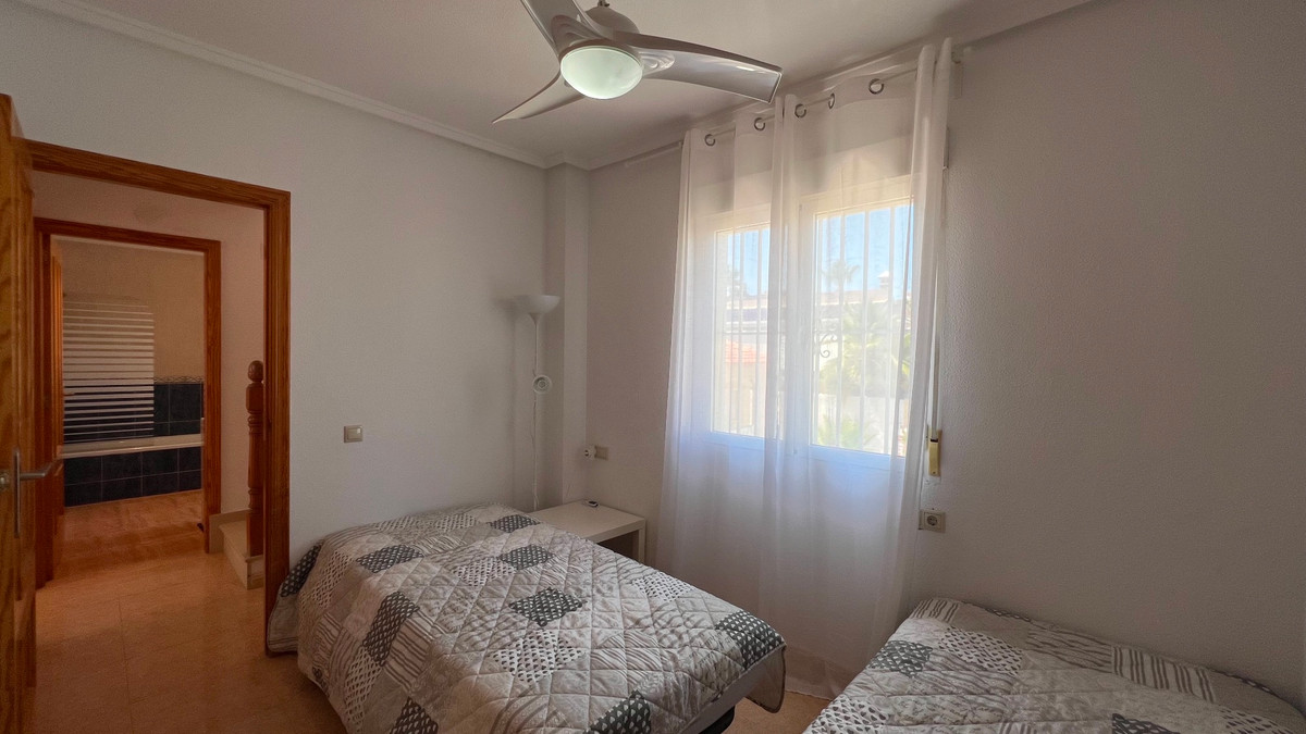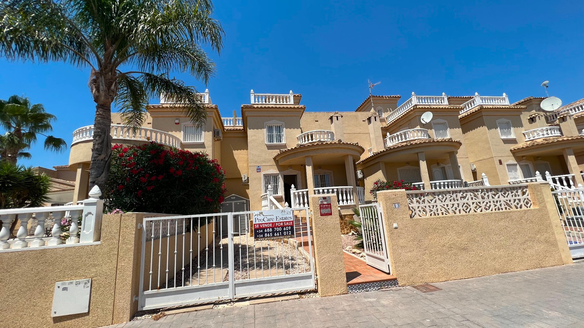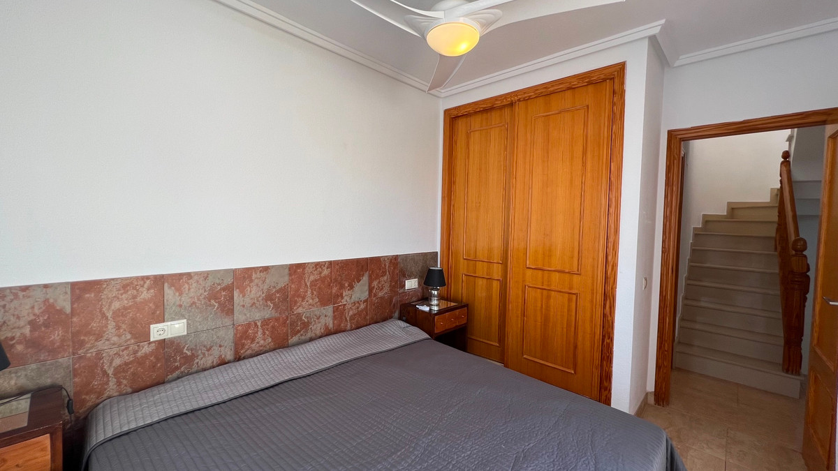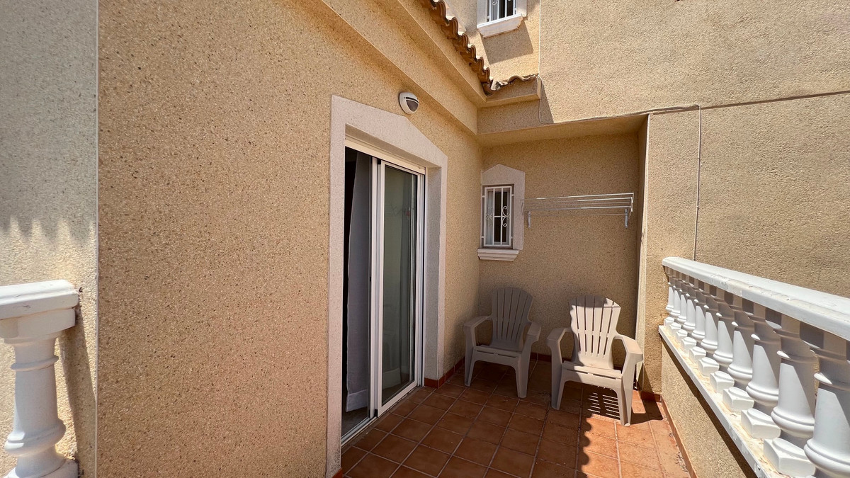 This is a charming townhouse in Cuidad Quesada. A nice and quiet urbanization with a communal swimming pool. There is room to park your car on the plot. Through the front garden you reach the terrace and the front door. The property is divided into 3 floors. On the ground floor you have a spacious living and dining room, equipped kitchen, bathroom, double bedroom and access to the backyard. On the first floor there is a spacious bathroom and two double bedrooms. Through the master bedroom you reach the balcony. On the 3rd floor is the solarium with beautiful views.