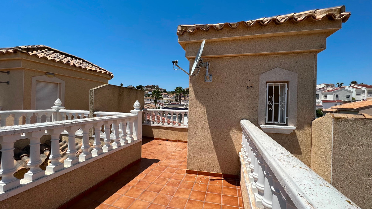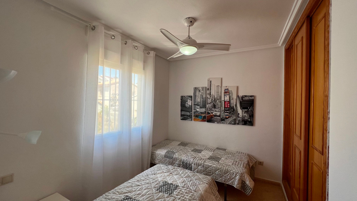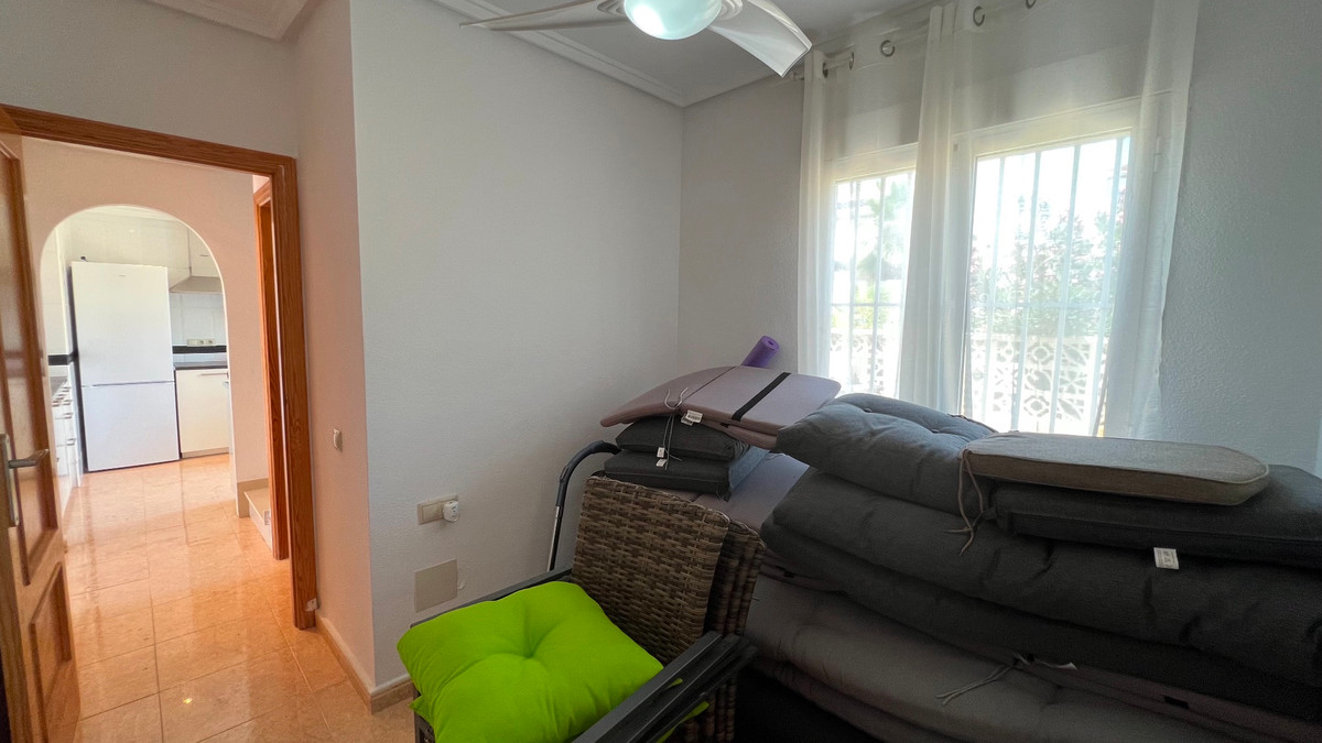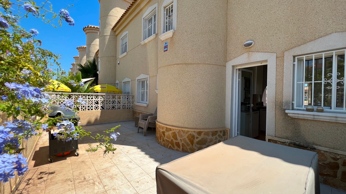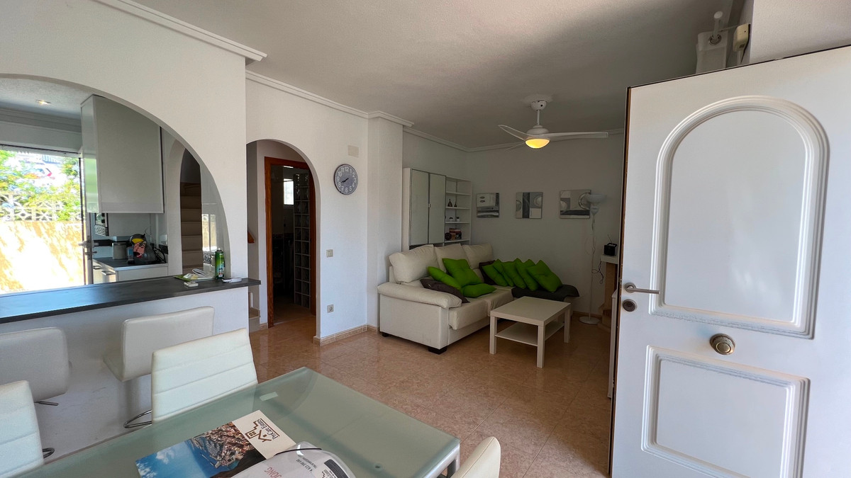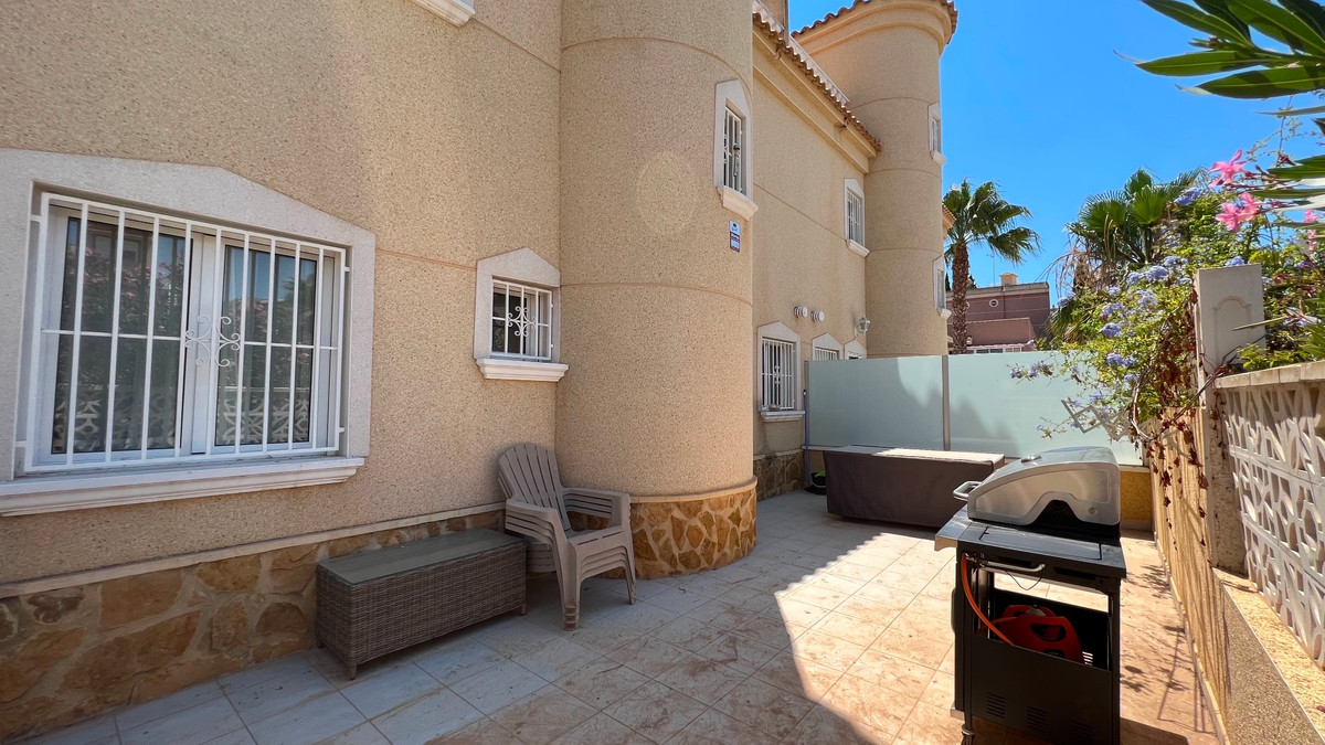 This is a charming townhouse in Cuidad Quesada. A nice and quiet urbanization with a communal swimming pool. There is room to park your car on the plot. Through the front garden you reach the terrace and the front door. The property is divided into 3 floors. On the ground floor you have a spacious living and dining room, equipped kitchen, bathroom, double bedroom and access to the backyard. On the first floor there is a spacious bathroom and two double bedrooms. Through the master bedroom you reach the balcony. On the 3rd floor is the solarium with beautiful views.