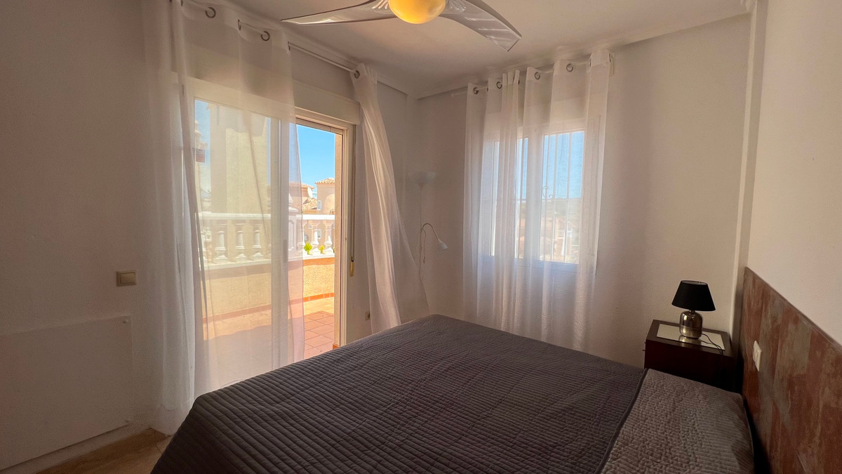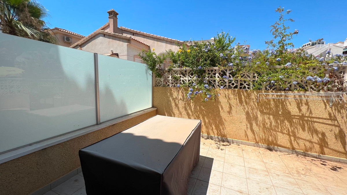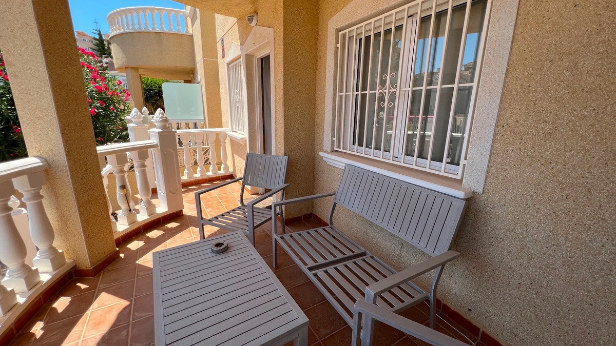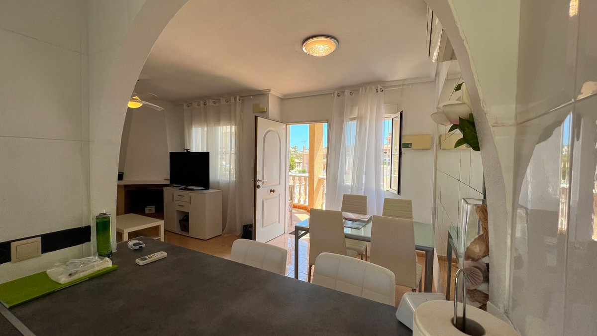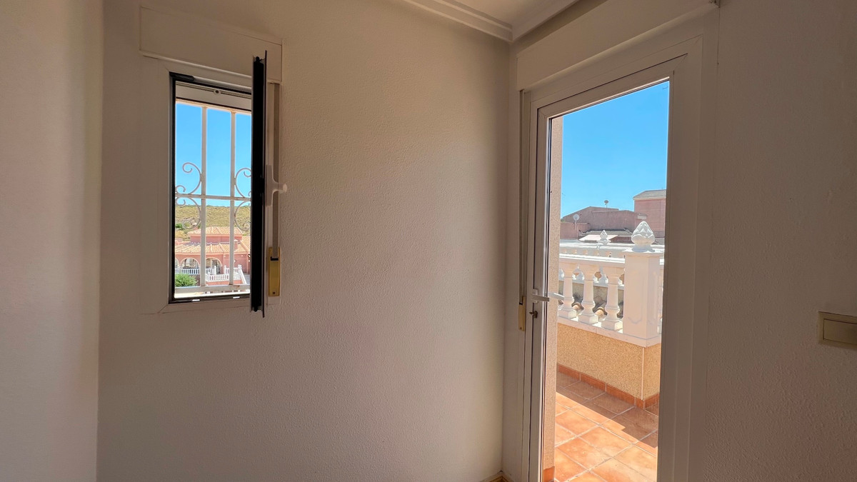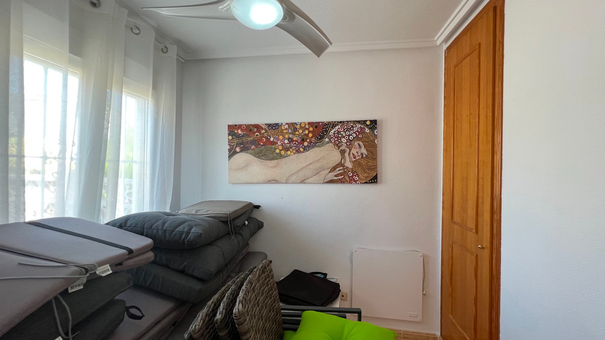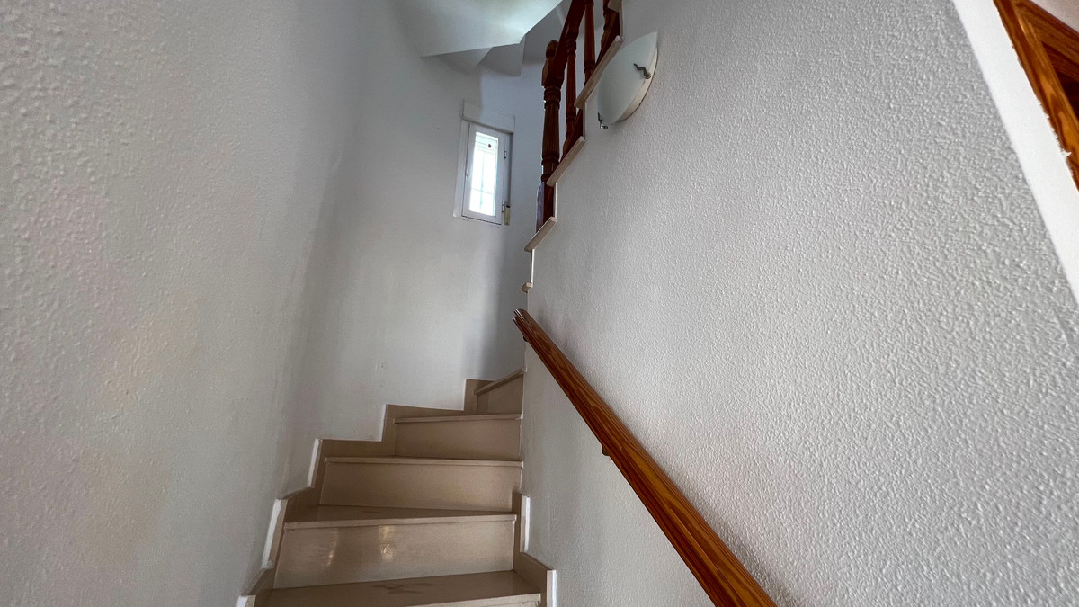 This is a charming townhouse in Cuidad Quesada. A nice and quiet urbanization with a communal swimming pool. There is room to park your car on the plot. Through the front garden you reach the terrace and the front door. The property is divided into 3 floors. On the ground floor you have a spacious living and dining room, equipped kitchen, bathroom, double bedroom and access to the backyard. On the first floor there is a spacious bathroom and two double bedrooms. Through the master bedroom you reach the balcony. On the 3rd floor is the solarium with beautiful views.