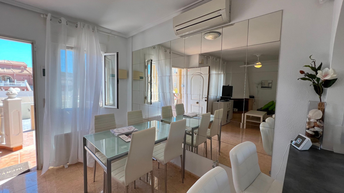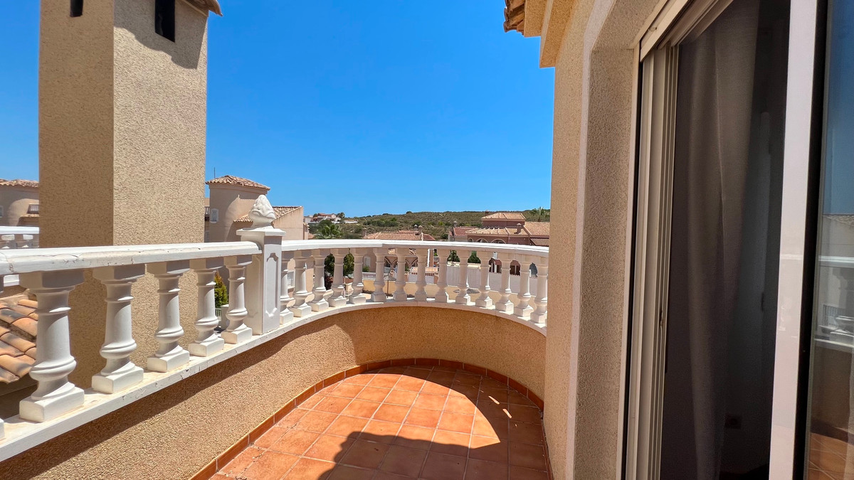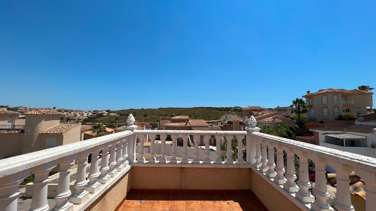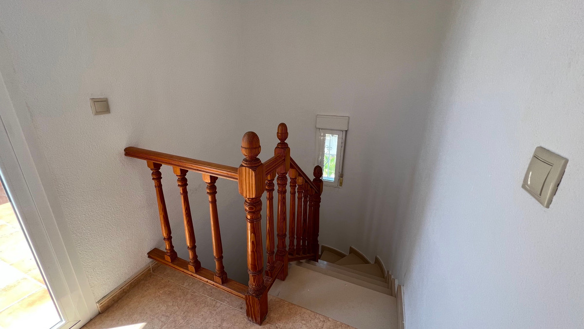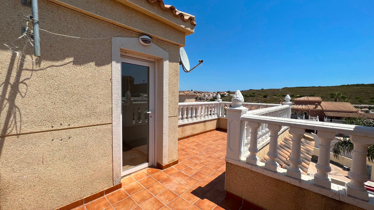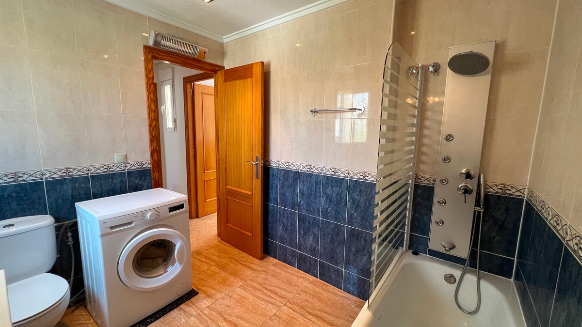 This is a charming townhouse in Cuidad Quesada. A nice and quiet urbanization with a communal swimming pool. There is room to park your car on the plot. Through the front garden you reach the terrace and the front door. The property is divided into 3 floors. On the ground floor you have a spacious living and dining room, equipped kitchen, bathroom, double bedroom and access to the backyard. On the first floor there is a spacious bathroom and two double bedrooms. Through the master bedroom you reach the balcony. On the 3rd floor is the solarium with beautiful views.