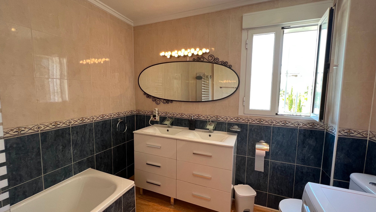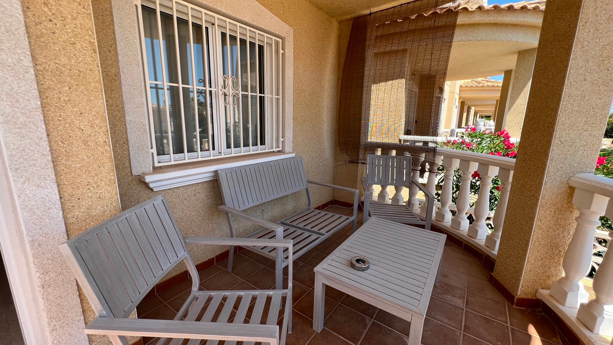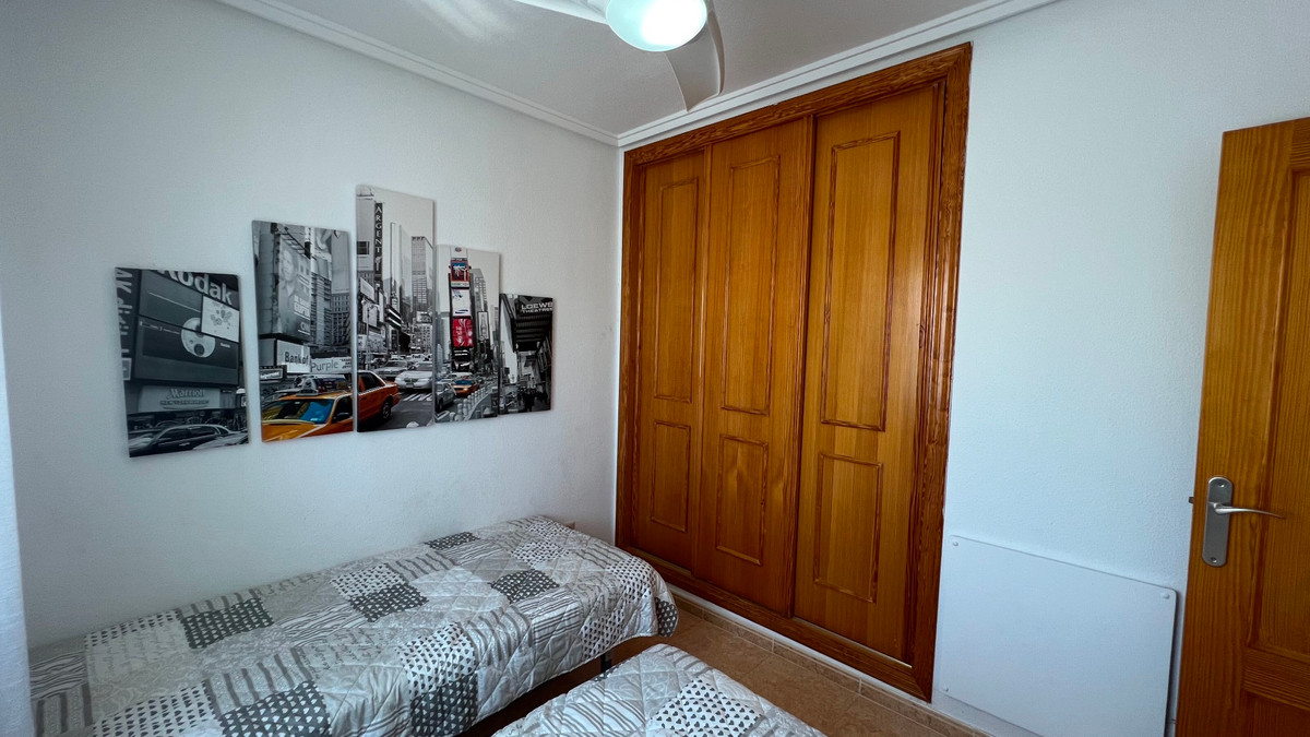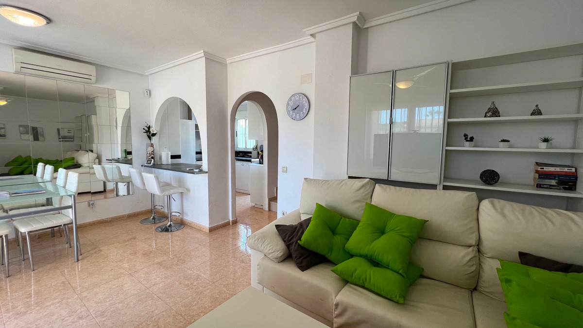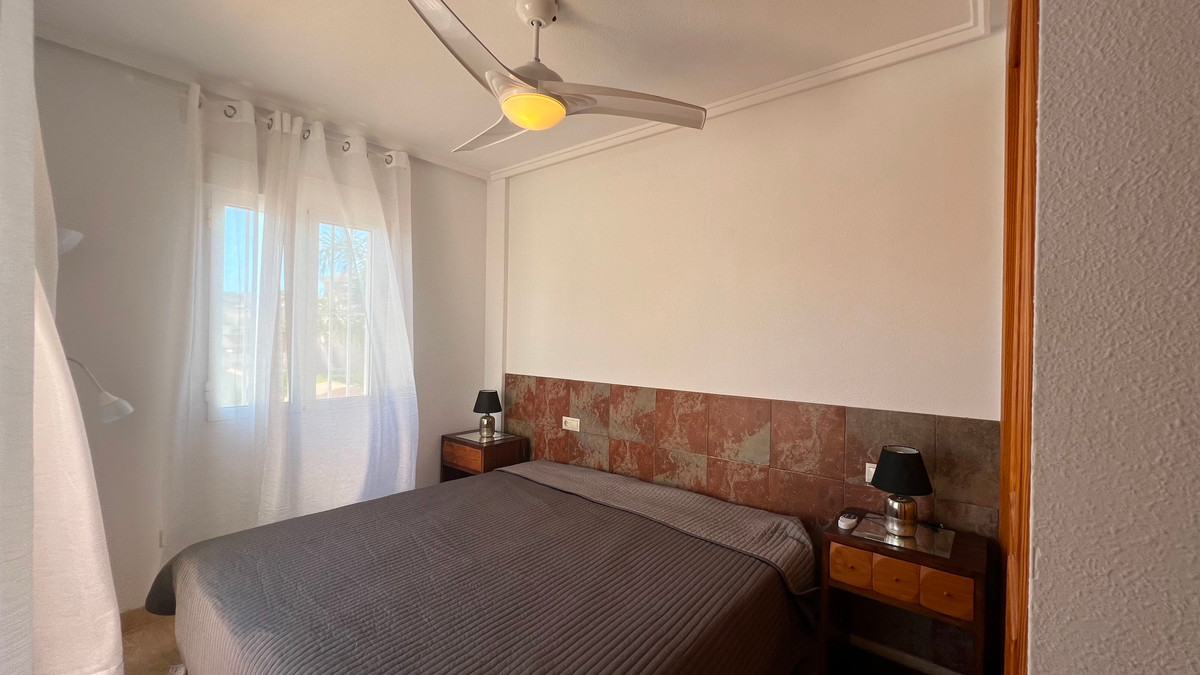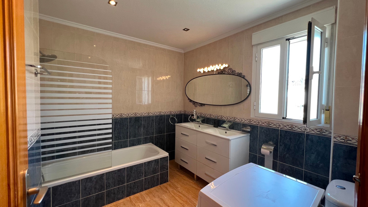 This is a charming townhouse in Cuidad Quesada. A nice and quiet urbanization with a communal swimming pool. There is room to park your car on the plot. Through the front garden you reach the terrace and the front door. The property is divided into 3 floors. On the ground floor you have a spacious living and dining room, equipped kitchen, bathroom, double bedroom and access to the backyard. On the first floor there is a spacious bathroom and two double bedrooms. Through the master bedroom you reach the balcony. On the 3rd floor is the solarium with beautiful views.