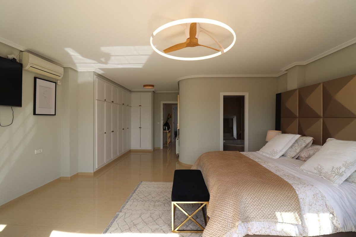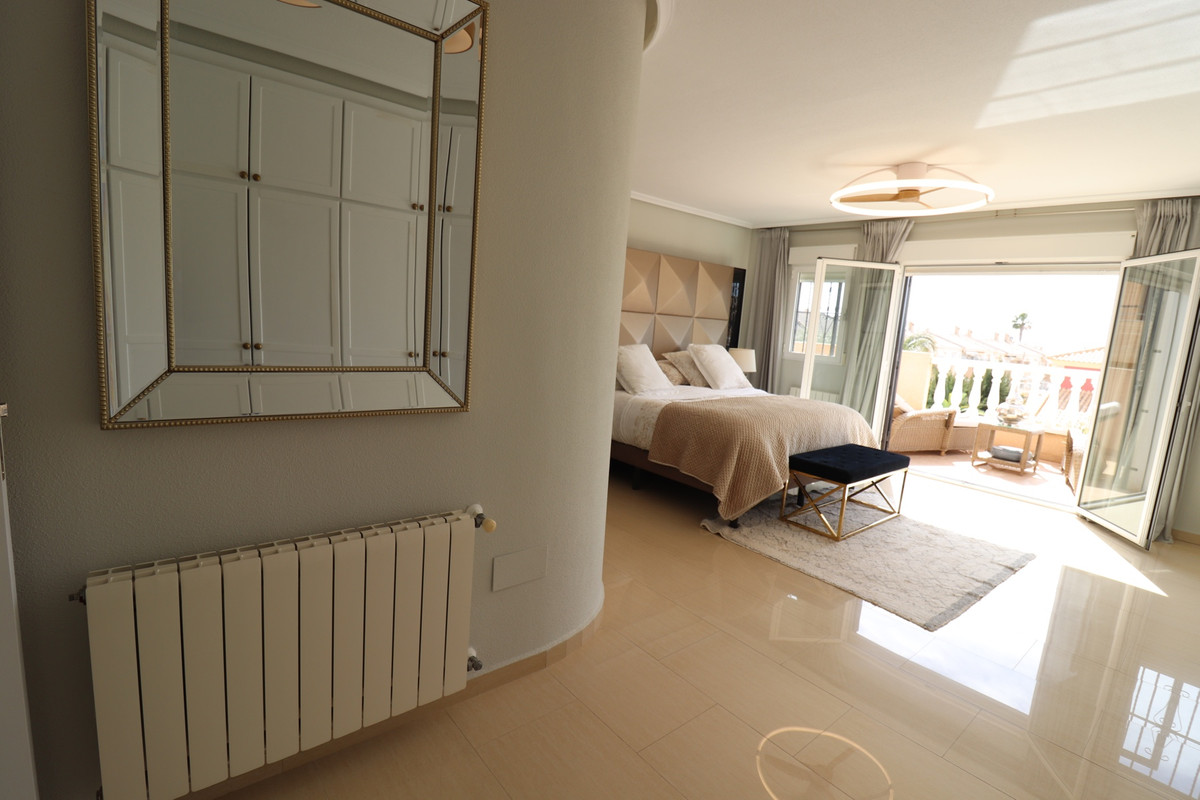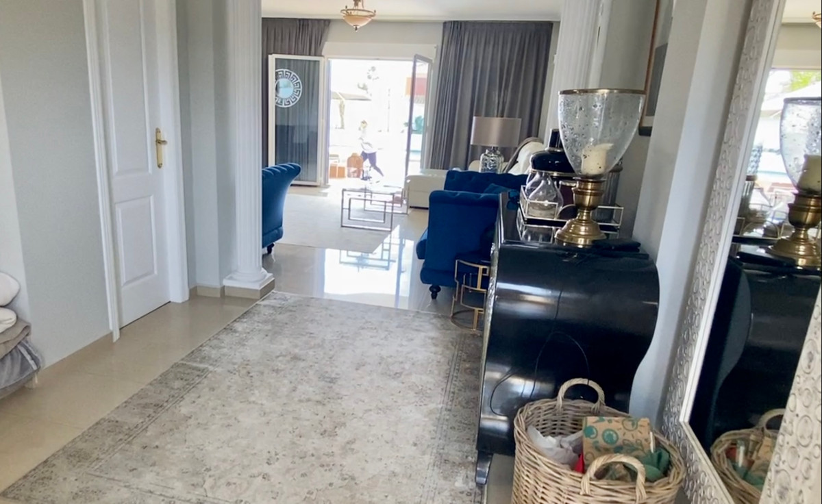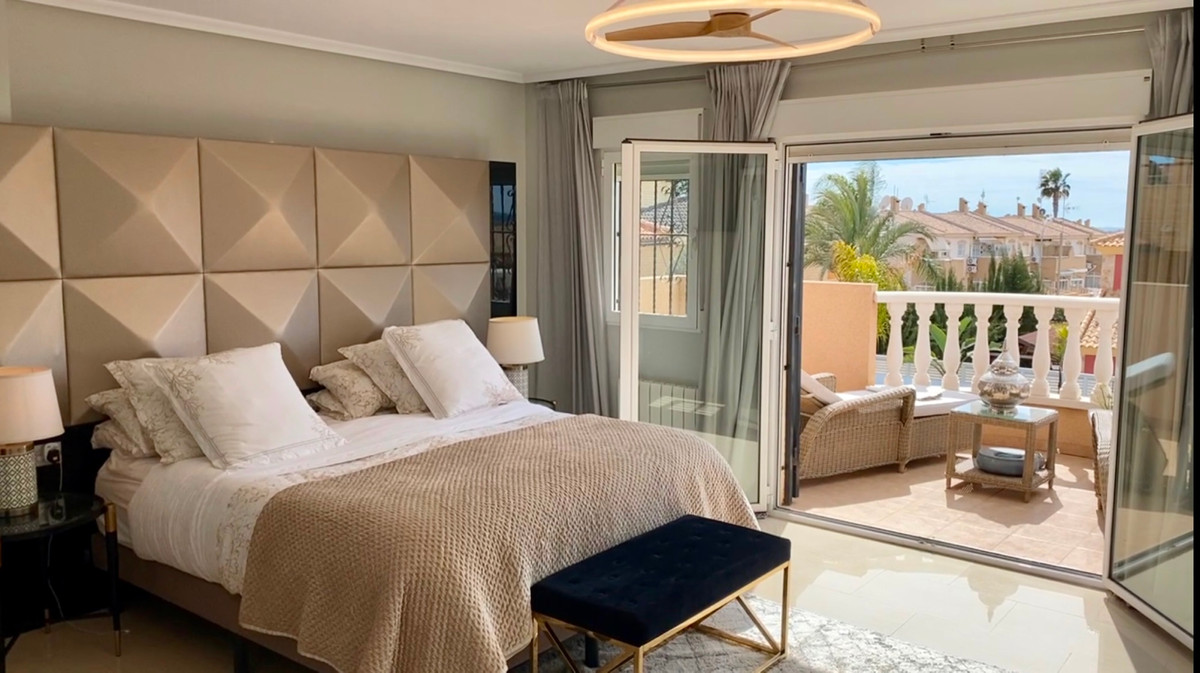 The first floor has 2 spacious bedrooms. When you enter the master bedroom it feels like a luxury suite of a hotel, it has a huge wardrobe, a private terrace overlooking the pool and a luxurious ensuite bathroom. The second bedroom is also royal in size and also offers access to a private terrace and a separate bathroom. On the second floor you will find a spacious solarium with breathtaking views. The solarium can be reached via an internal staircase. The ground floor can be accessed both from the inside and via a separate access to the left of the house. On this floor there are 2 bedrooms, 1 bathroom, a living room and a kitchen. This space is therefore extremely suitable for receiving guests as extra rental income.