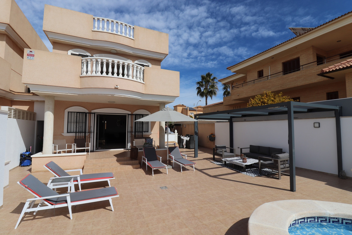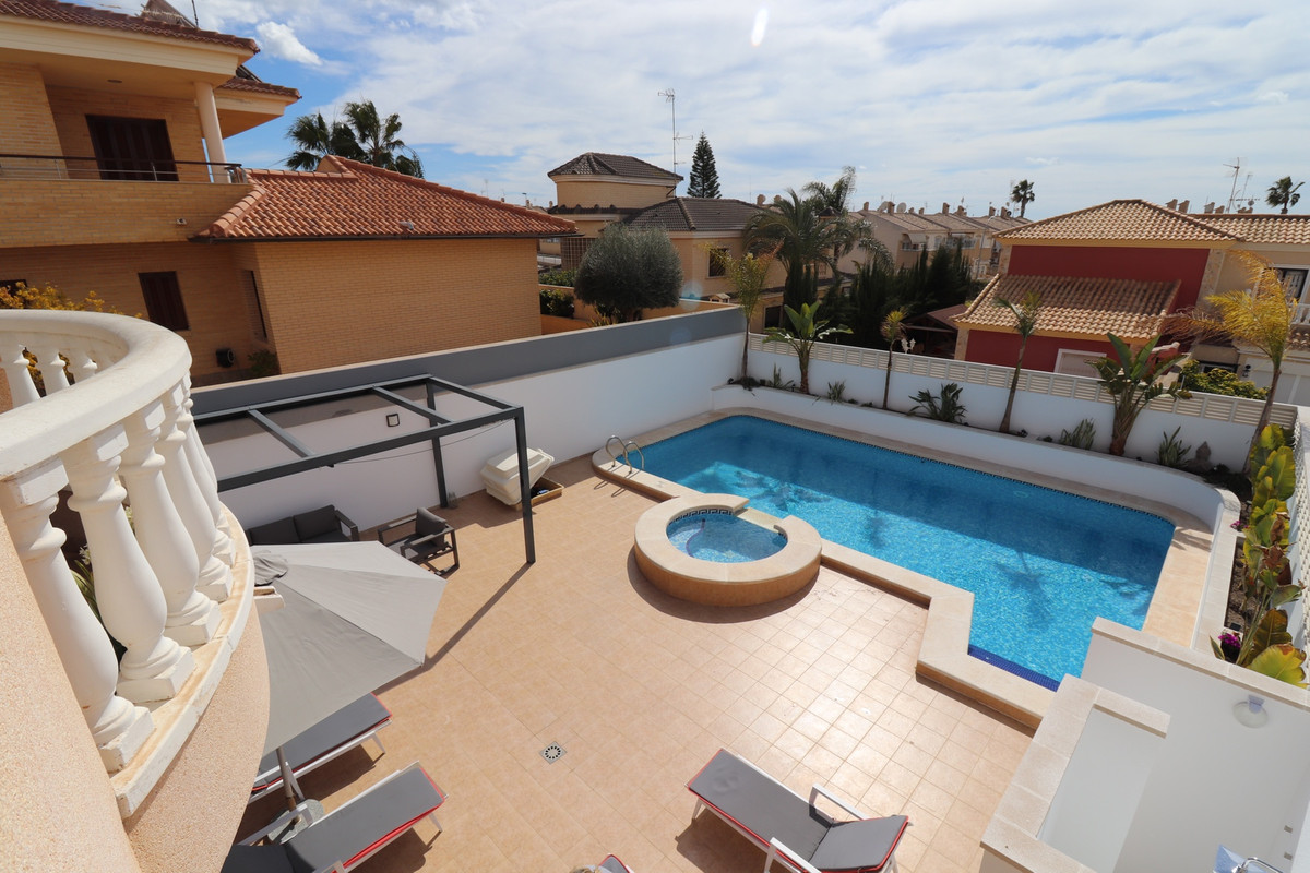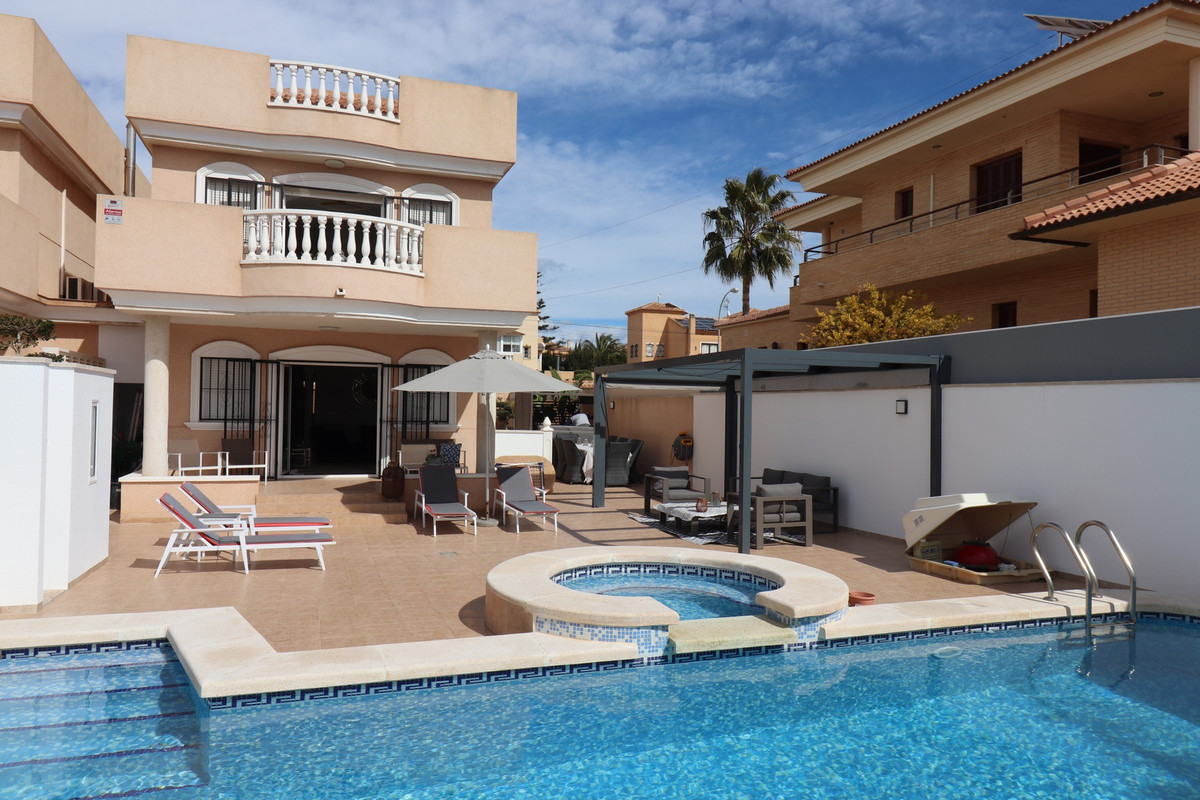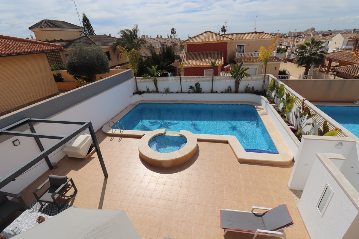 We are proud to present this beautiful villa with 4 bedrooms and 3 bathrooms distributed over 2 floors with large private pool 12 x 8 with jacuzzi for sale in Torrevieja close to the beach