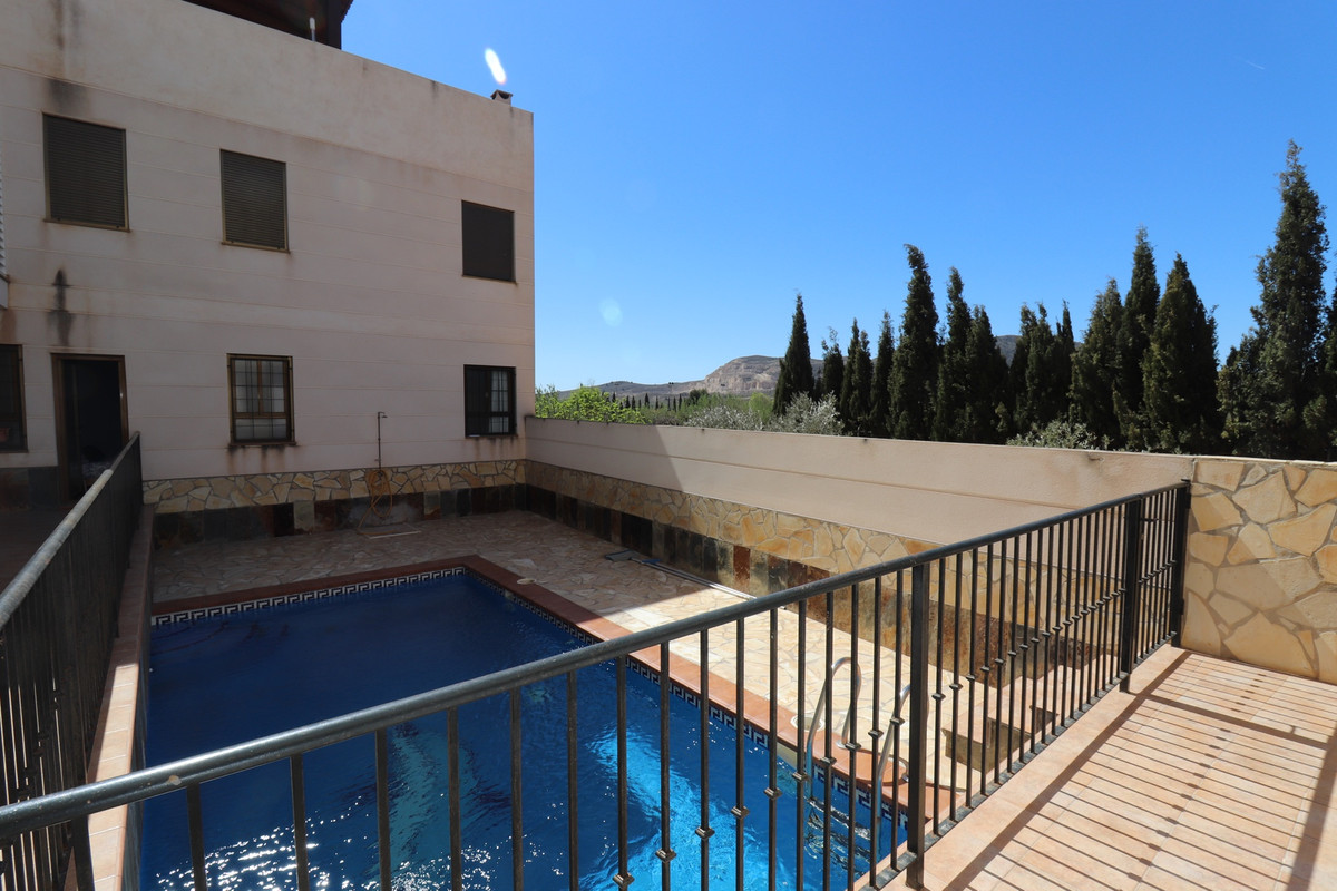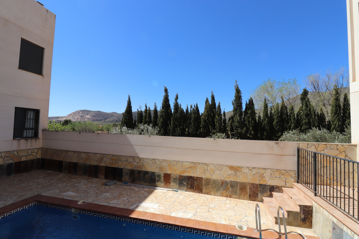 The apartment has 3 bedrooms and 2 bathrooms, 1 ensuite in the master bedroom and wrong   in excellent condition. The living room is spacious with an American open kitchen. The bedrooms and bathrooms are situated on the right side through a long corridor. From one bedroom you can reach the patio and also the communal swimming pool with beautiful views of the mountains. within walking distance is a grocery shop where you can do the necessary shopping and there are 3 restaurants in the area. Doctors, pharmacies etc can be found a short distance away in Hondon de las Nieves and Frailes. On the right side of the house is a park where you can enjoy BBQ and outdoor sports. Things are regularly organized in the typical Spanish village. Alicante airport can be reached within 35 minutes. An underground parking garage belongs to the apartment. The complex is also well maintained. If you want to relax and enjoy Spanish life, this apartment can offer you a lot. Book your viewing with us now!