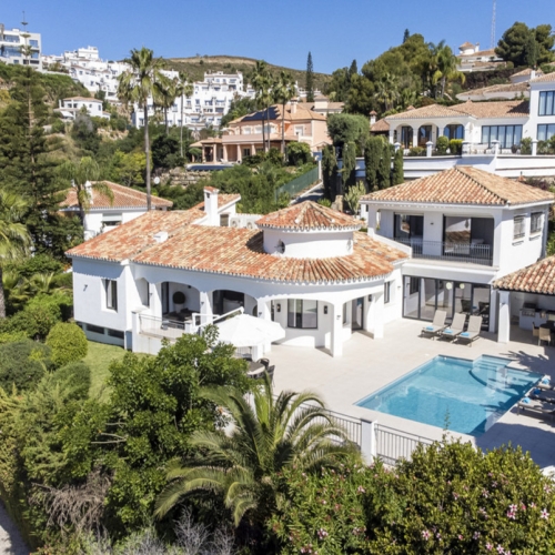 Helt ny ejendom til salg i Paraiso Alto, der vil være klar til dig ved udgangen af 2023. Villaen har et dynamisk design med et åbent plan koncept, geometriske former og rene linjer af stil. Huset tilbyder seks soveværelser, seks badeværelser, gæstetoilet, stor stue og spisestue, et fuldt udstyret amerikansk stil køkken med høj kvalitet apparater. På nederste etage vil det være muligt at have en vinkælder, et wellnessområde med fitnesscenter, spa og sauna. Villaen har store vinduer med dobbelt højdelofter og glasdøre vil give dig en fantastisk følelse af lys og lethed. Den imponerende pool med vandfald vil blive dækket med en speciel sten fra Indonesien, der renser vandet. Et automatisk vandingssystem vil blive installeret i haven. Huset tilbyder også - et gæsteværelse, vaskeri, et spisekammer og påklædningsværelse, elevator, studio, separat gæstetoilet og en privat garage, der vil rumme tre af dine biler. Faciliteter inkluderer en digital video intercom, aircondition og gulvvarme, Smart Home, en unik glas pejs, indbyggede garderobeskabe og mere. Villaen ligger i den eksklusive boligkompleks "El Paraiso Alto" omgivet af flere golfbaner, ligger i den rolige dal El Paraiso.