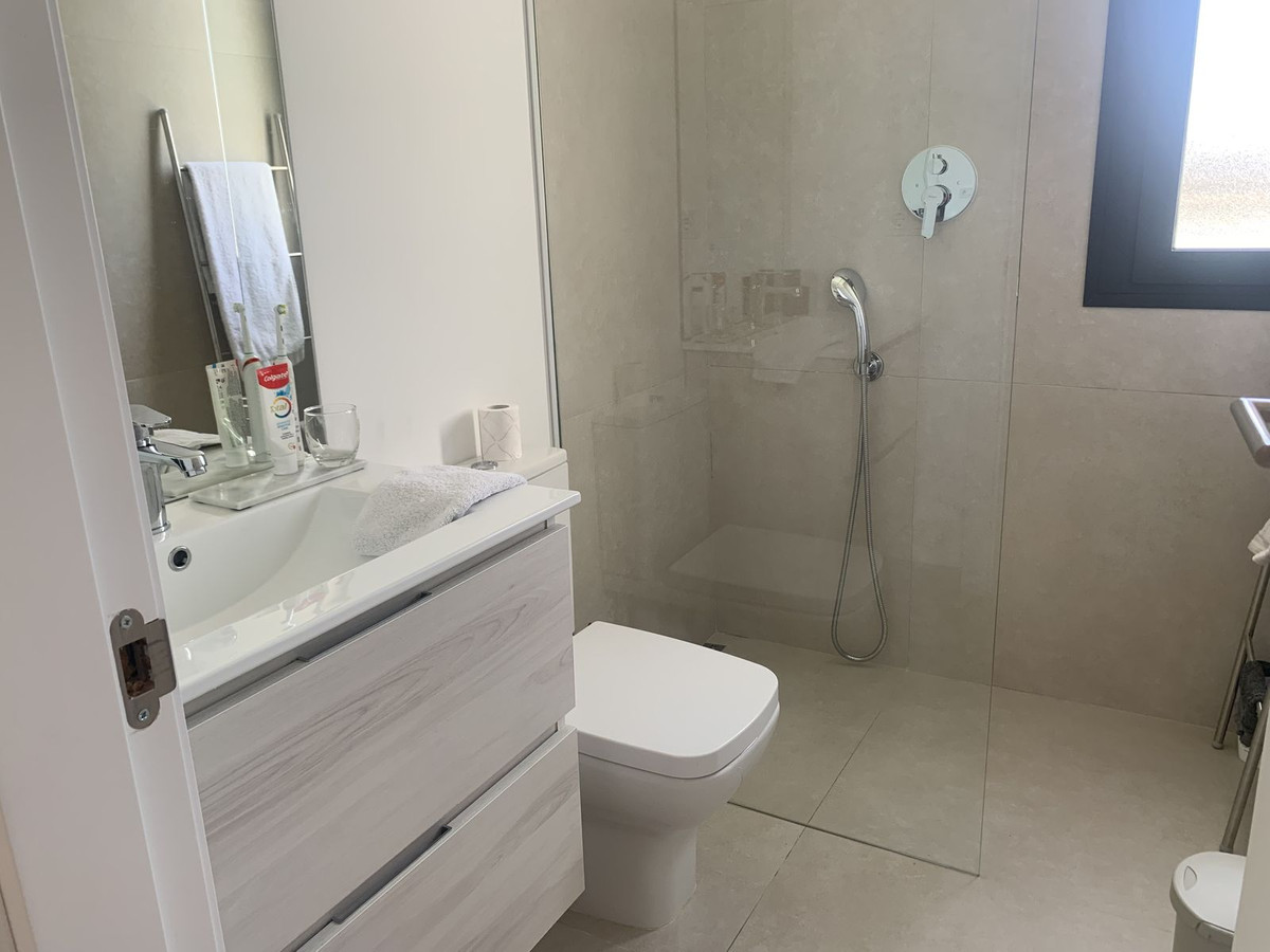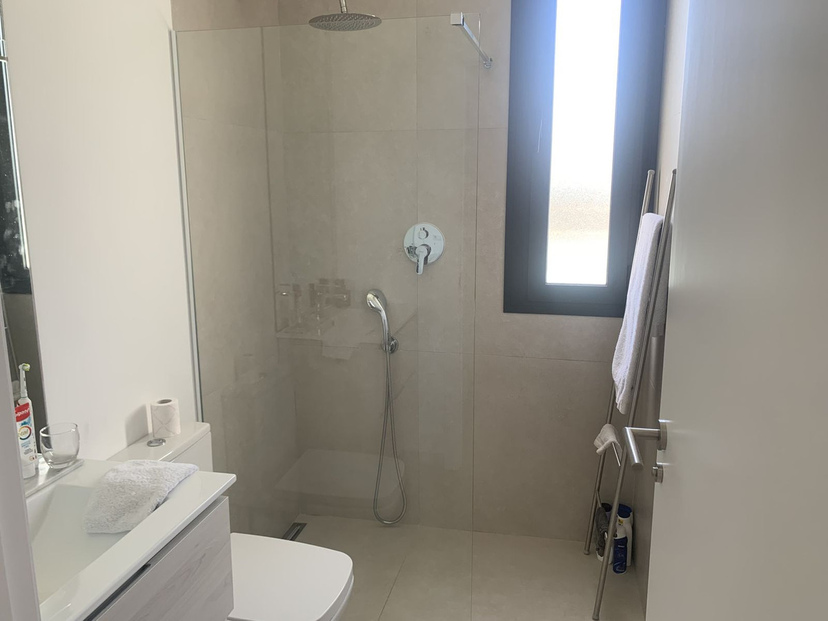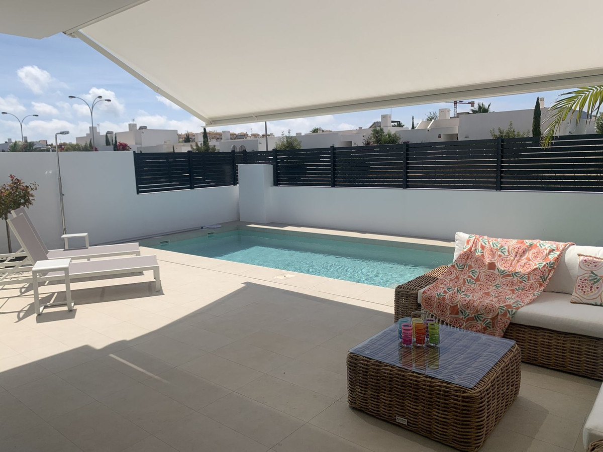 We are delighted to offer exclusively this stunning villa which is almost new and only 500 metres to the beach. The property is only 5 months old and sadly the owners are relocating due to unforeseen circumstances. The owners have added many extras from the original build. The property is L shaped, has 3 bedrooms and 2 bathrooms, a beautiful open plan living area, a huge solarium and a large front south facing terrace where you find the pool and a rear north facing terrace for a cooler dining area for those hot summer nights.