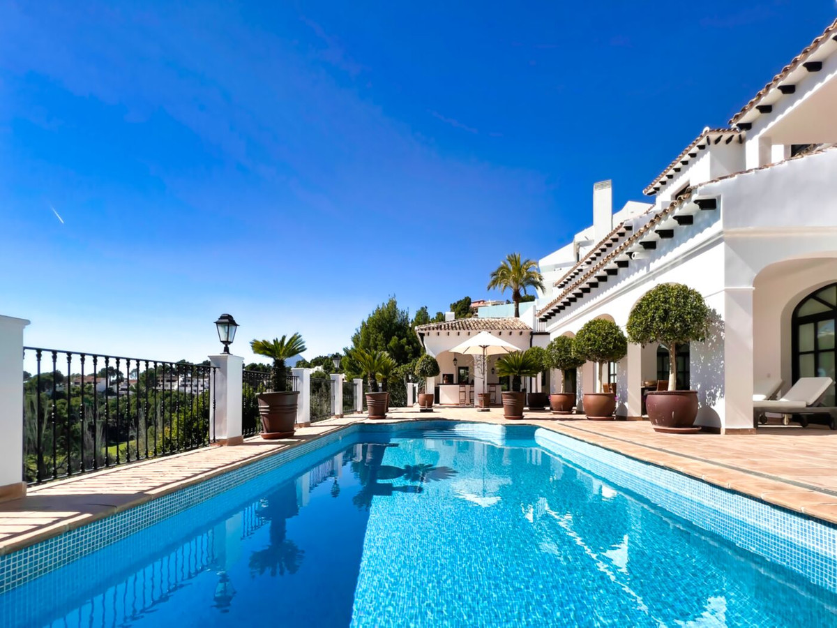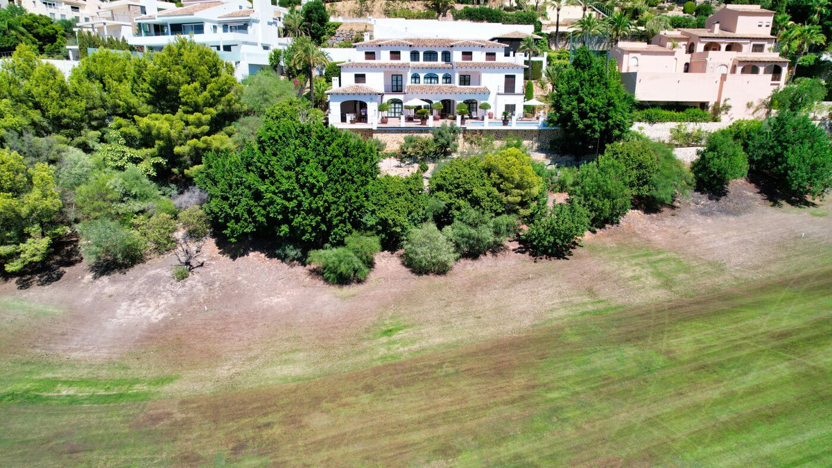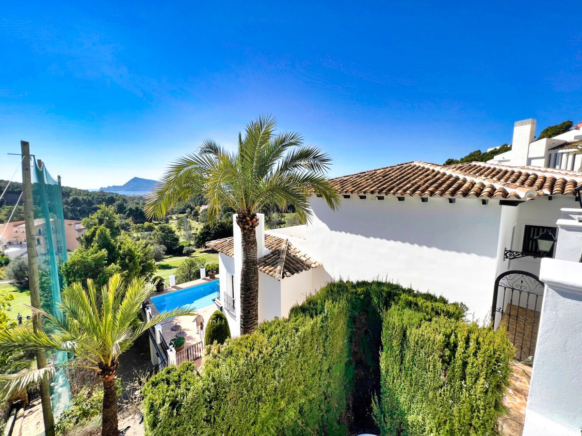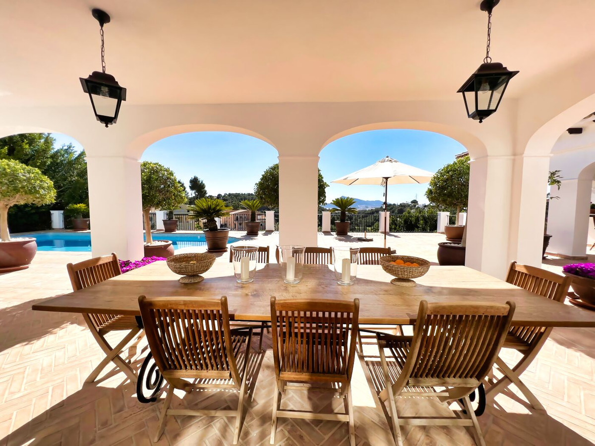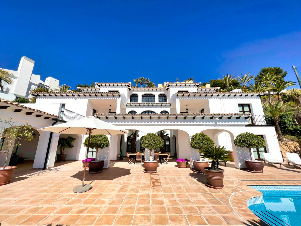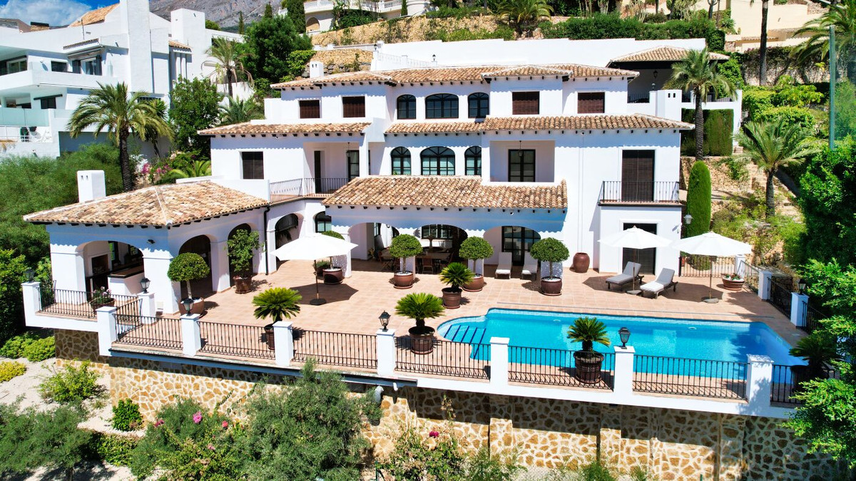 This impressive mediterranean villa was built in one of the most exclusive residential areas of Altea right by the Don Cayo Golf club. The villa can be accessed via en electric gate leading down to the parking area for two cars. The mansion is accessed on the top floor with its 4 bedrooms and 2 bathrooms and the grand staircase leading down to the middle and ground floor. In the center of the villa is the master bedroom with en-suite batroom and dressing room on one side and another large bedroom, again with en-suite bathroom and walk in wardrobe. Going further down the staircase we get to the large hall were on the one side of it we find the large living room and on the other side, the dining room, kitchen, guest toilet and utility room. All of the rooms on the ground floor lead outside to the large terrace with its beautiful veranda and outside dining area and bar just by the swimming pool.