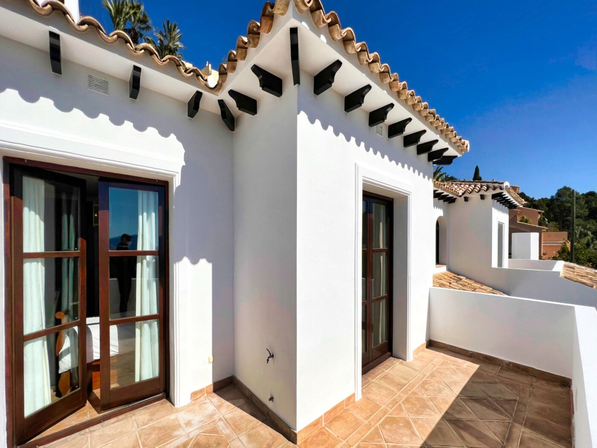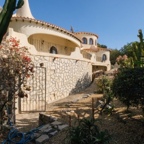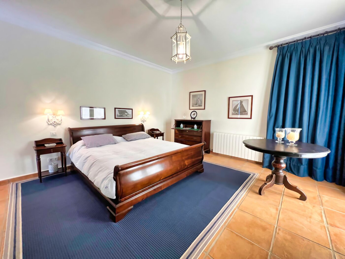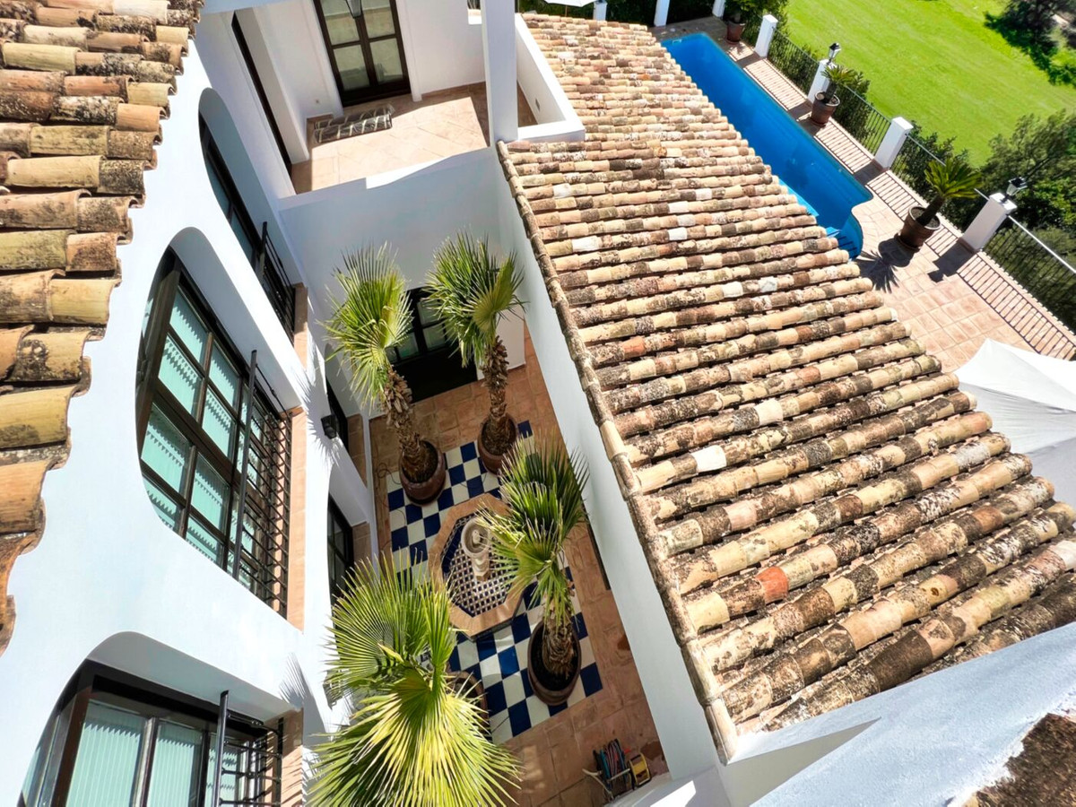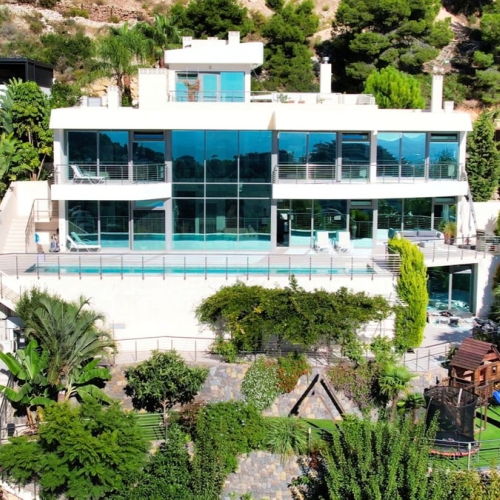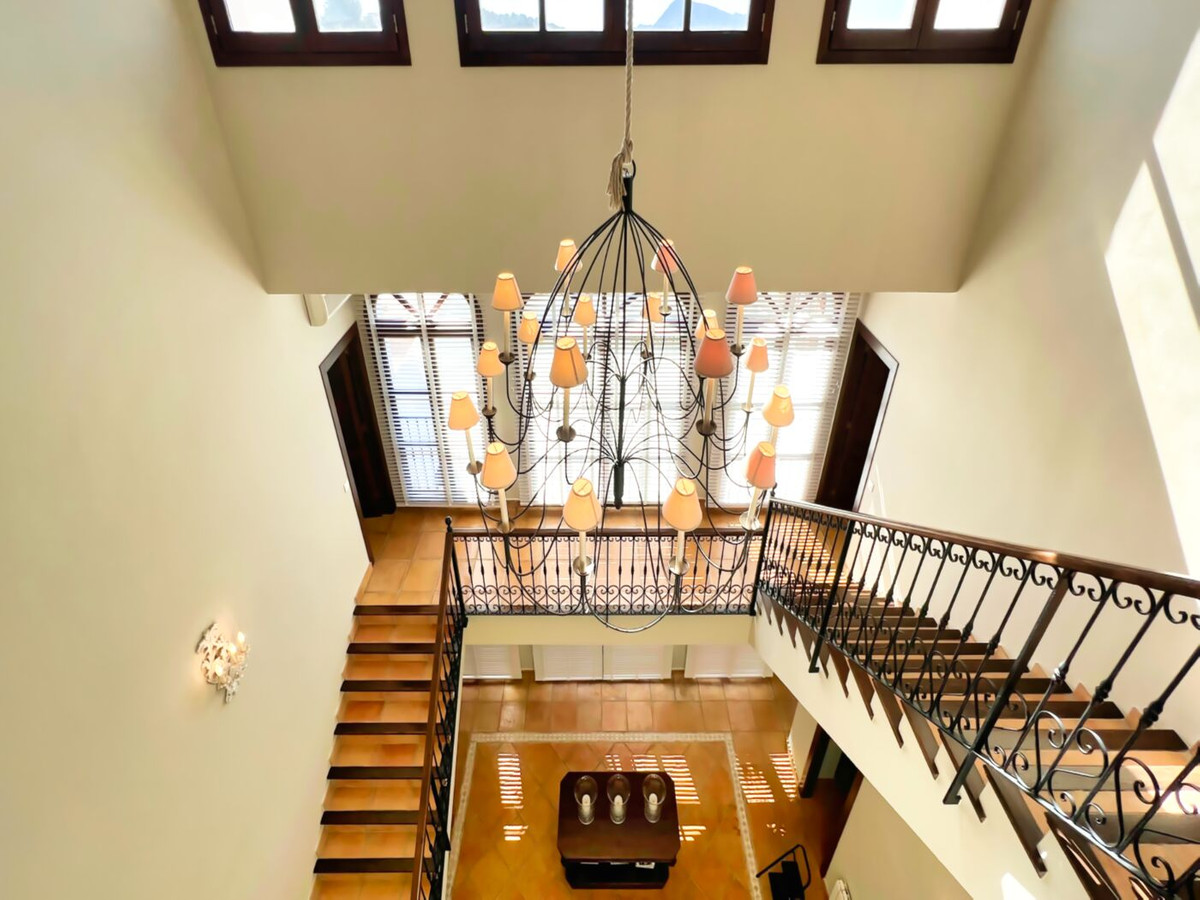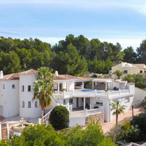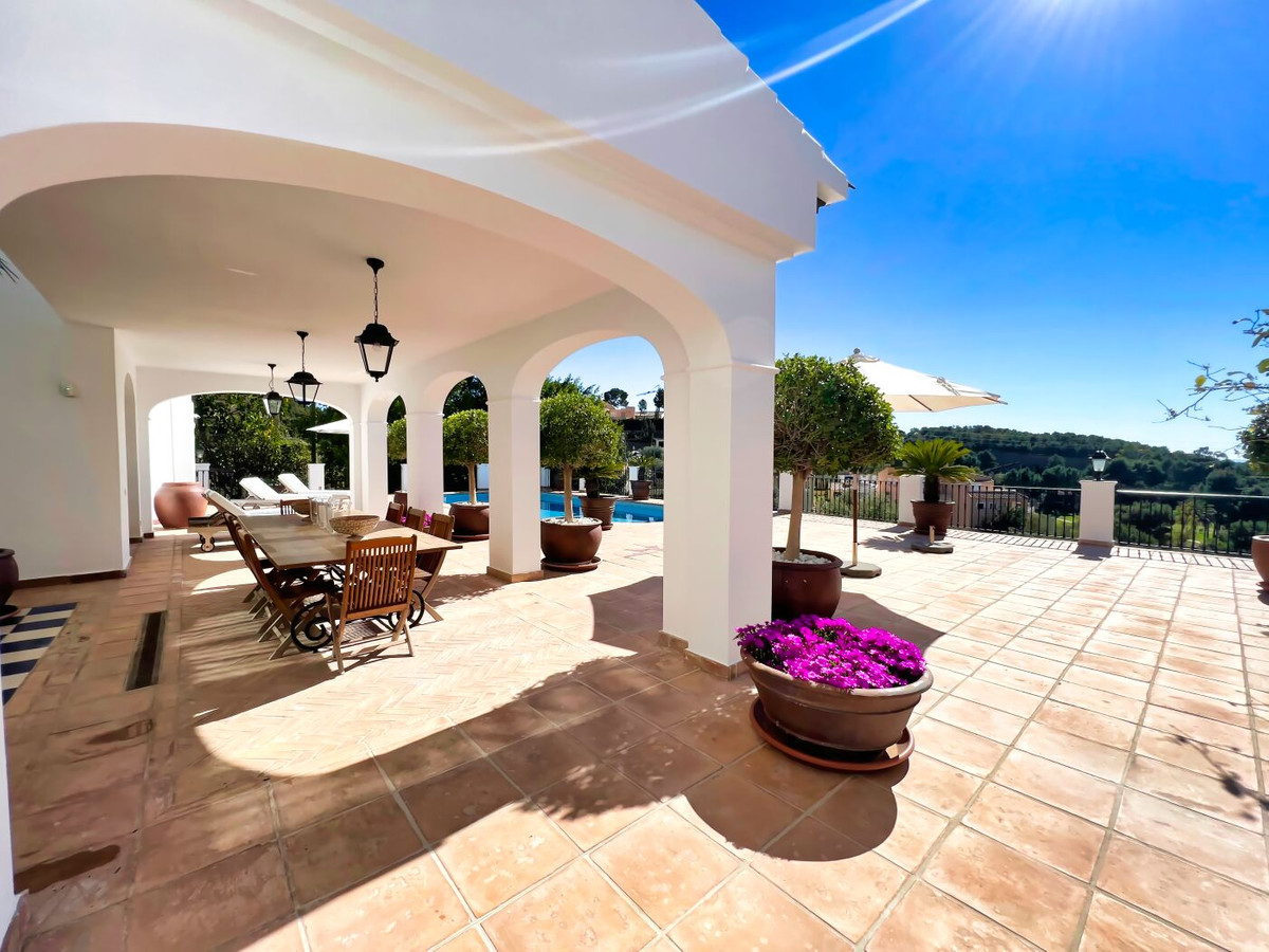 This impressive mediterranean villa was built in one of the most exclusive residential areas of Altea right by the Don Cayo Golf club. The villa can be accessed via en electric gate leading down to the parking area for two cars. The mansion is accessed on the top floor with its 4 bedrooms and 2 bathrooms and the grand staircase leading down to the middle and ground floor. In the center of the villa is the master bedroom with en-suite batroom and dressing room on one side and another large bedroom, again with en-suite bathroom and walk in wardrobe. Going further down the staircase we get to the large hall were on the one side of it we find the large living room and on the other side, the dining room, kitchen, guest toilet and utility room. All of the rooms on the ground floor lead outside to the large terrace with its beautiful veranda and outside dining area and bar just by the swimming pool.