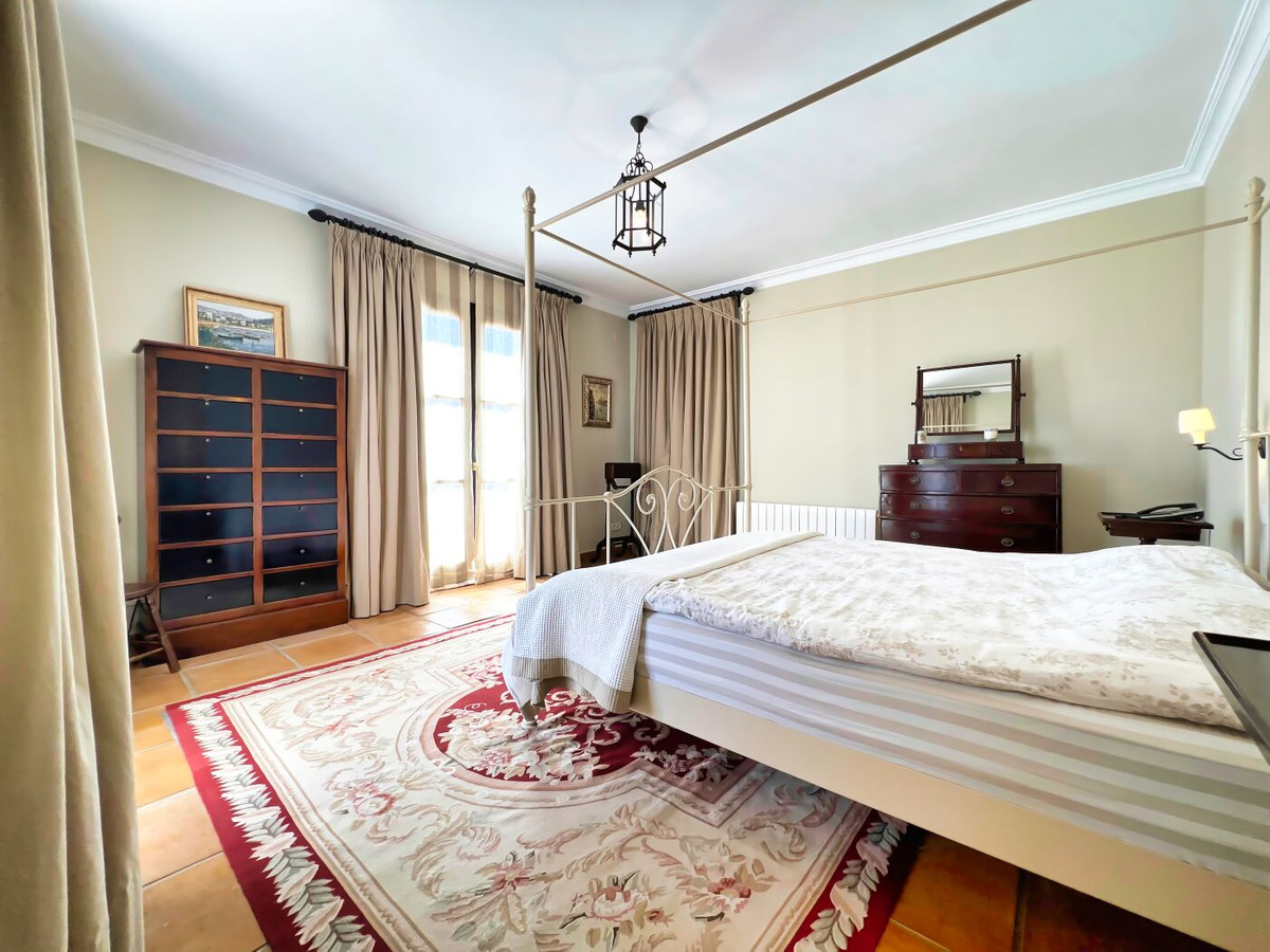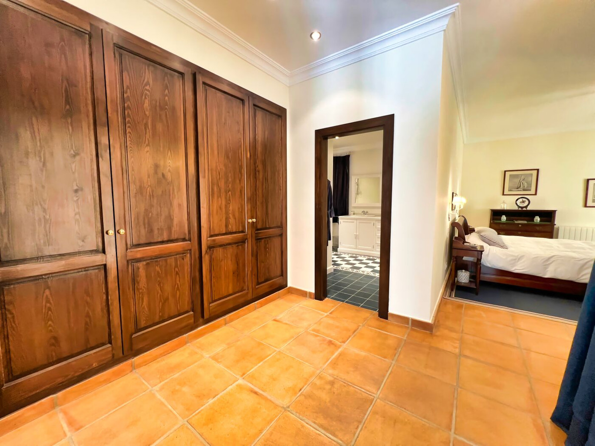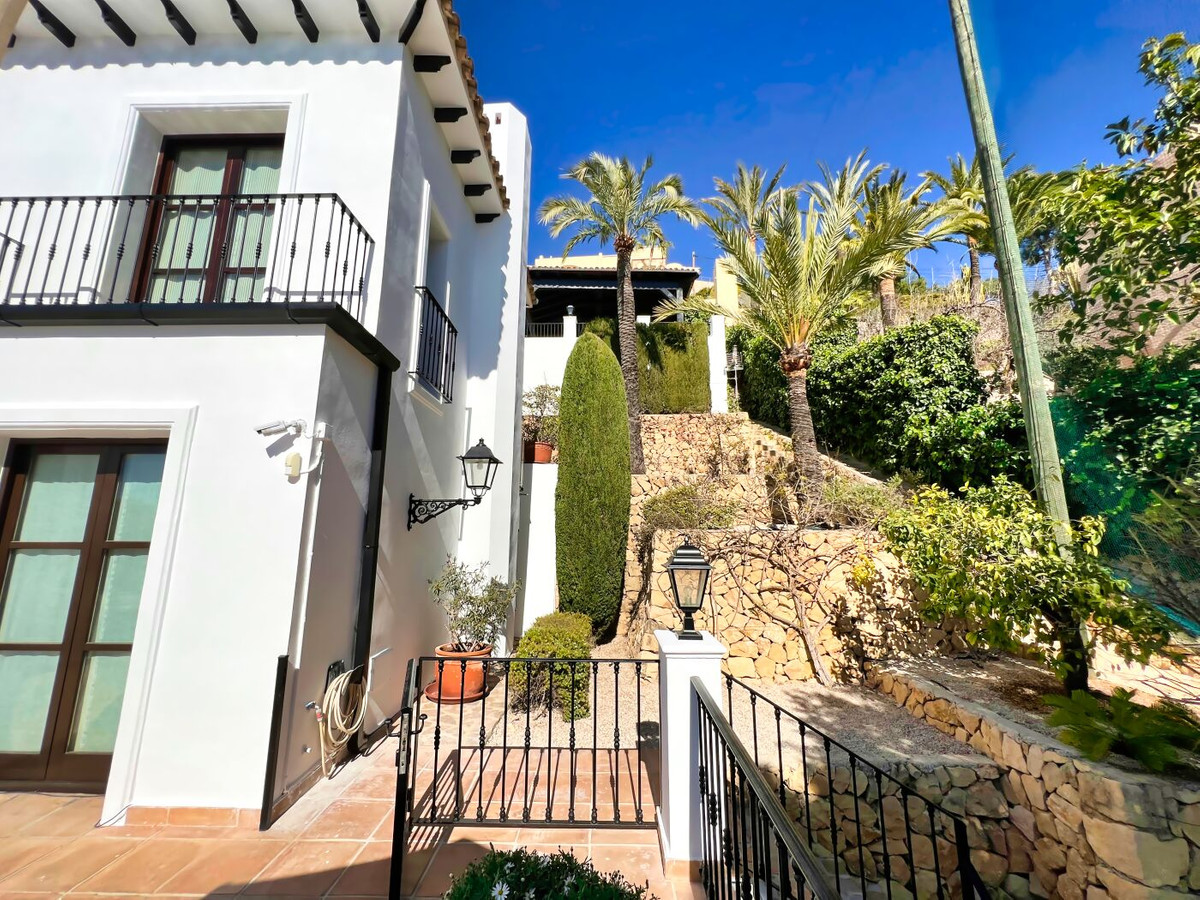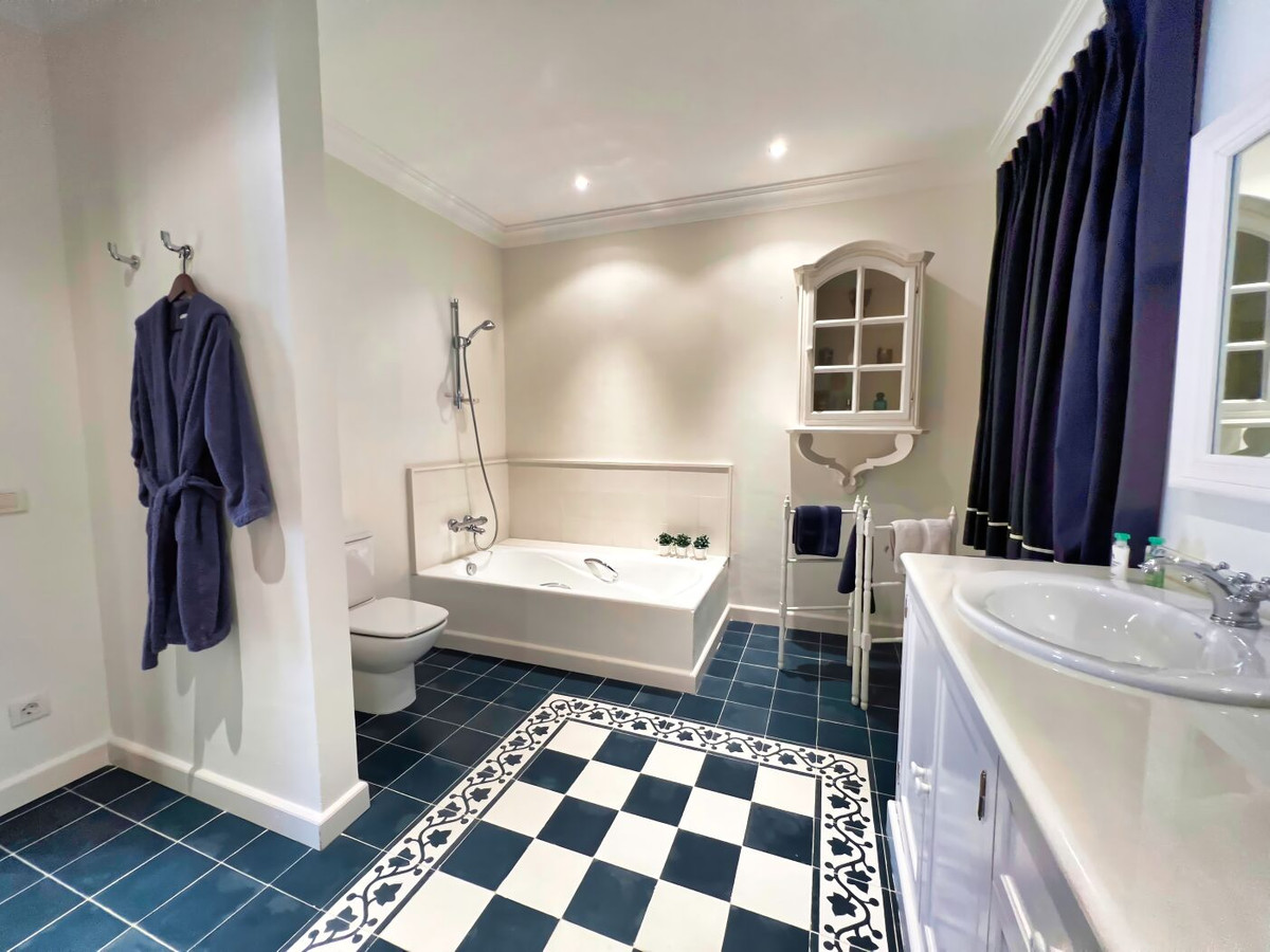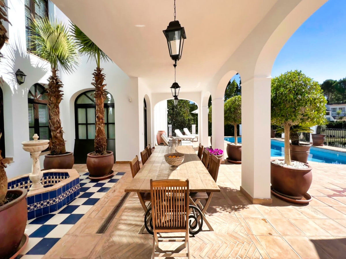 This impressive mediterranean villa was built in one of the most exclusive residential areas of Altea right by the Don Cayo Golf club. The villa can be accessed via en electric gate leading down to the parking area for two cars. The mansion is accessed on the top floor with its 4 bedrooms and 2 bathrooms and the grand staircase leading down to the middle and ground floor. In the center of the villa is the master bedroom with en-suite batroom and dressing room on one side and another large bedroom, again with en-suite bathroom and walk in wardrobe. Going further down the staircase we get to the large hall were on the one side of it we find the large living room and on the other side, the dining room, kitchen, guest toilet and utility room. All of the rooms on the ground floor lead outside to the large terrace with its beautiful veranda and outside dining area and bar just by the swimming pool.