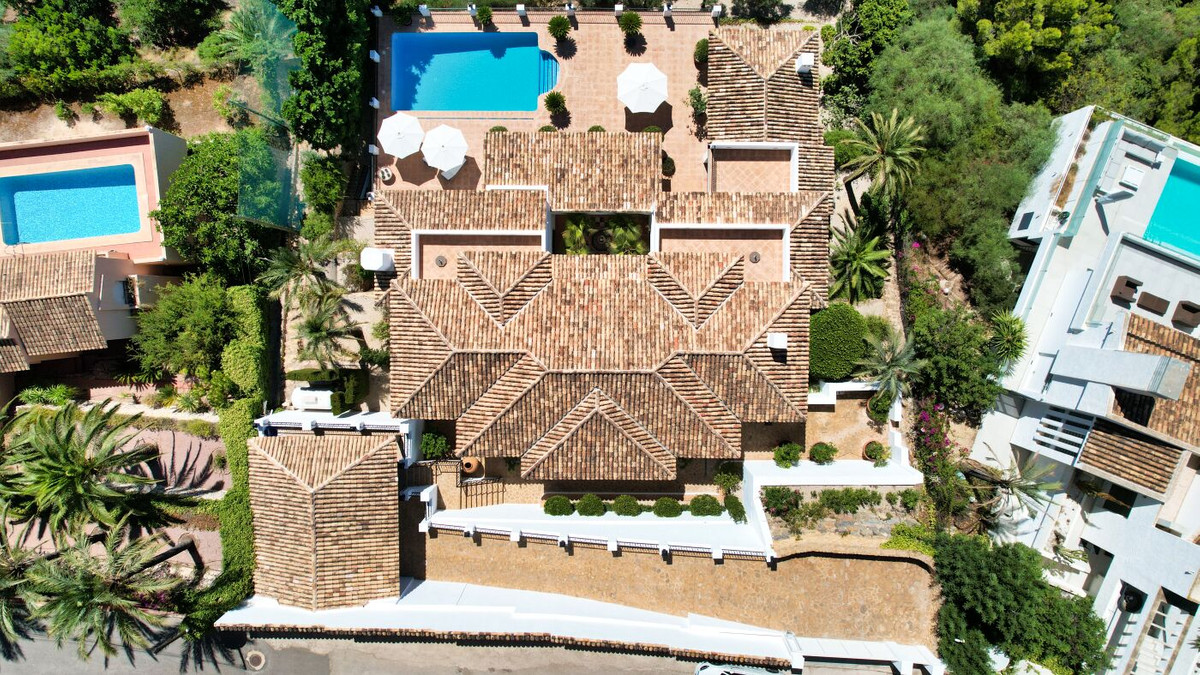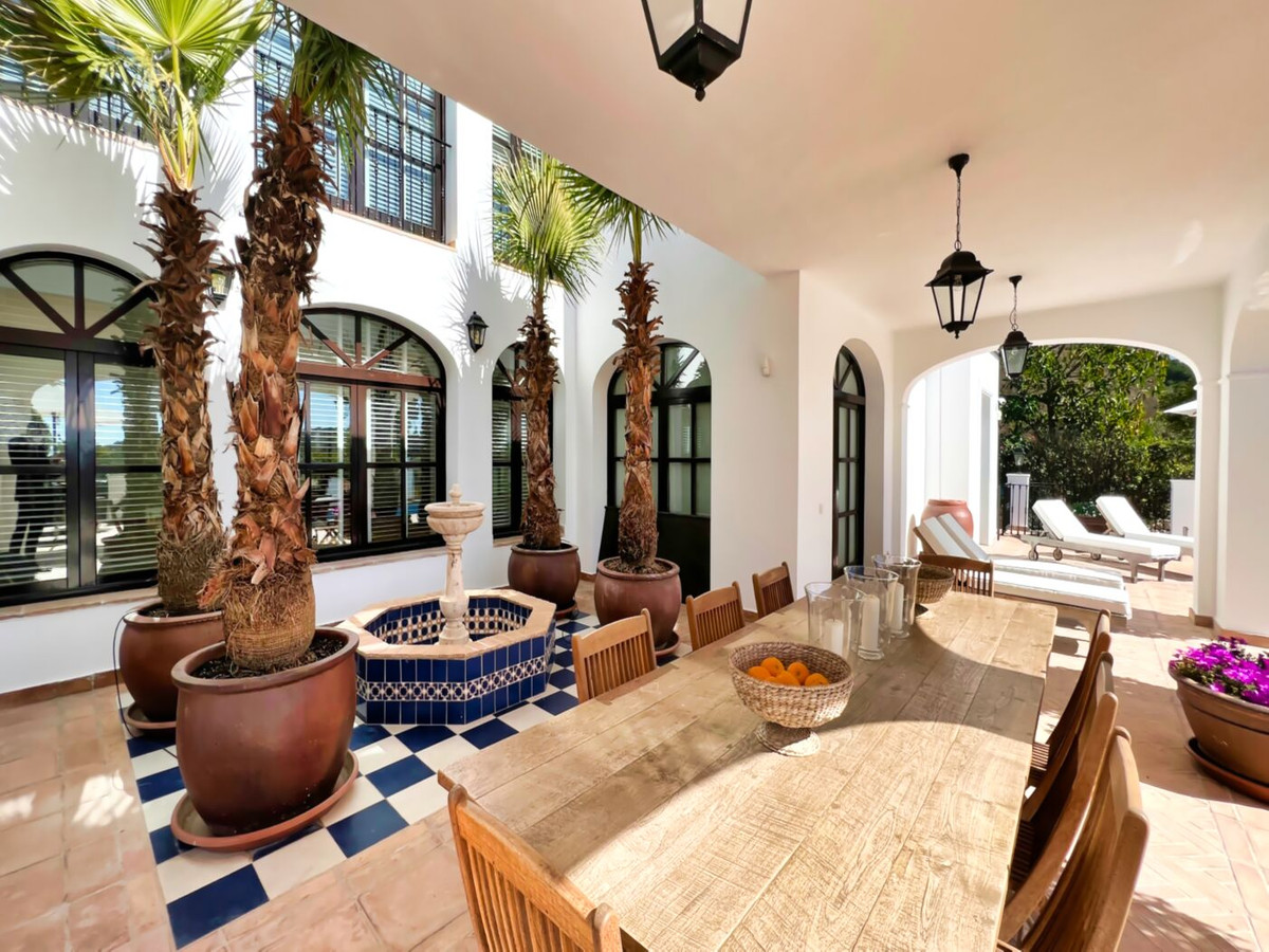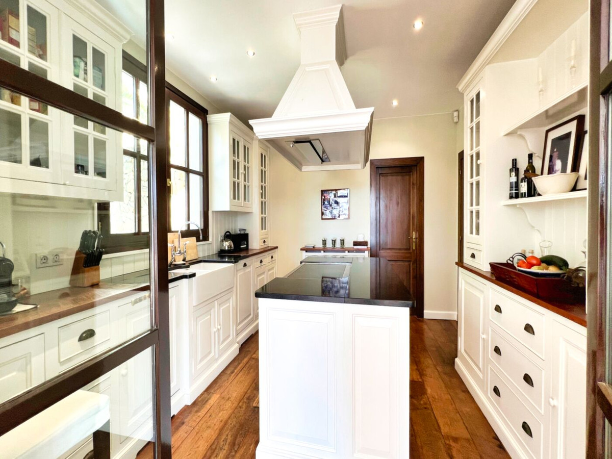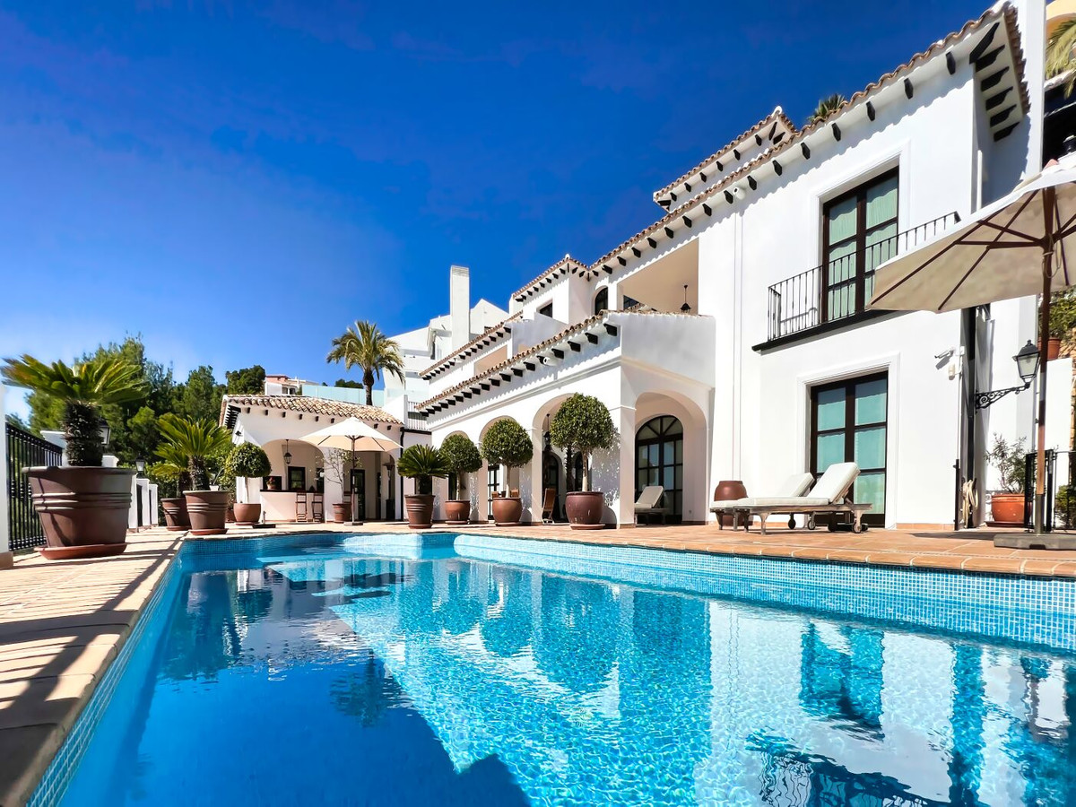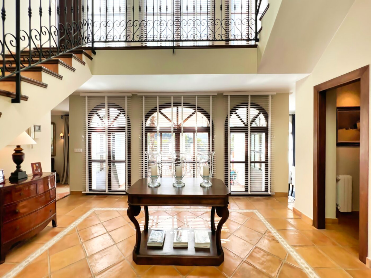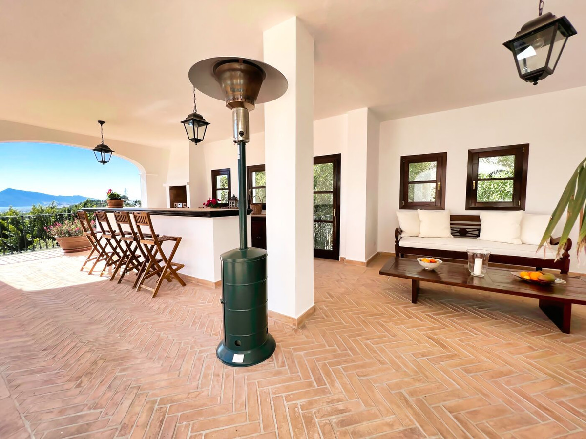 This impressive mediterranean villa was built in one of the most exclusive residential areas of Altea right by the Don Cayo Golf club. The villa can be accessed via en electric gate leading down to the parking area for two cars. The mansion is accessed on the top floor with its 4 bedrooms and 2 bathrooms and the grand staircase leading down to the middle and ground floor. In the center of the villa is the master bedroom with en-suite batroom and dressing room on one side and another large bedroom, again with en-suite bathroom and walk in wardrobe. Going further down the staircase we get to the large hall were on the one side of it we find the large living room and on the other side, the dining room, kitchen, guest toilet and utility room. All of the rooms on the ground floor lead outside to the large terrace with its beautiful veranda and outside dining area and bar just by the swimming pool.