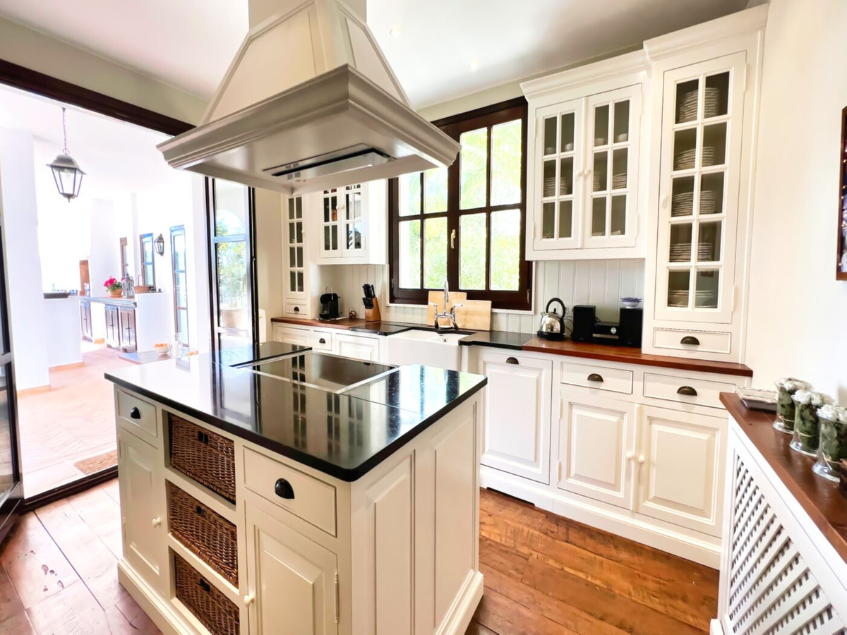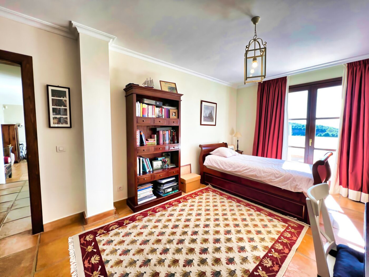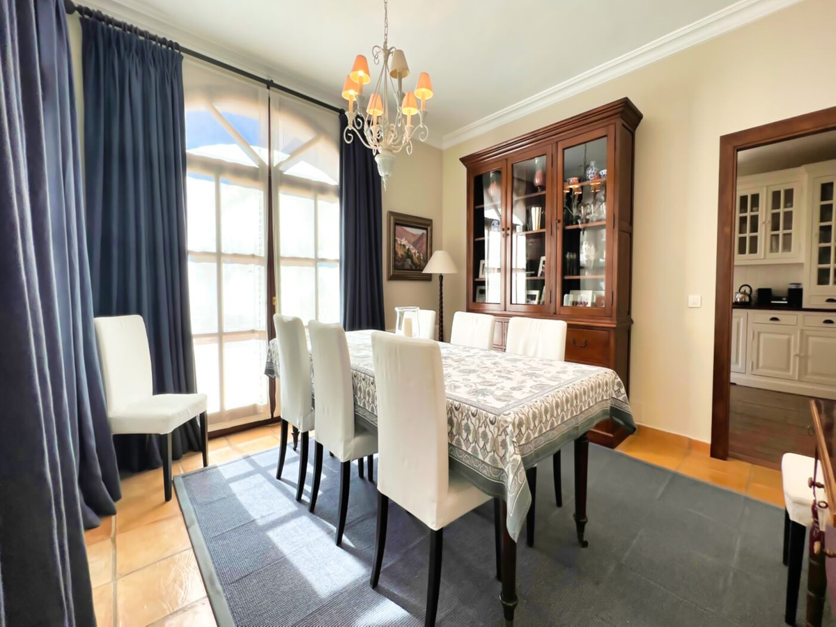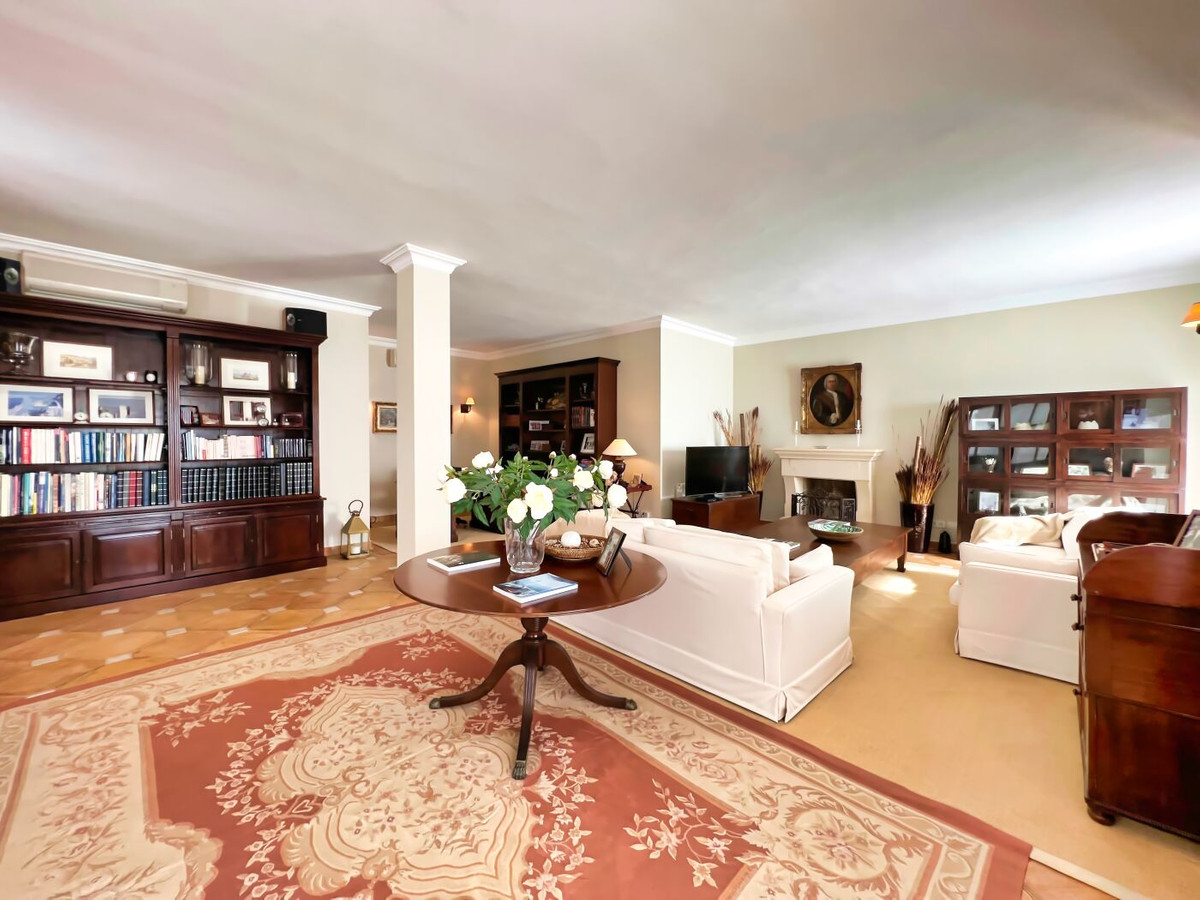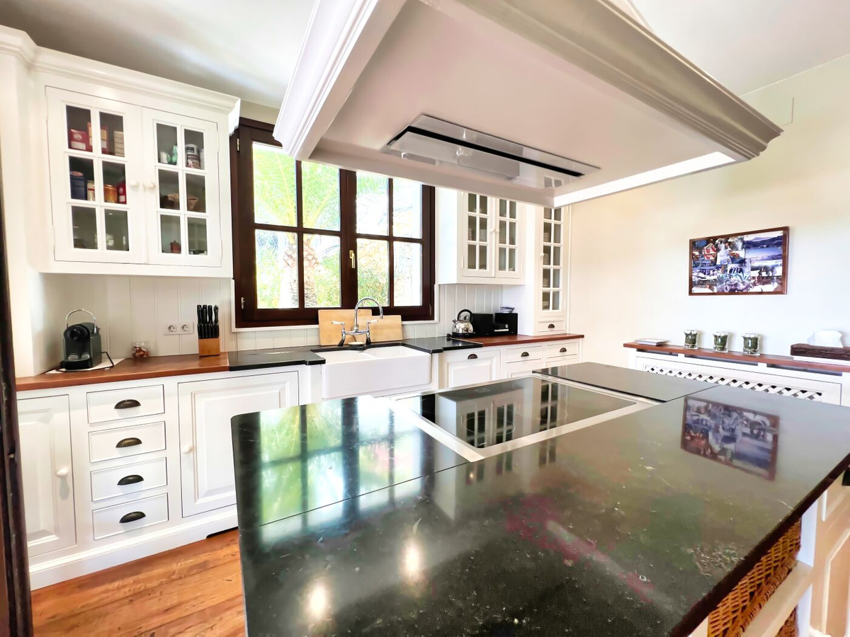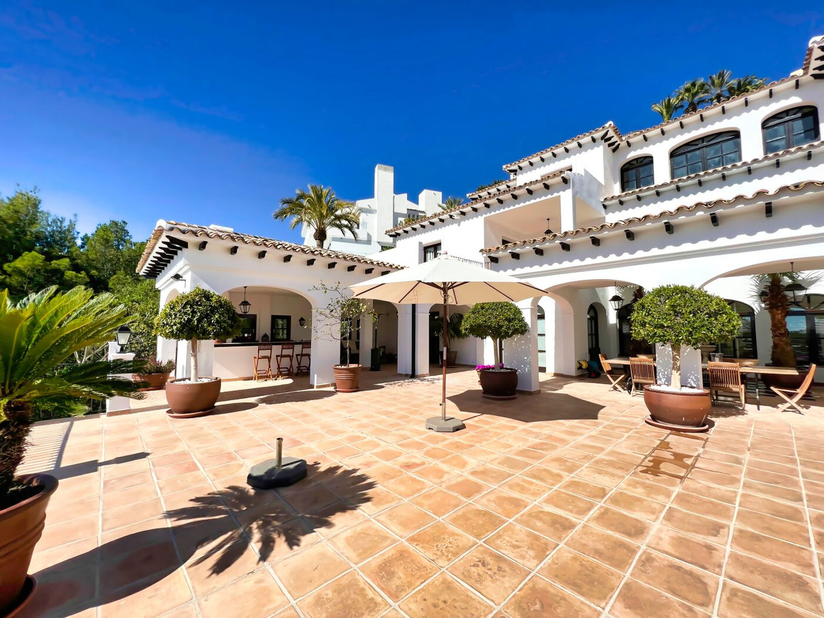 This impressive mediterranean villa was built in one of the most exclusive residential areas of Altea right by the Don Cayo Golf club. The villa can be accessed via en electric gate leading down to the parking area for two cars. The mansion is accessed on the top floor with its 4 bedrooms and 2 bathrooms and the grand staircase leading down to the middle and ground floor. In the center of the villa is the master bedroom with en-suite batroom and dressing room on one side and another large bedroom, again with en-suite bathroom and walk in wardrobe. Going further down the staircase we get to the large hall were on the one side of it we find the large living room and on the other side, the dining room, kitchen, guest toilet and utility room. All of the rooms on the ground floor lead outside to the large terrace with its beautiful veranda and outside dining area and bar just by the swimming pool.