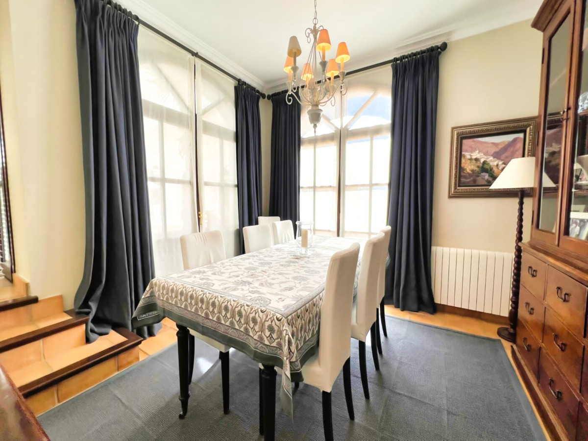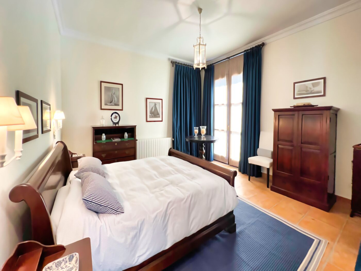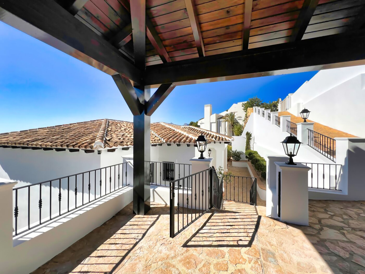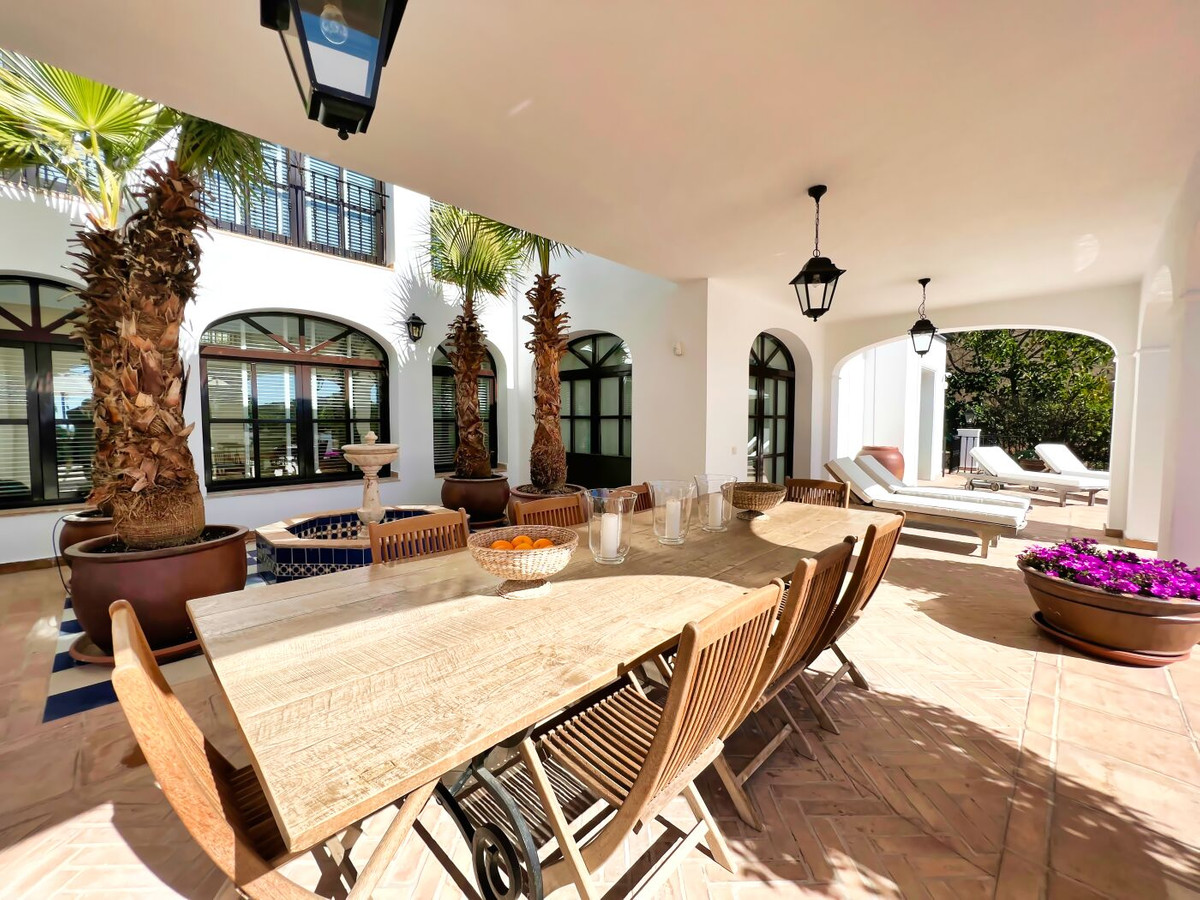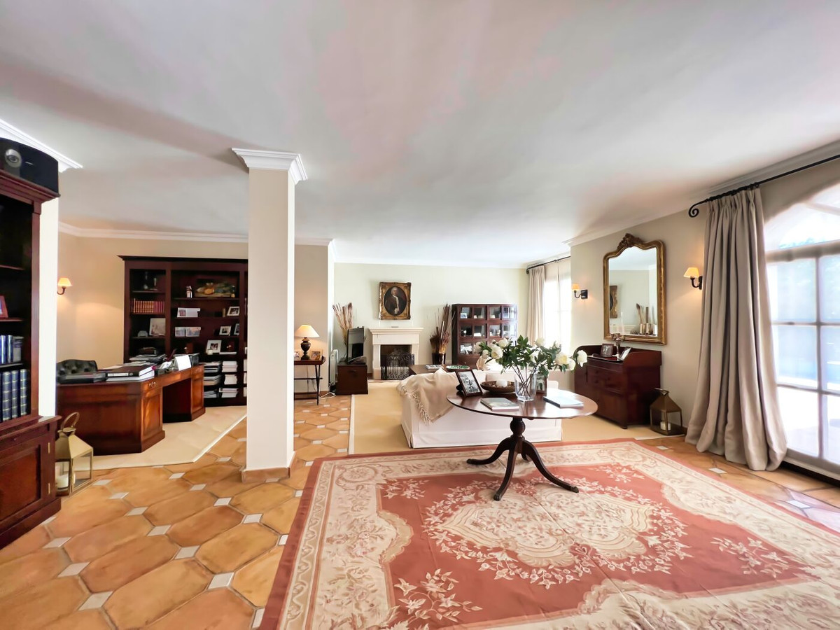 This impressive mediterranean villa was built in one of the most exclusive residential areas of Altea right by the Don Cayo Golf club. The villa can be accessed via en electric gate leading down to the parking area for two cars. The mansion is accessed on the top floor with its 4 bedrooms and 2 bathrooms and the grand staircase leading down to the middle and ground floor. In the center of the villa is the master bedroom with en-suite batroom and dressing room on one side and another large bedroom, again with en-suite bathroom and walk in wardrobe. Going further down the staircase we get to the large hall were on the one side of it we find the large living room and on the other side, the dining room, kitchen, guest toilet and utility room. All of the rooms on the ground floor lead outside to the large terrace with its beautiful veranda and outside dining area and bar just by the swimming pool.