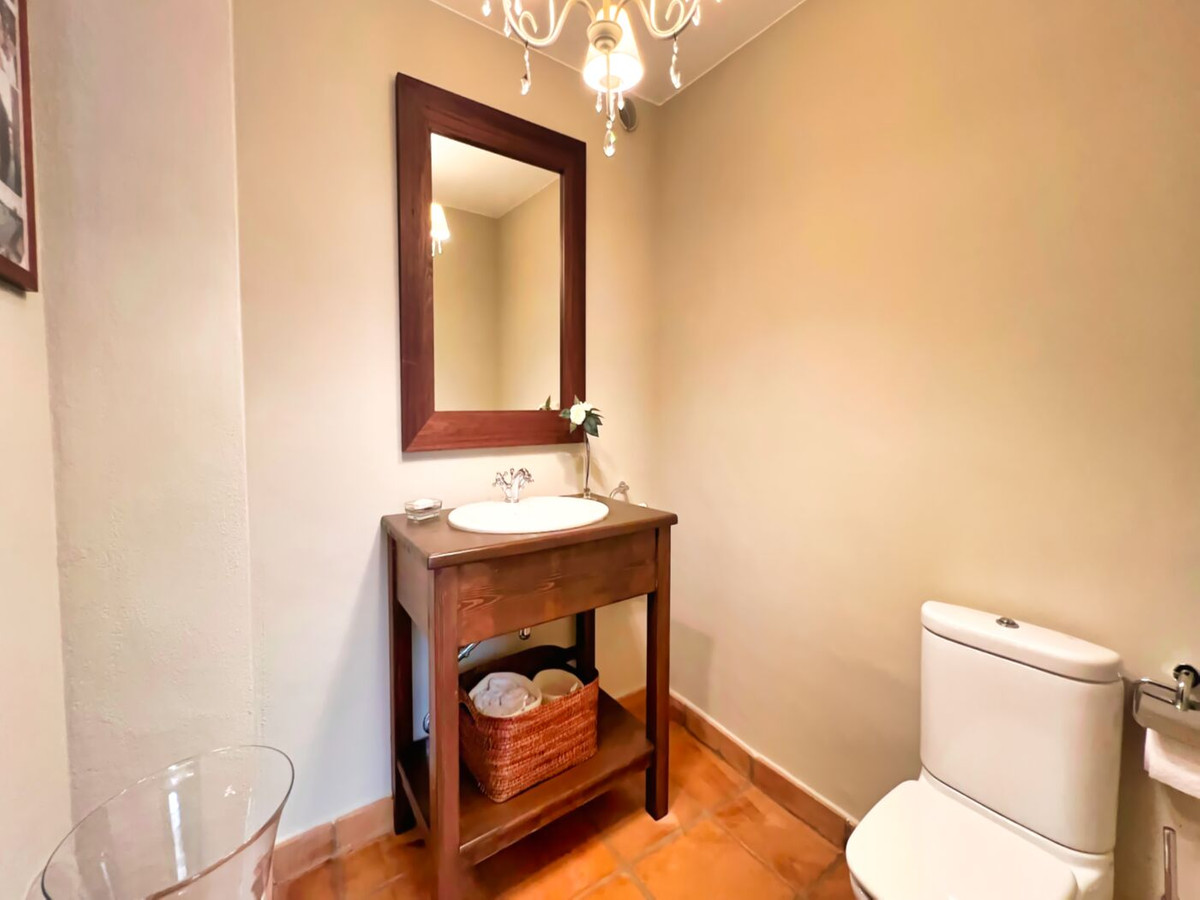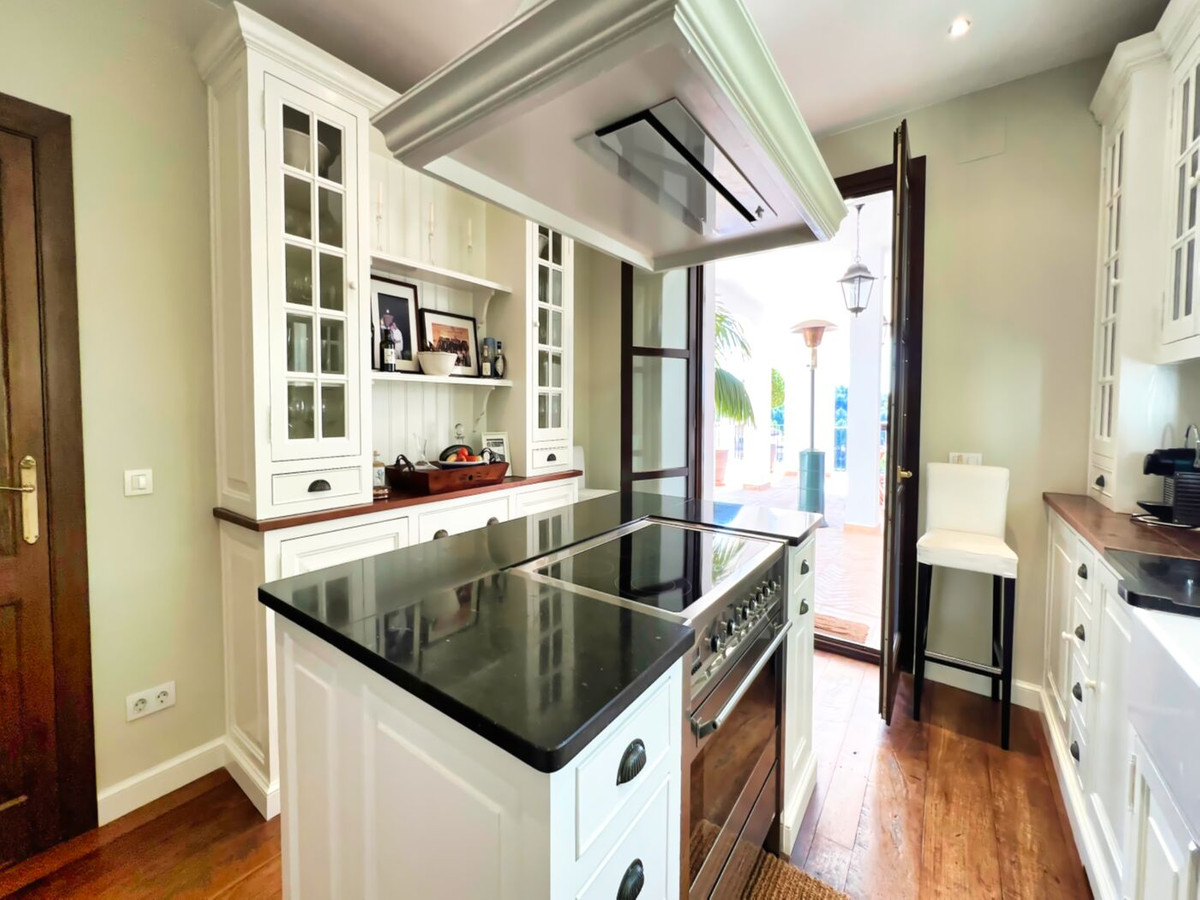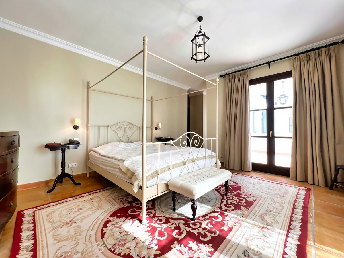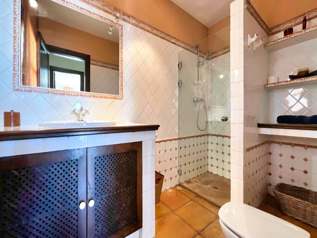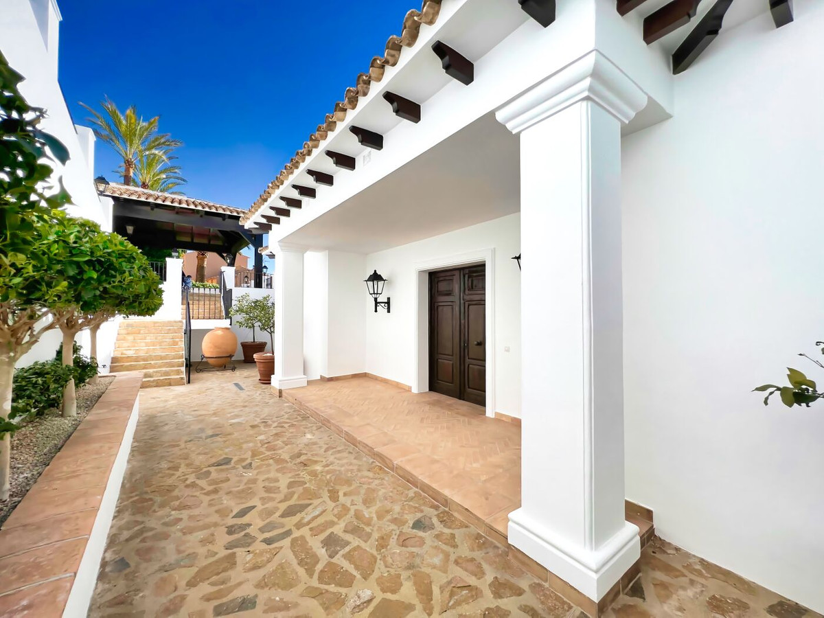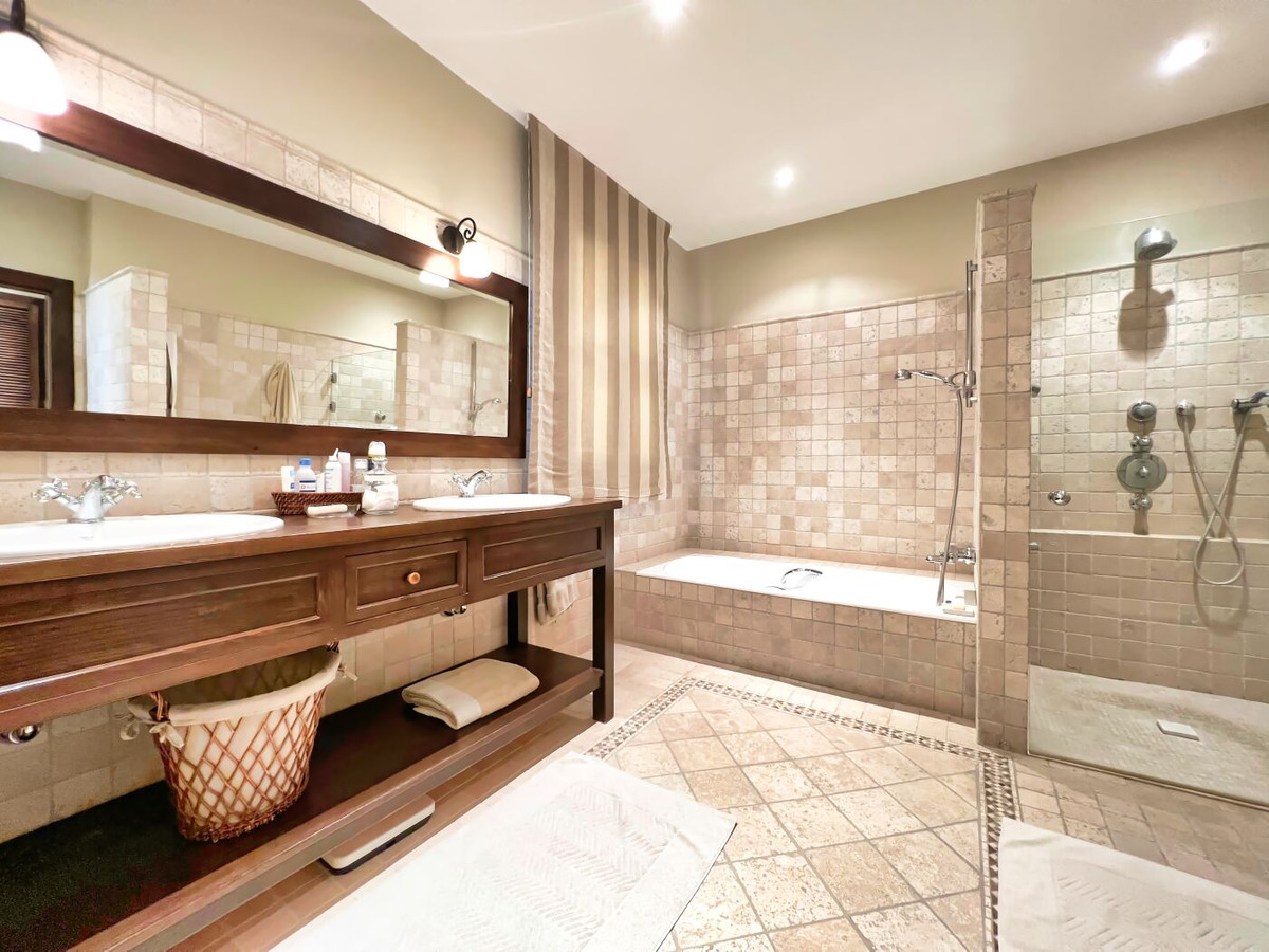 This impressive mediterranean villa was built in one of the most exclusive residential areas of Altea right by the Don Cayo Golf club. The villa can be accessed via en electric gate leading down to the parking area for two cars. The mansion is accessed on the top floor with its 4 bedrooms and 2 bathrooms and the grand staircase leading down to the middle and ground floor. In the center of the villa is the master bedroom with en-suite batroom and dressing room on one side and another large bedroom, again with en-suite bathroom and walk in wardrobe. Going further down the staircase we get to the large hall were on the one side of it we find the large living room and on the other side, the dining room, kitchen, guest toilet and utility room. All of the rooms on the ground floor lead outside to the large terrace with its beautiful veranda and outside dining area and bar just by the swimming pool.