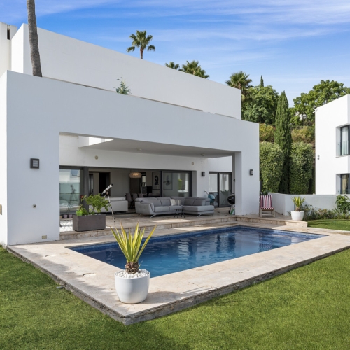Brand new! A dream of an ultra modern and sustainable villa with panoramic views in the fastest growing area of La Alqueria with several new accesses, sharing in its community of 13 villas, more than 5.000 m2 of Mediterranean gardens. With its private infinity swimming pools suspended in the air, outdoor jacuzzi for 6 people, spacious lounges, al fresco terraces, en-suite bedrooms with walnut wardrobes and bathrooms of the latest design, this is the boutique villa for lovers of tranquillity and the visual beauty that the complex offers with its day and night lights and its open views of the sea. At the same time it is only 10 minutes away from Puerto Banus and its enormous movement and only 5 minutes away from supermarkets and services.
