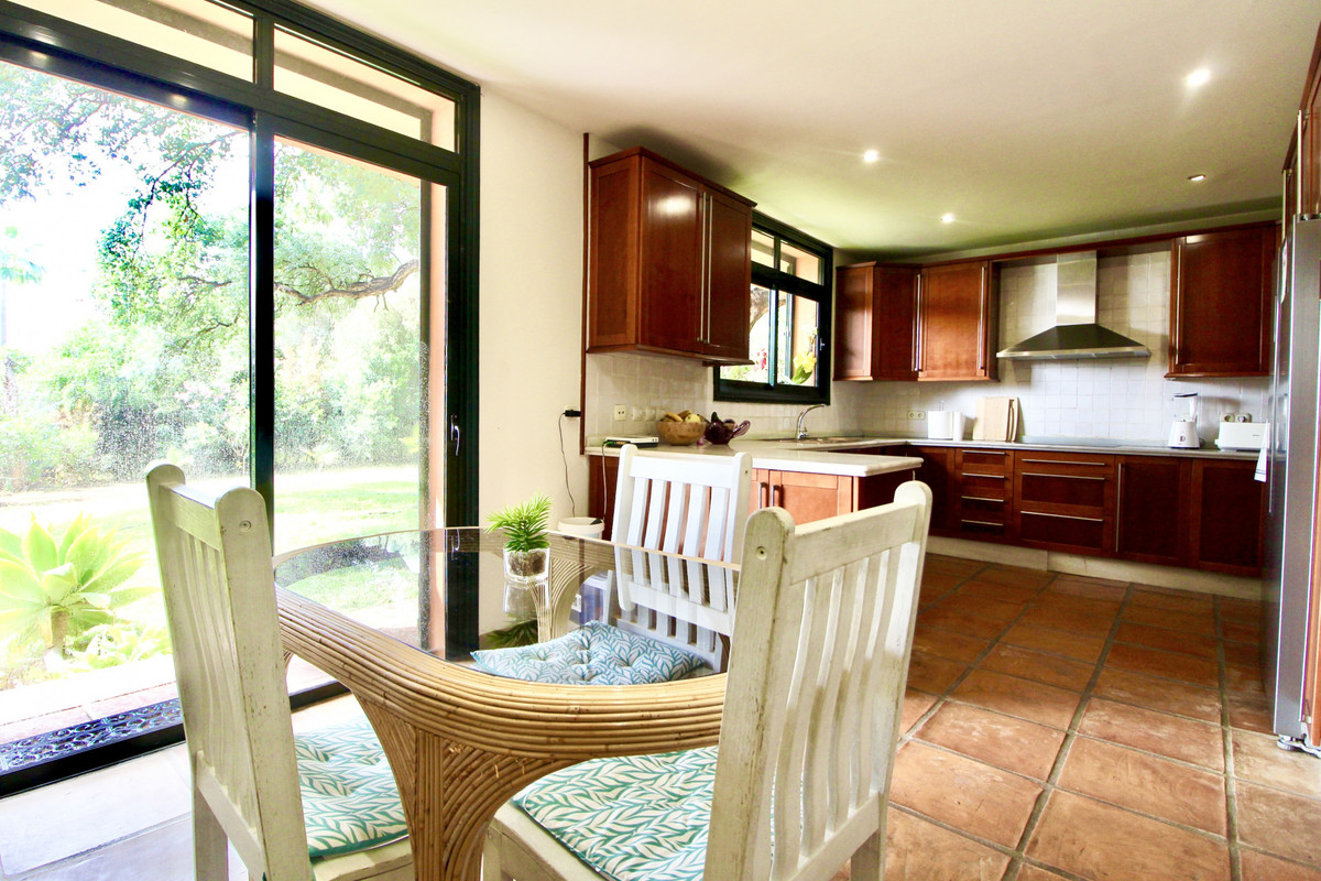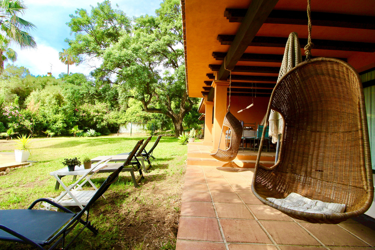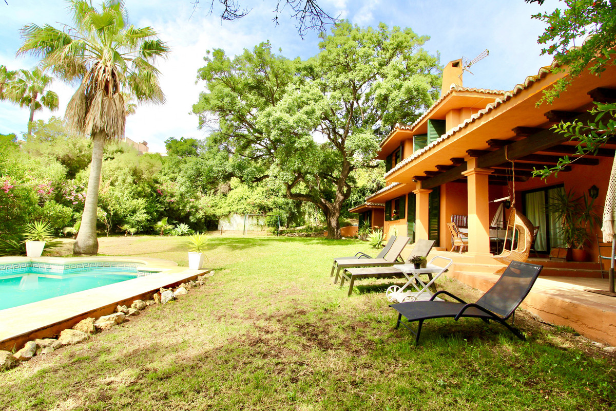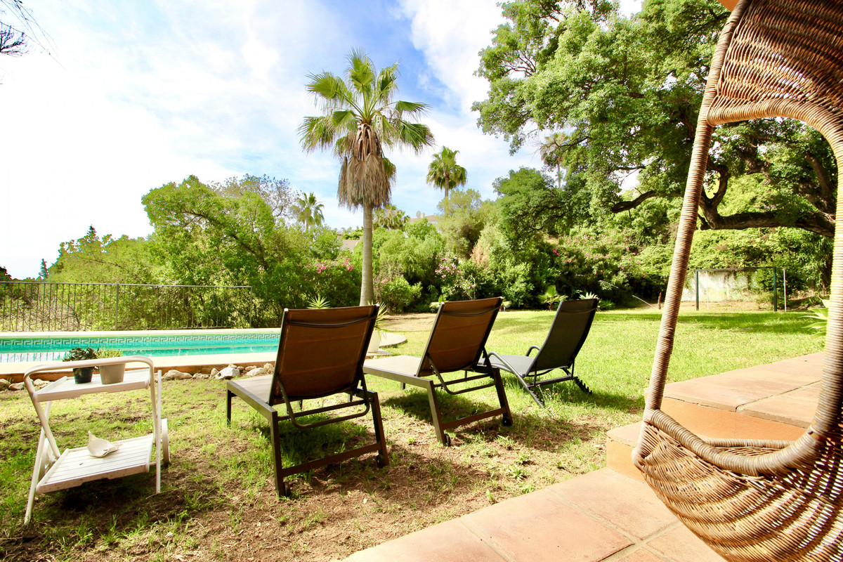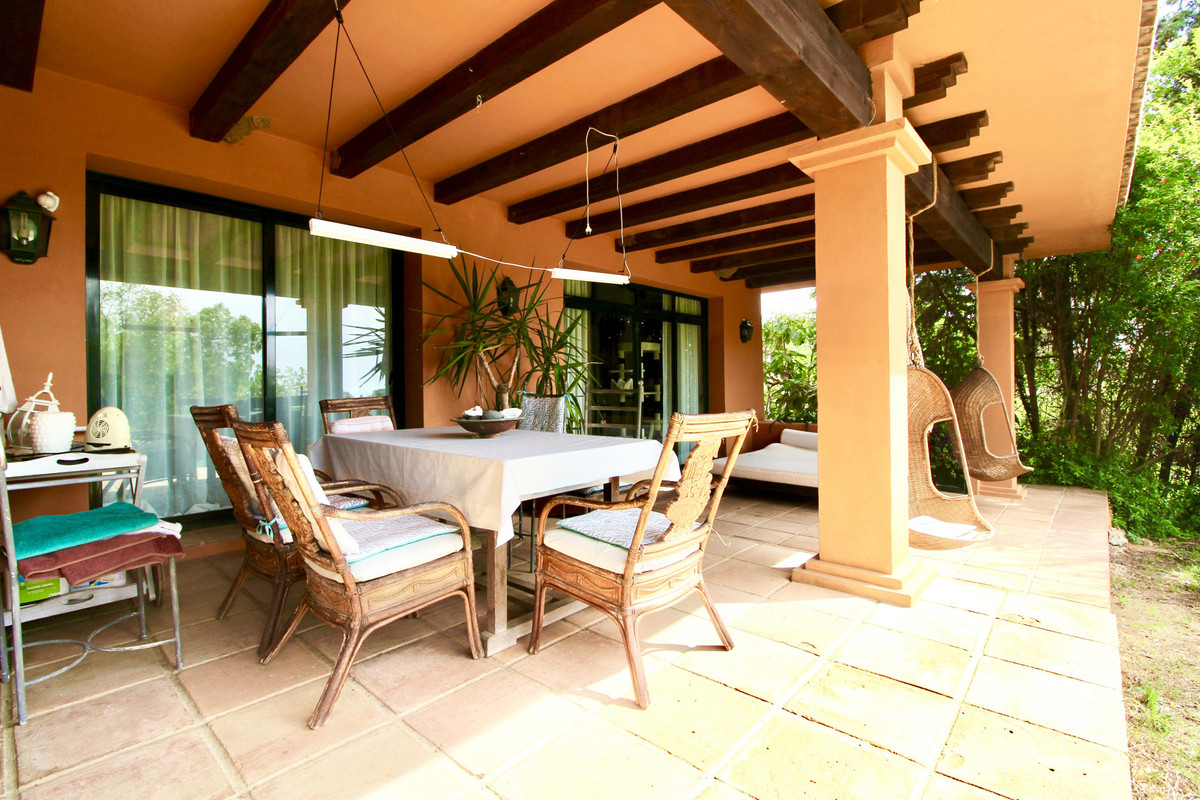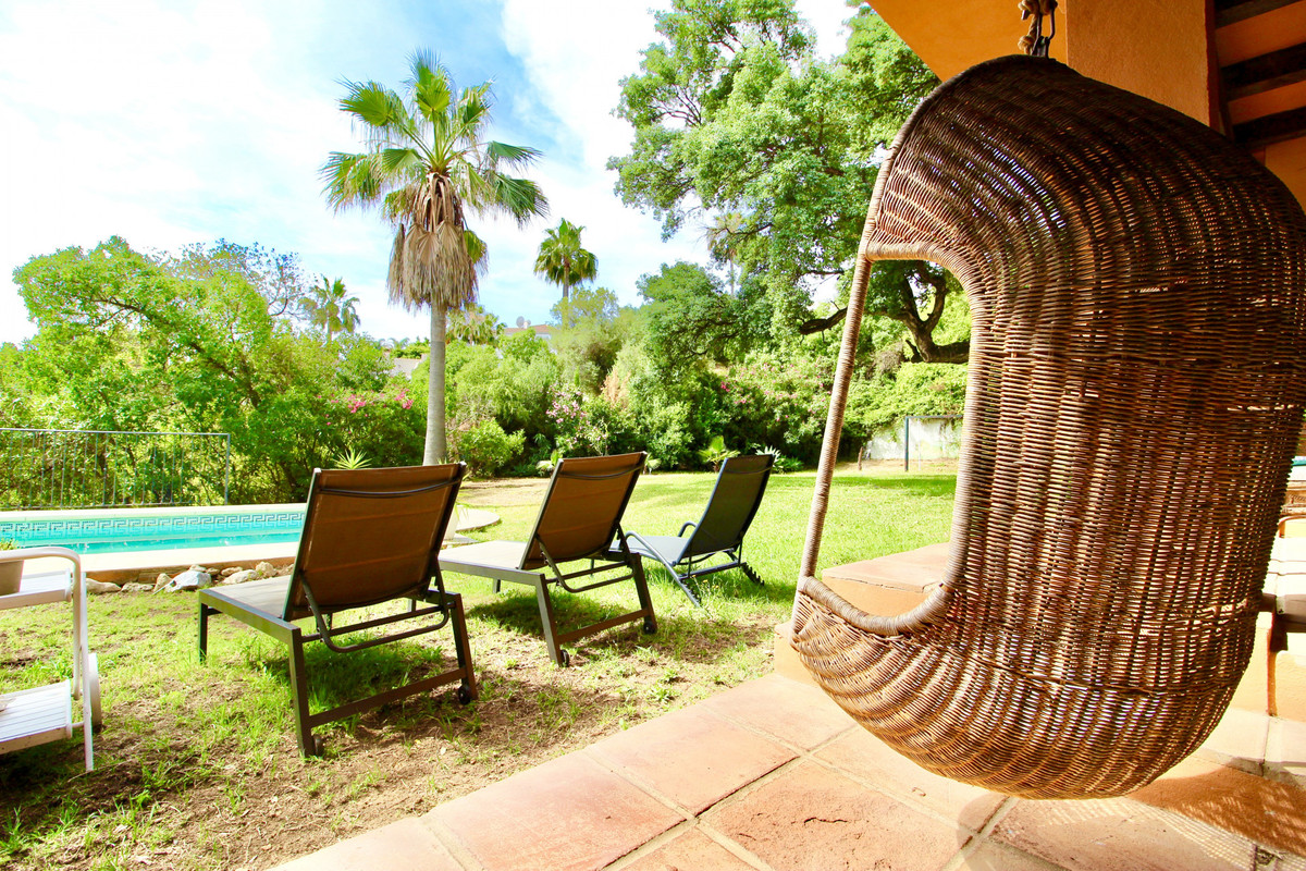 Large terrace with dining area and seating area in front of the pool. All surrounded by a large green area with magnificent trees.