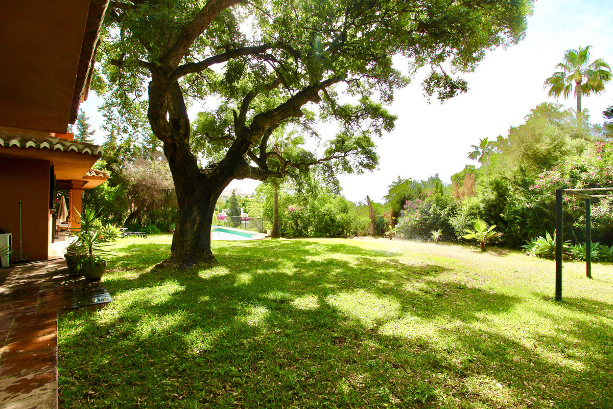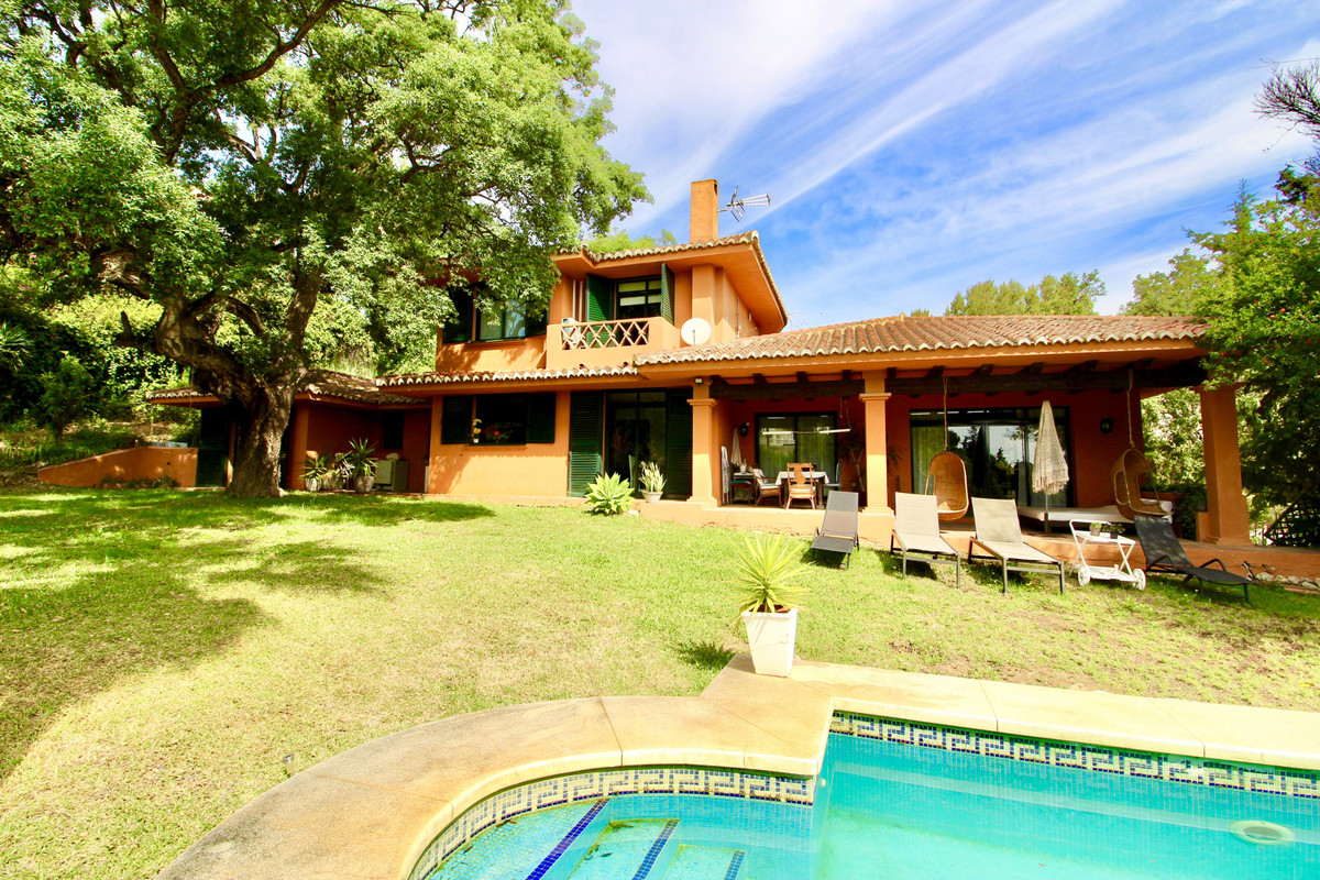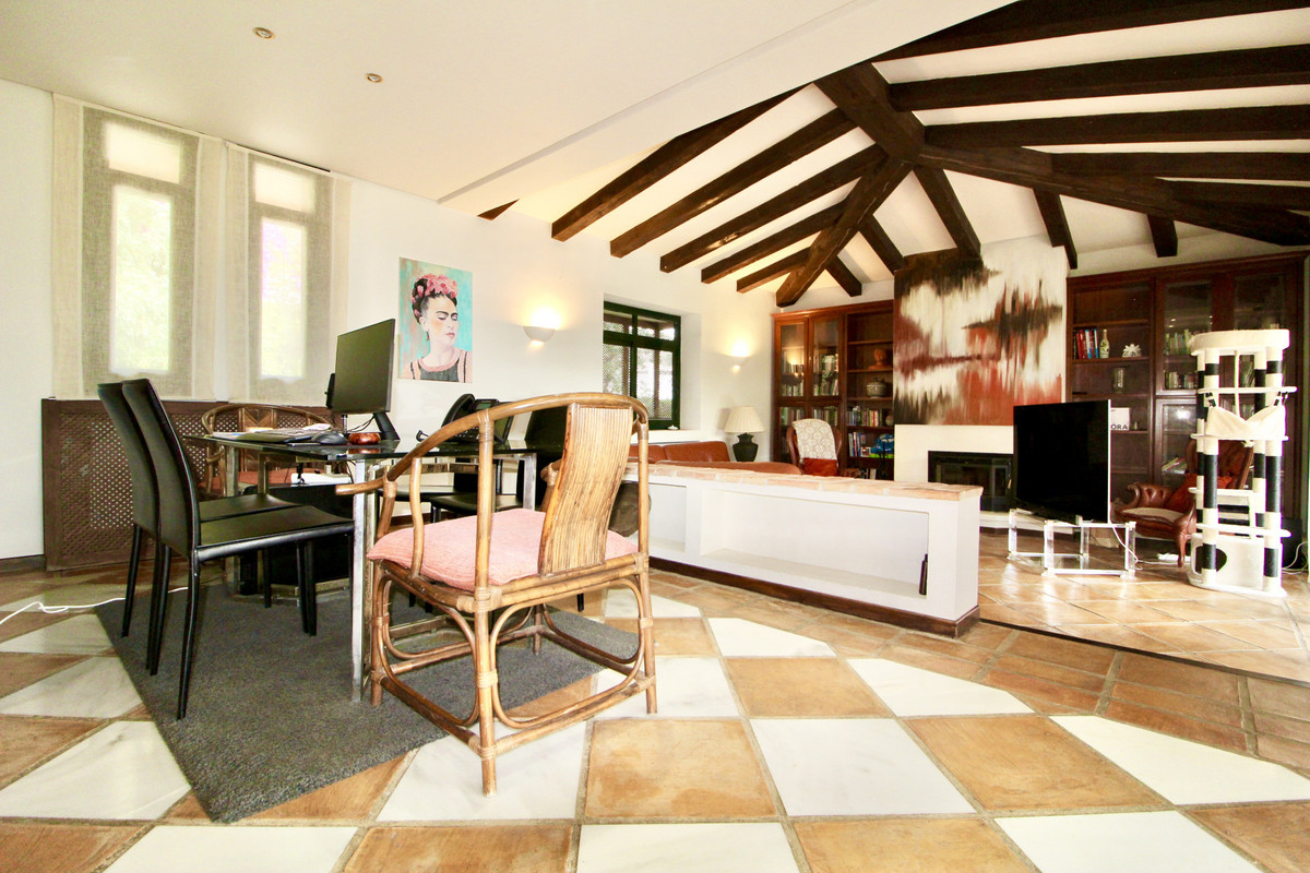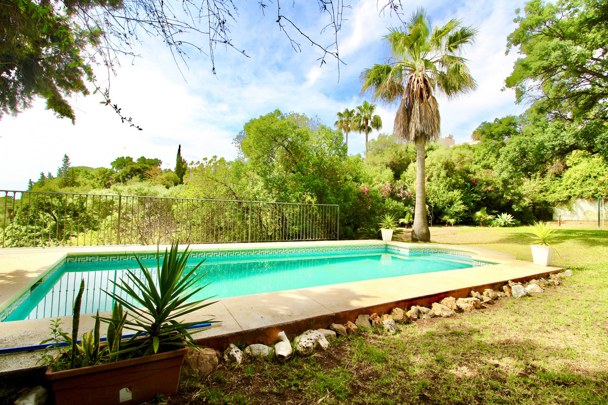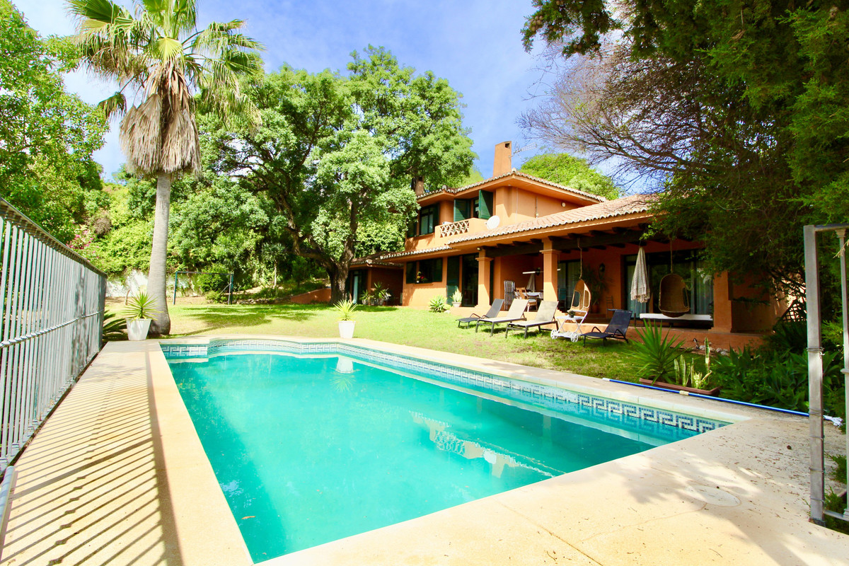 Large terrace with dining area and seating area in front of the pool. All surrounded by a large green area with magnificent trees.