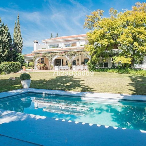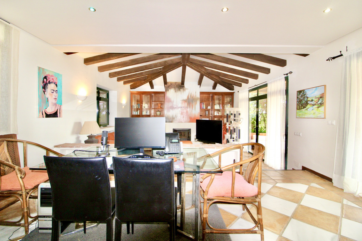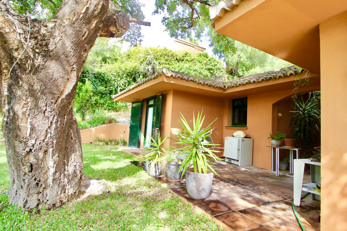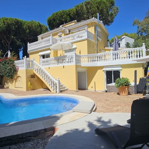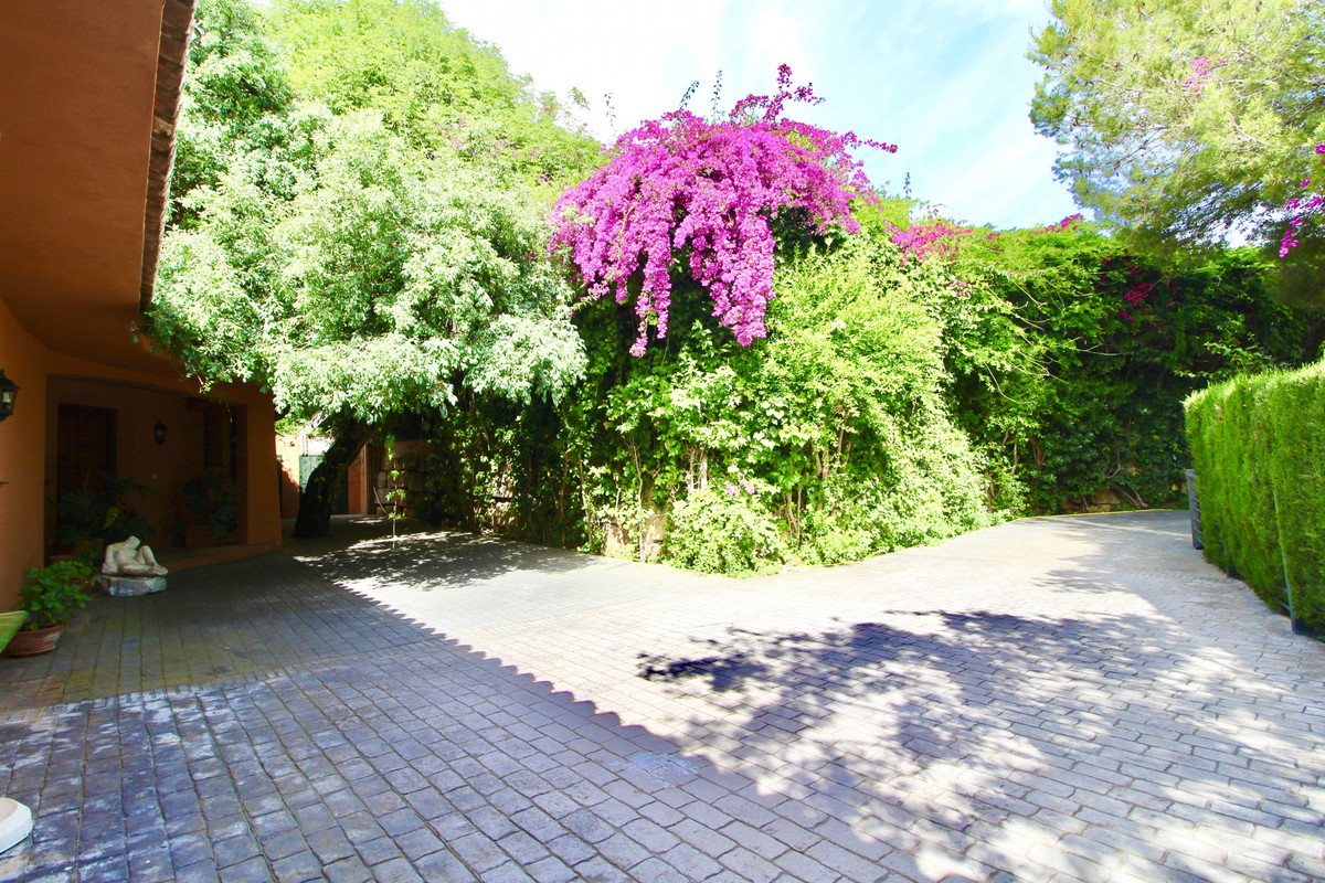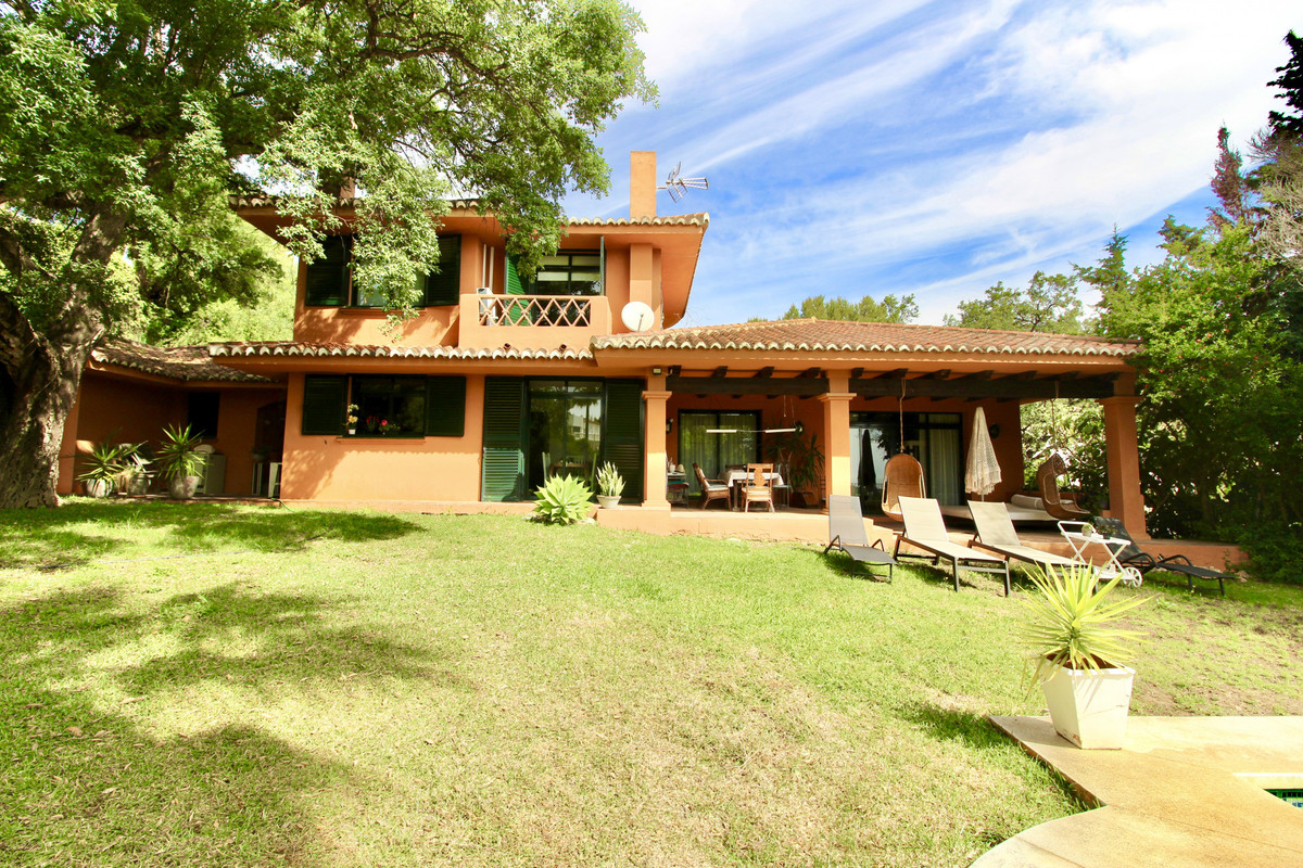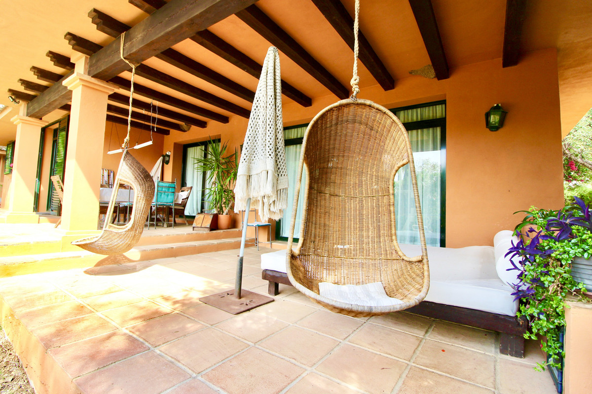 Large terrace with dining area and seating area in front of the pool. All surrounded by a large green area with magnificent trees.