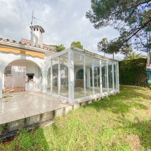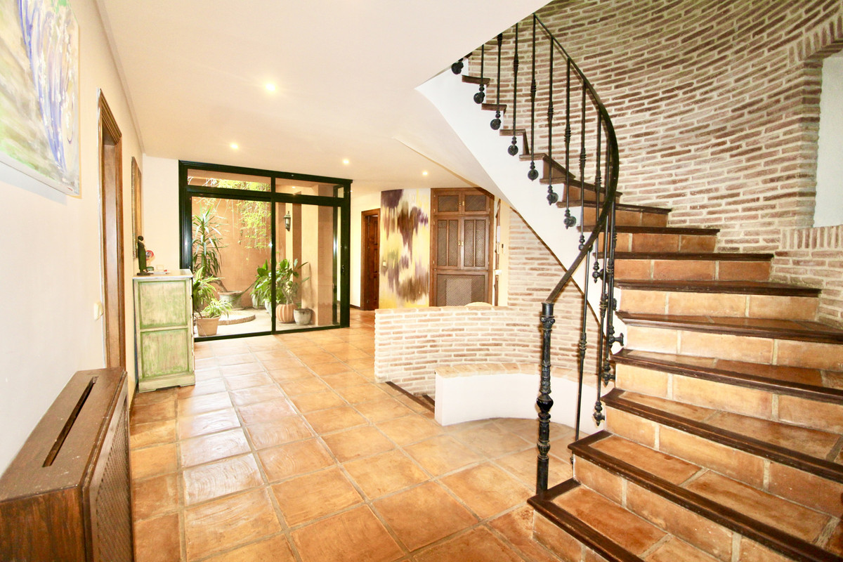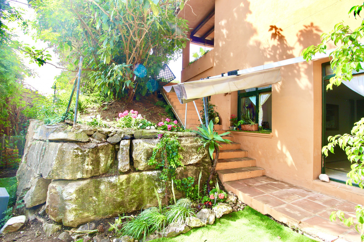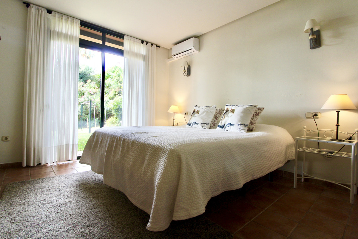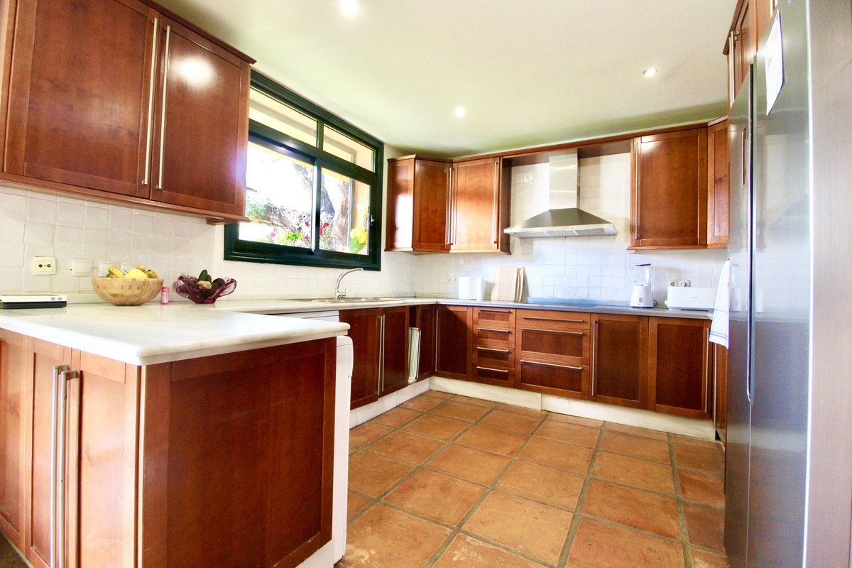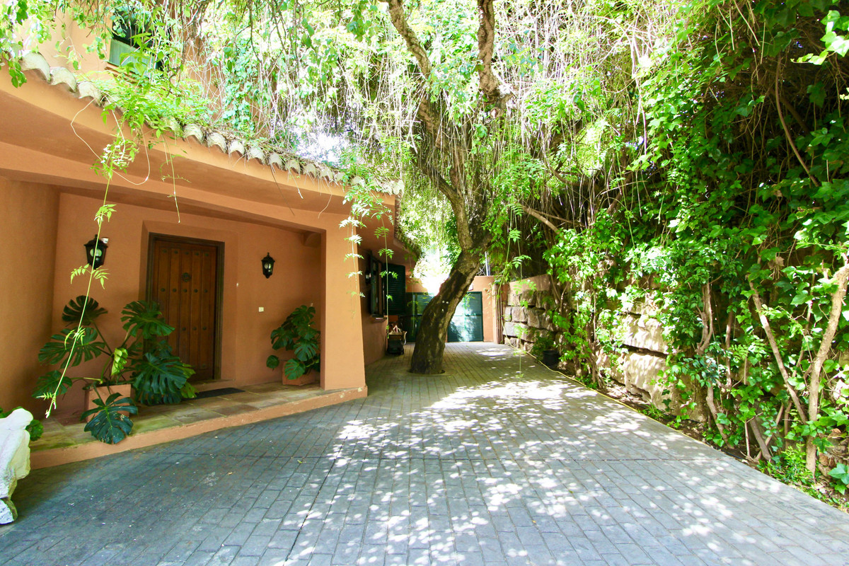 Large terrace with dining area and seating area in front of the pool. All surrounded by a large green area with magnificent trees.