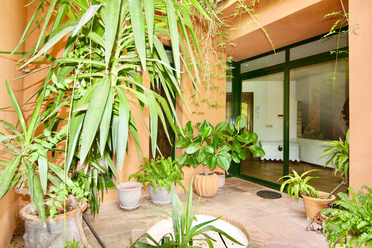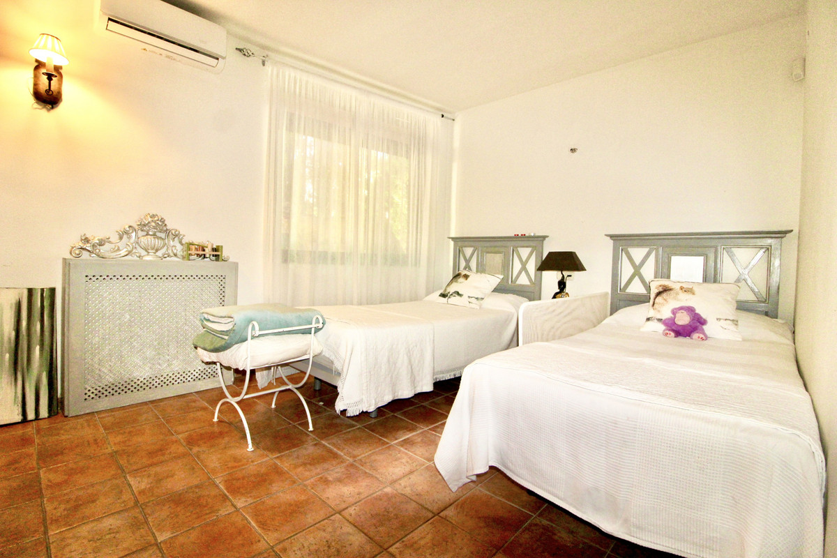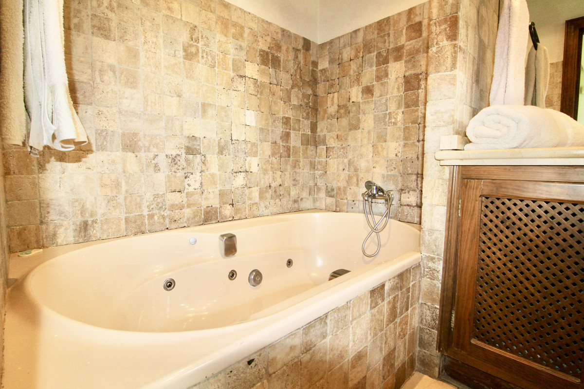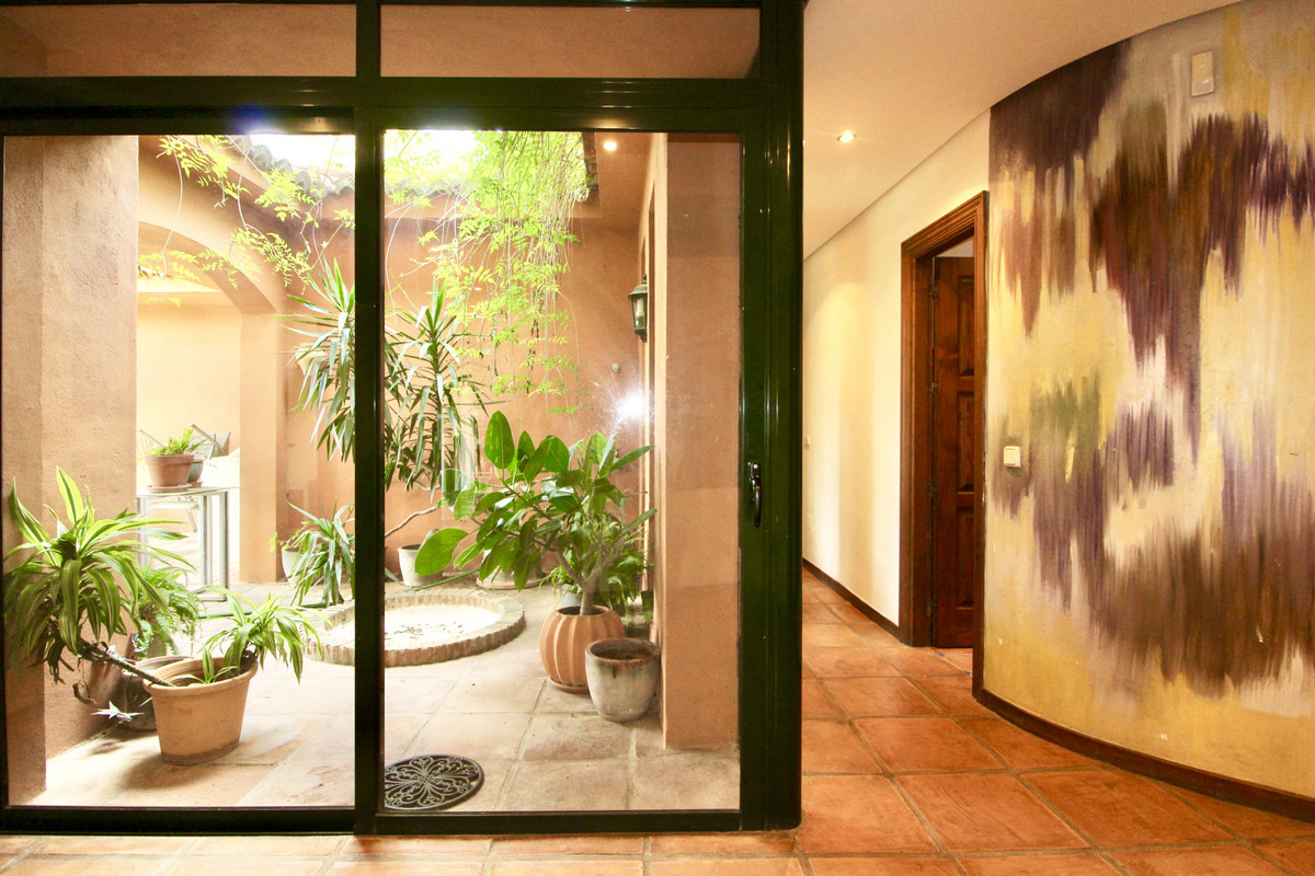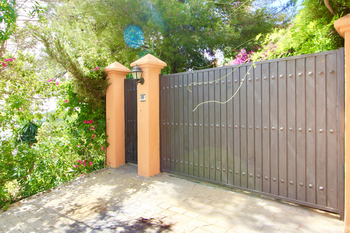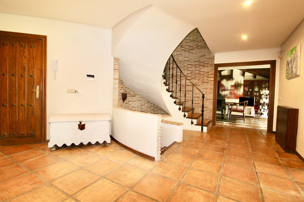 Large terrace with dining area and seating area in front of the pool. All surrounded by a large green area with magnificent trees.