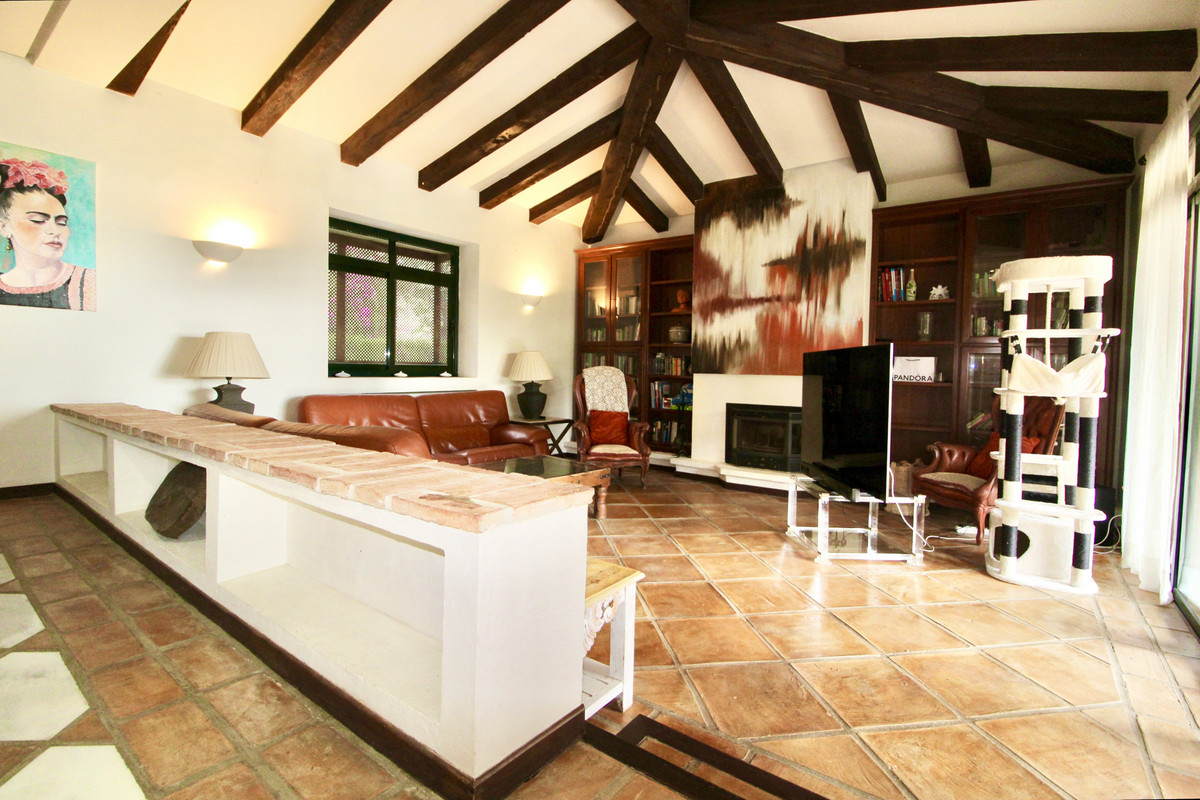 Spacious and bright living room with fireplace overlooking the porch and pool.