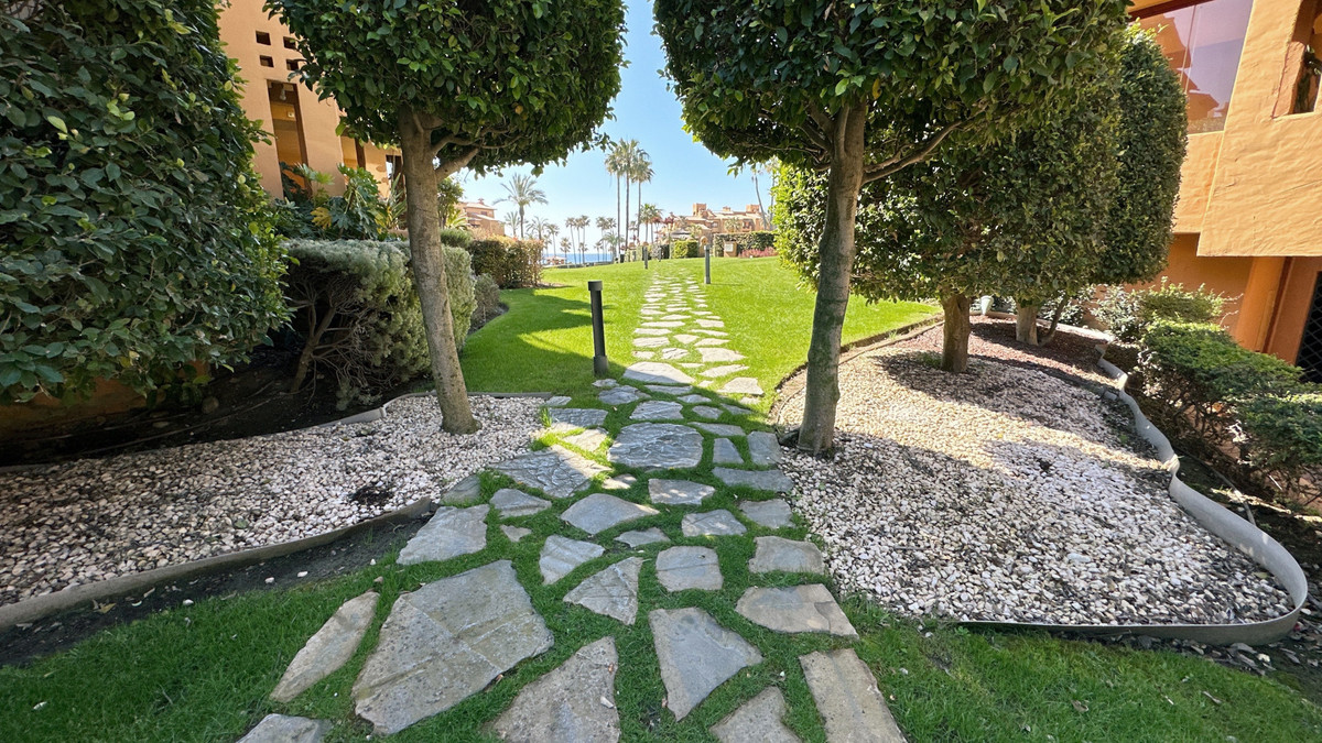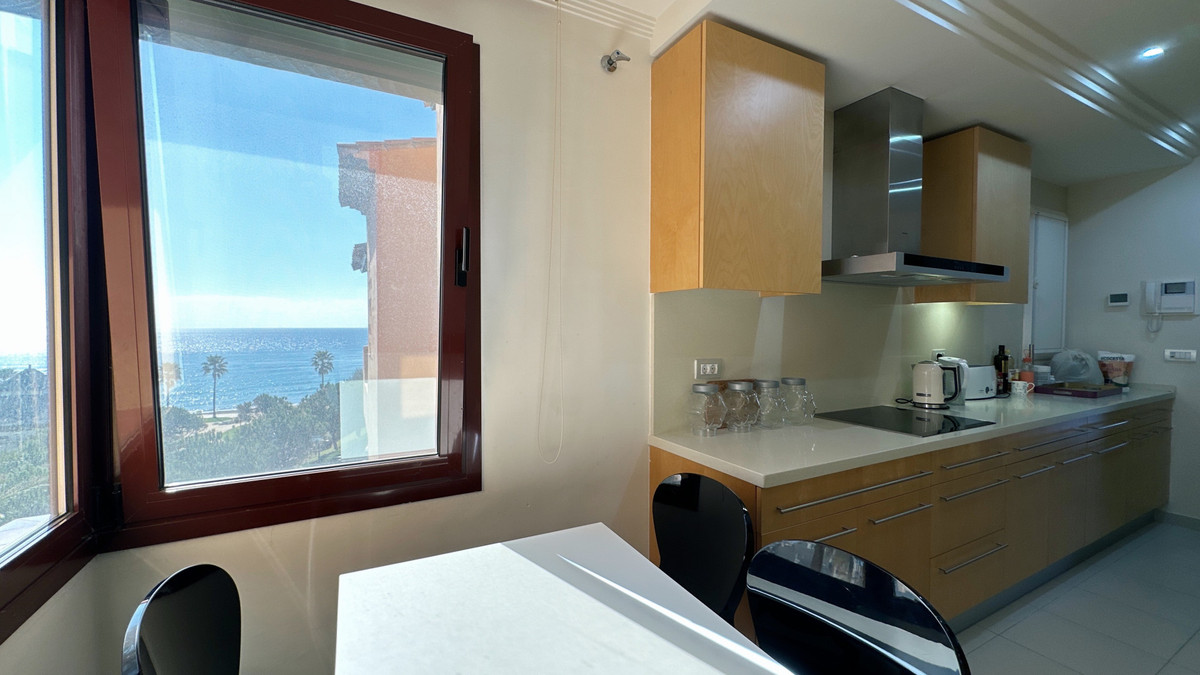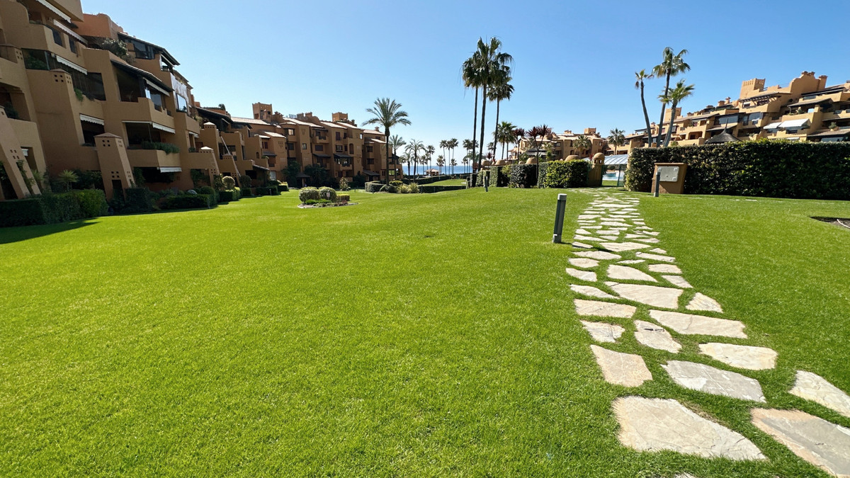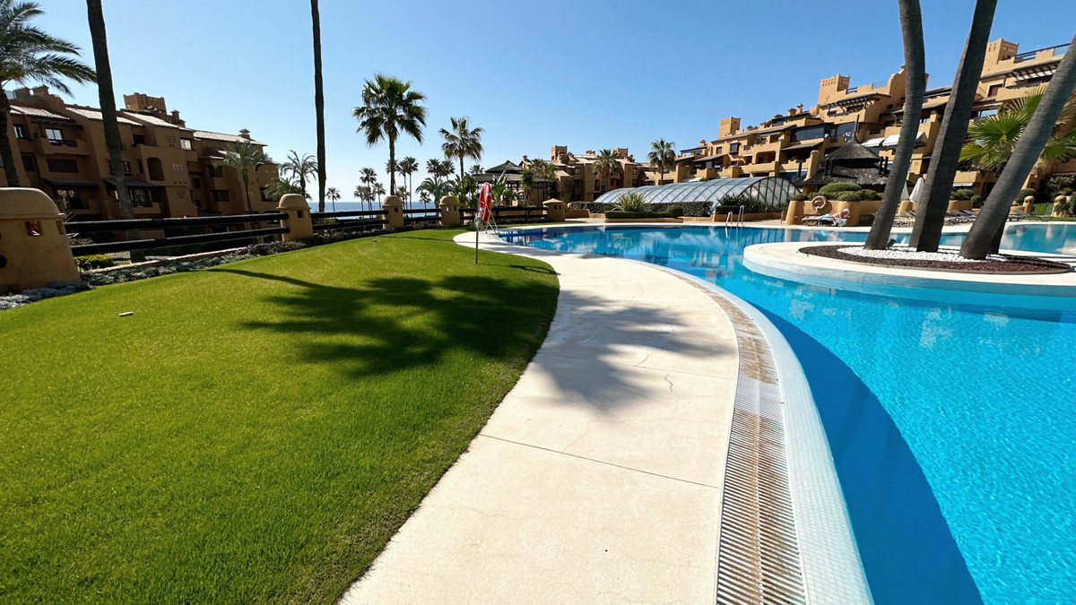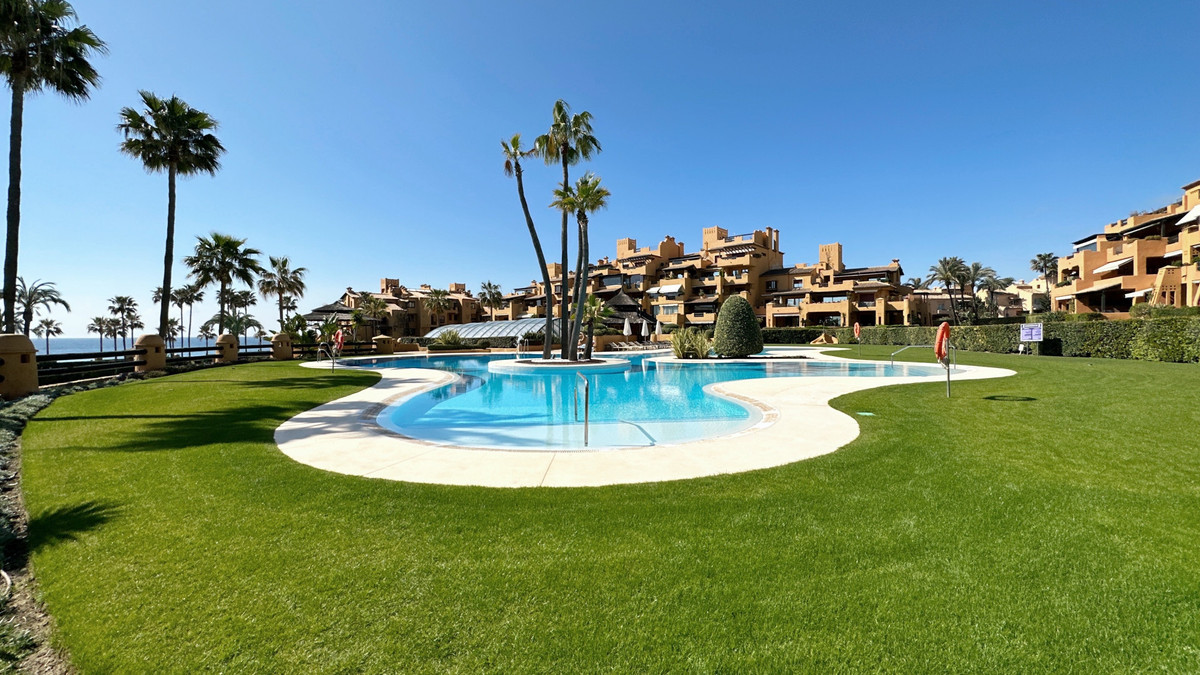 Apartment for sale and for rent in Los Granados del Mar, Estepona with 3 bedrooms, 3 bathrooms, 2 en suite bathrooms and with orientation south/west, with communal swimming pool, communal garage (1 parking spaces) and communal garden. Regarding property dimensions, it has 180 m² built and 50 m² terrace. Has the following facilities front line beach, amenities near, transport near, air conditioning, fully furnished, fully fitted kitchen, jacuzzi, sauna, storage room, gym, security entrance, double glazing, dining room, security service 24h, private terrace, kitchen equipped, living room, indoor pool, heated pool, underfloor heating (throughout), home automation system, internet - wifi, covered terrace, 24h service, electric blinds, fitted wardrobes, gated community, lift, garden view, pool view, beachside, doorman, underfloor heating (bathrooms), close to children playground, close to sea / beach, glass doors, excellent condition, close to shops, close to town, close to port, close to schools, surveillance cameras, armored door, partial sea views, porcelain floors and internet - fibre optic.