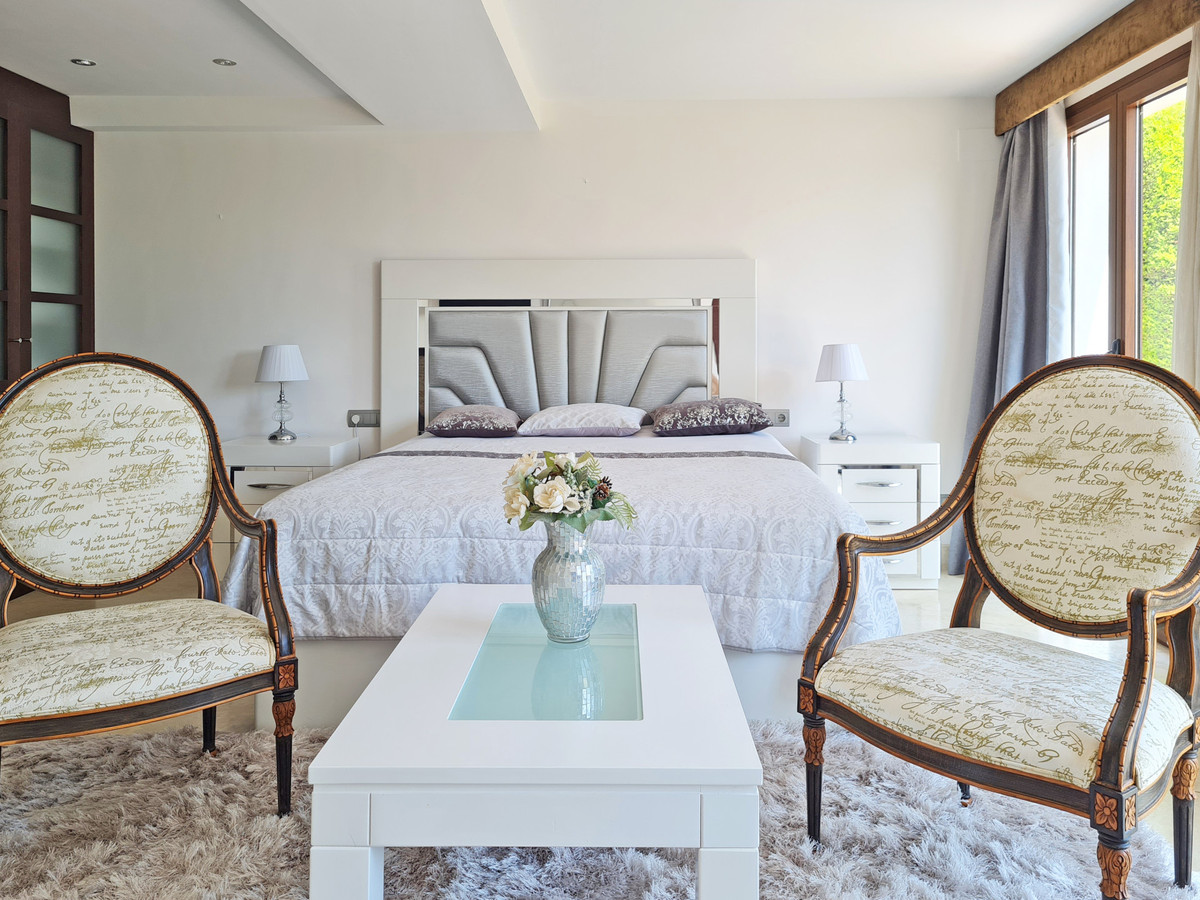 The main floor features a spacious living area with garden and mountain views, a stylish dining space, and an open-plan kitchen, all opening onto a large terrace perfect for outdoor dining. This level also includes three beautifully designed en-suite bedrooms with private dressing areas. Upstairs, the luxurious master suite boasts its own en-suite bathroom and dressing area.
