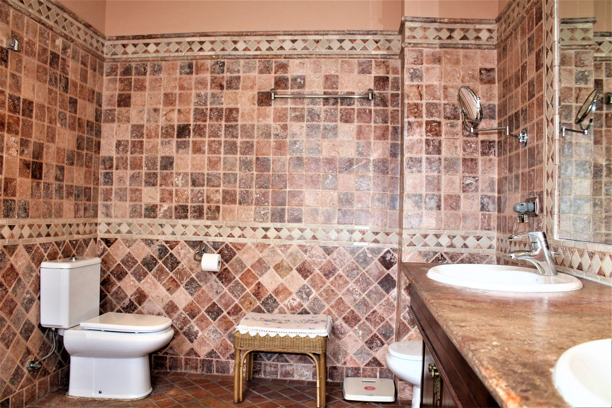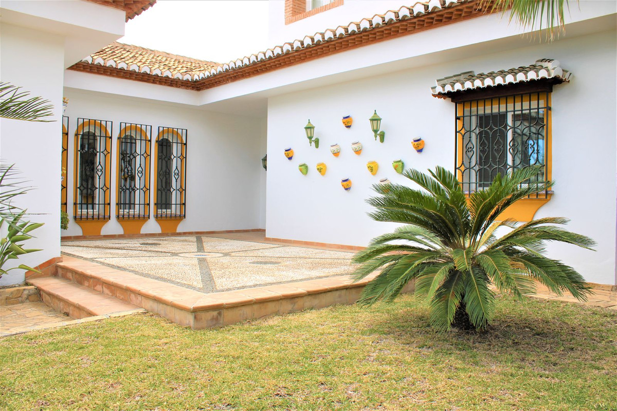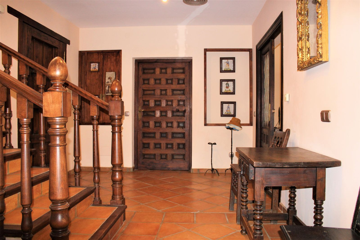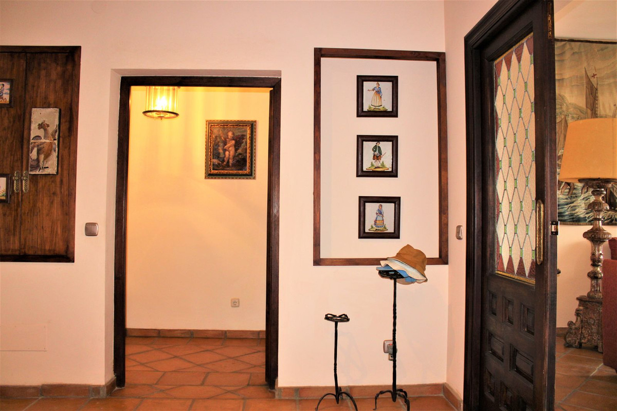 Husets indgang imponerer med en storslået sevillansk gårdhave, dekoreret med farverige potteplanter, håndværksfliser og en smukt brolagt terrasse. En stor solid trædør byder dig velkommen ind i en rummelig hall, der forbinder husets forskellige dele. Til højre finder du et stort fuldt udstyret køkken, som fører videre til en lys og rummelig stue.