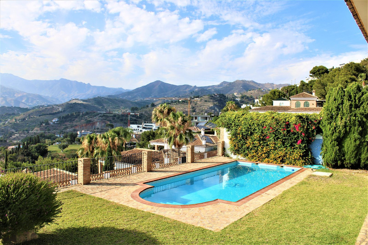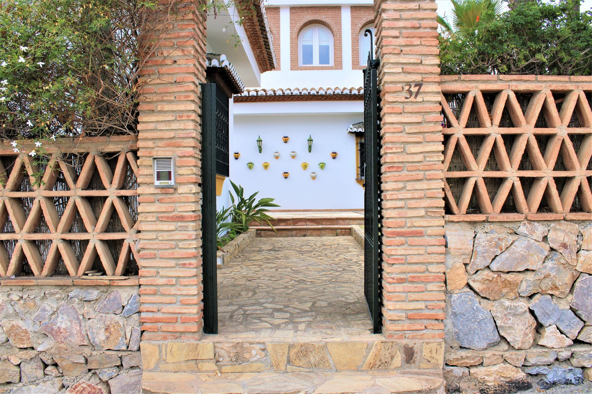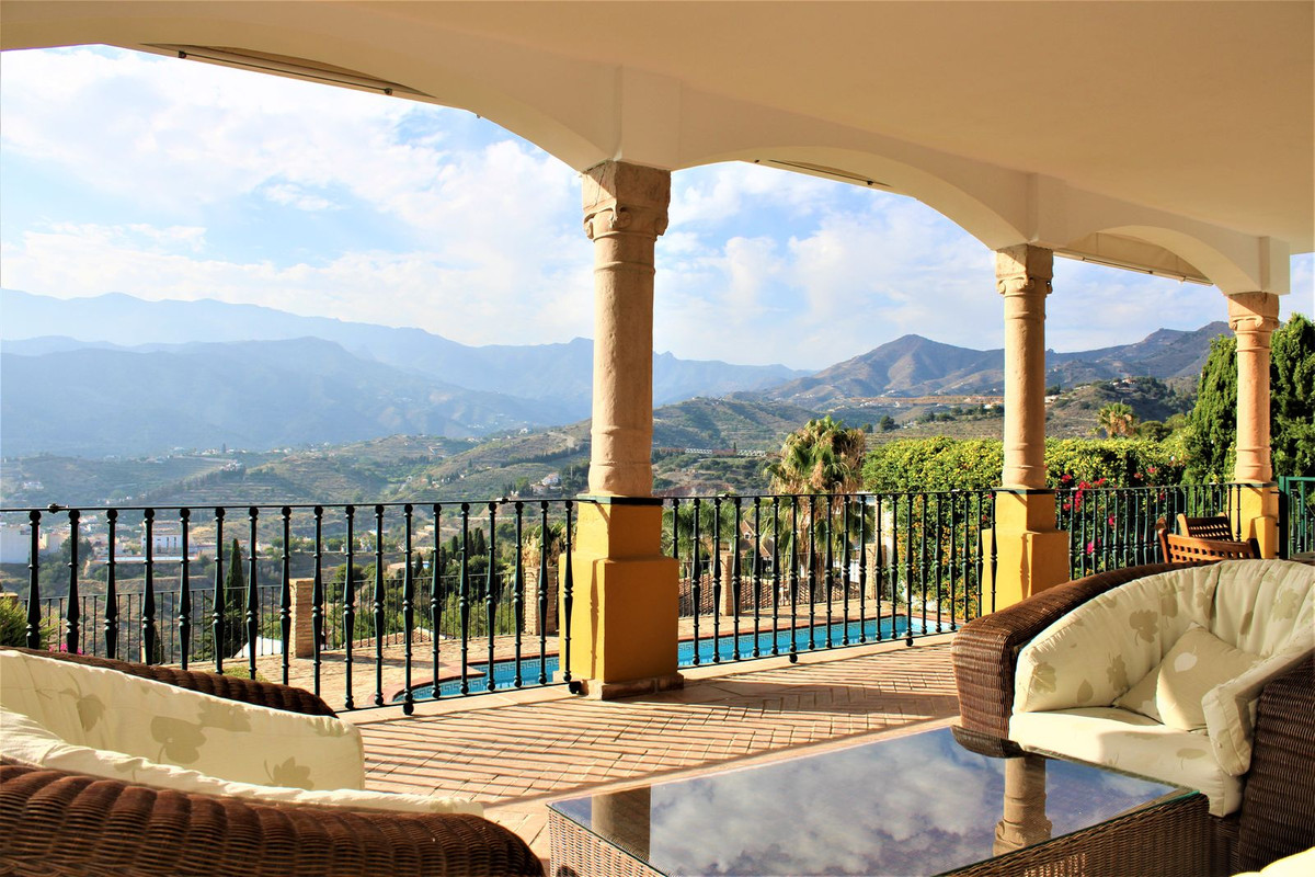 Fra stuen træder du ud på husets perle, en stor overdækket terrasse med vidunderlig udsigt over Alboranhavet og Cerro Gordos bjerge. Den omgivende have med sin frodige græsplæne og forfriskende pool er det perfekte sted til solbadning og afkøling på varme dage, samt til afslapning med familie og venner om aftenen. Terrassen er smukt dekoreret med autentiske søjler.