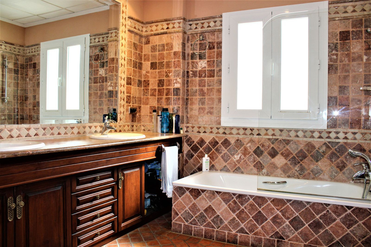 Via stuen når du soveværelserne og til venstre for hallen, fra indgangen, er en rummelig korridor dekoreret med elegante lamper, som fører til tre store soveværelser med egne badeværelser. Her er også et fjerde, smukt dekoreret gæstebadeværelse.
