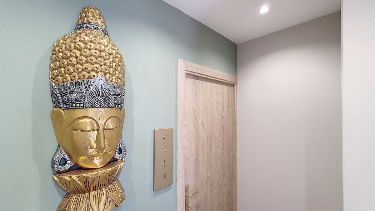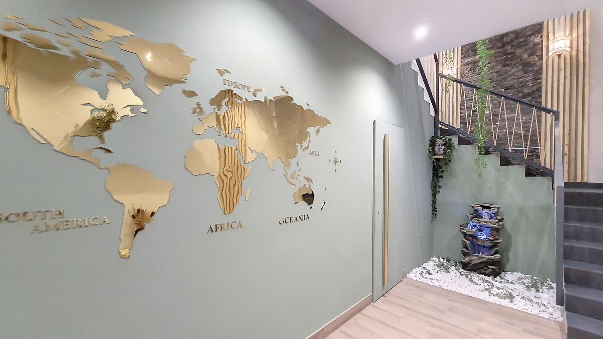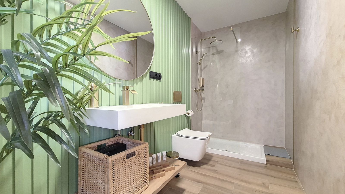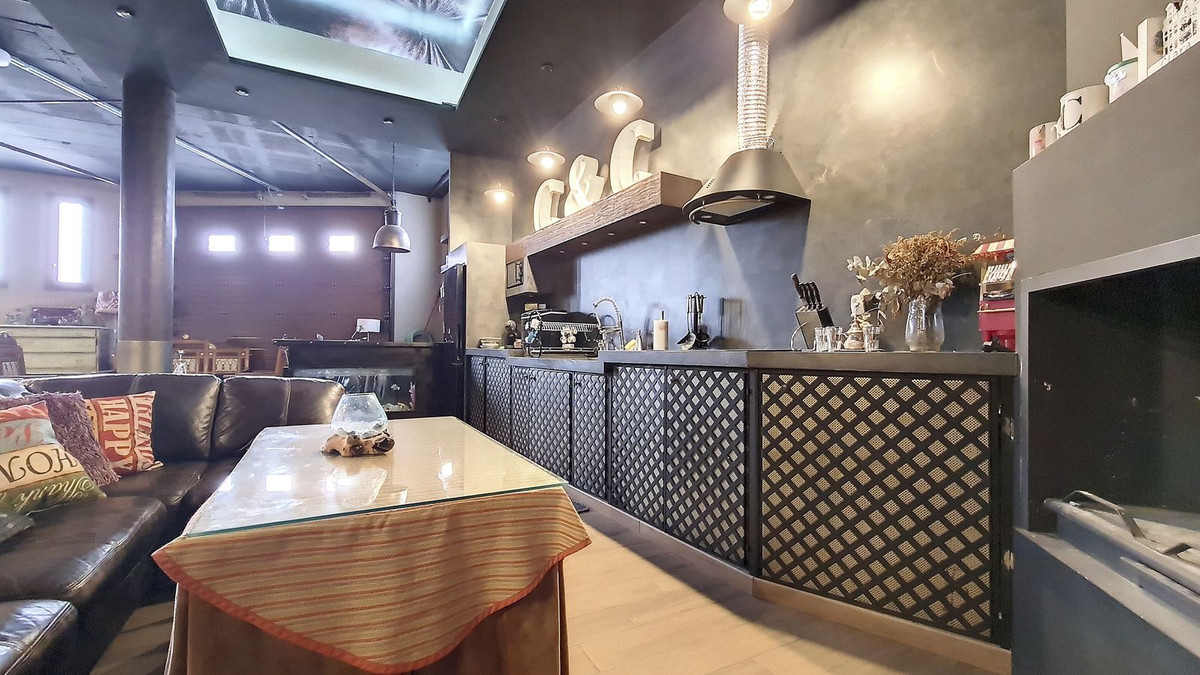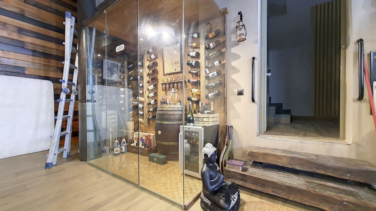 Når du træder ind gennem den imponerende ståldør, bliver du mødt af en stilfuld lobby med en beroligende vandfontæne. Før vi går på opdagelse i lejlighederne via den elegante trappe, tager vi et øjeblik til at værdsætte det alsidige rum, der oprindeligt var en garage. Dette område er blevet omdannet til en fantastisk bodega og et festlokale med bar, åbent køkken, pejs og et rummeligt badeværelse. Bag et elegant glasskab finder du et udsøgt udvalg af vine. Mulighederne for dette smukt indrettede rum er uendelige.