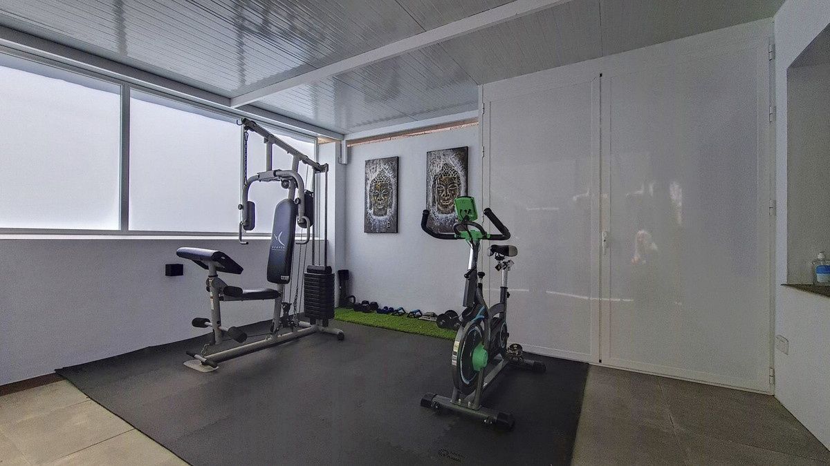 Gå op til øverste etage, hvor du finder et hyggeligt opholdsområde med panoramaudsigt gennem et hjørnevindue. Denne etage giver adgang til den storslåede tagterrasse, der byder på en betagende udsigt over landsbyen og de omkringliggende bjerge. Terrassen er delvist overdækket og giver de ideelle rammer for solbadning på behagelige liggestole efter en forfriskende dukkert i saltvandspoolen eller for at nyde skyggefulde stunder ved et af de indbydende borde. Der er også et loungeområde og fitnessudstyr, og der er mulighed for tv-forbindelse. Desuden er taget udstyret med 24 solpaneler for ekstra bæredygtighed.