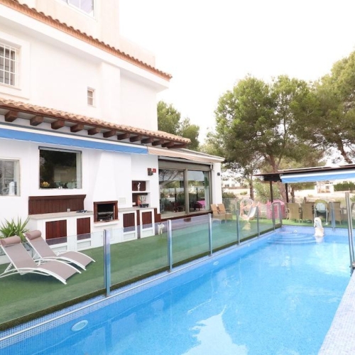 The house has been completely renovated with modern materials of high quality and design. It has a private infinity pool and from the first floor it has spectacular views of the sea and the pine forest. It is distributed on two floors : the entrance floor has: office, 4 bedrooms, two bathrooms and a toilet. Three of the bedrooms with direct access to the terrace and views. On the upper floor we find a very large living room, dining room and kitchen, with access to a large terrace with barbecue and views of the sea and the green area. In addition to another bathroom. The house is located in one of the best areas of the exclusive golf course, a few minutes walk from the shopping center (with bars, restaurants, pharmacy, bus stop)\n