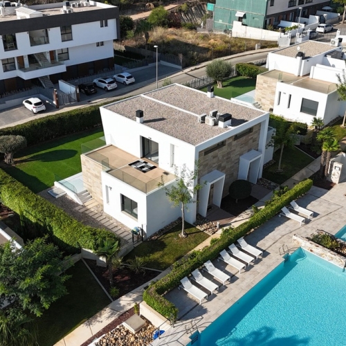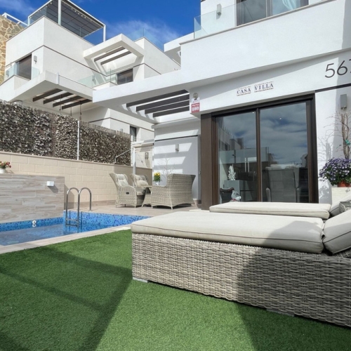 This West Facing, 2018 Built, Three Bedroom, Detached Villa in Las Filipinas, a popular residential area within Villamartin. A variety of bars/restaurants can be found just ten minutes on foot; the nearest main chain supermarket, five minutes by car along with three golf courses, Villamartin Plaza, La Fuente commercial centre. La Zenia Boulevard shopping centre is ten minutes by car and the beaches along the coast fifteen minutes. Having been built by a reputable constructor, the qualities within this property are second to non. The main living area being open plan with two sets of wide sliding doors, one from the lounge and the other the dining area which lead out to the pool area, there are also stairs leading up to the first floor and to the underbuild. The kitchen is fully fitted and there is a shower room plus a double bedroom with en suite shower room along with a terrace. On the first floor there is a further double bedroom with dressing room, en suite and access up to the solarium. The underbuild comprises of a lounge and kitchen area plus a double bedroom with en suite, double sliding doors to the outside and a kitchen area. The garden is tiled with an artificial grassed area, a 7x4 private pool and off road parking Extras include air conditioning, electric gates and built in wardrobes in bedrooms.<br /