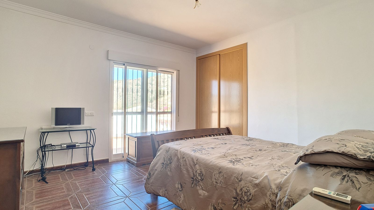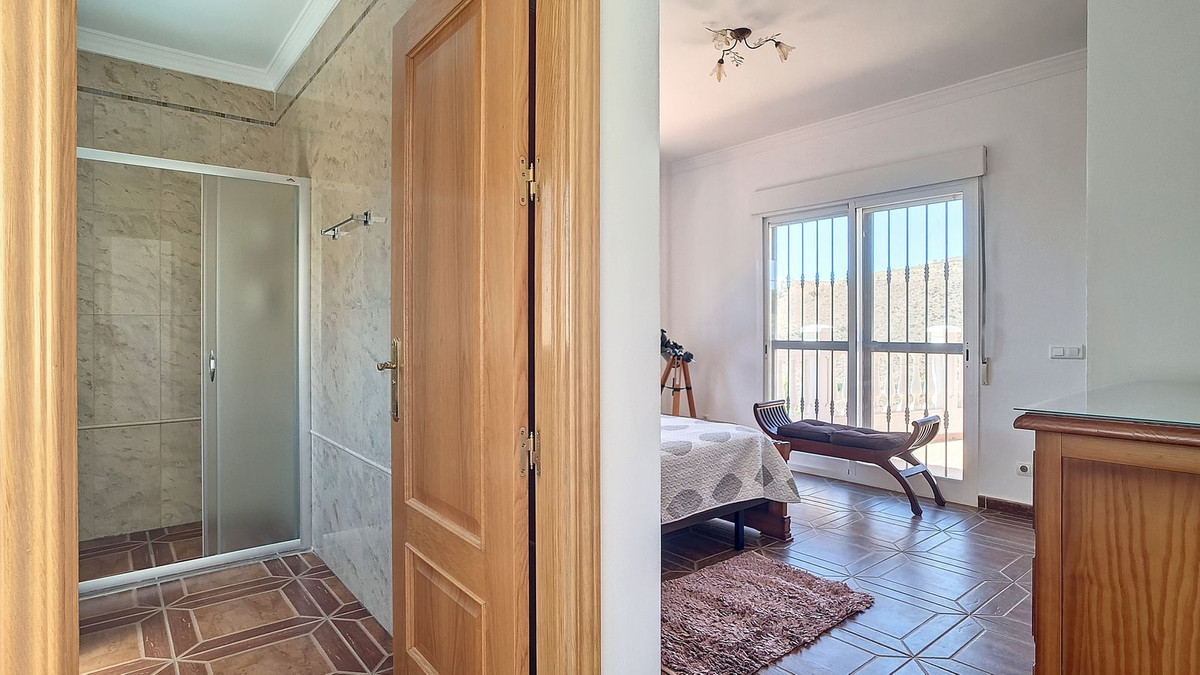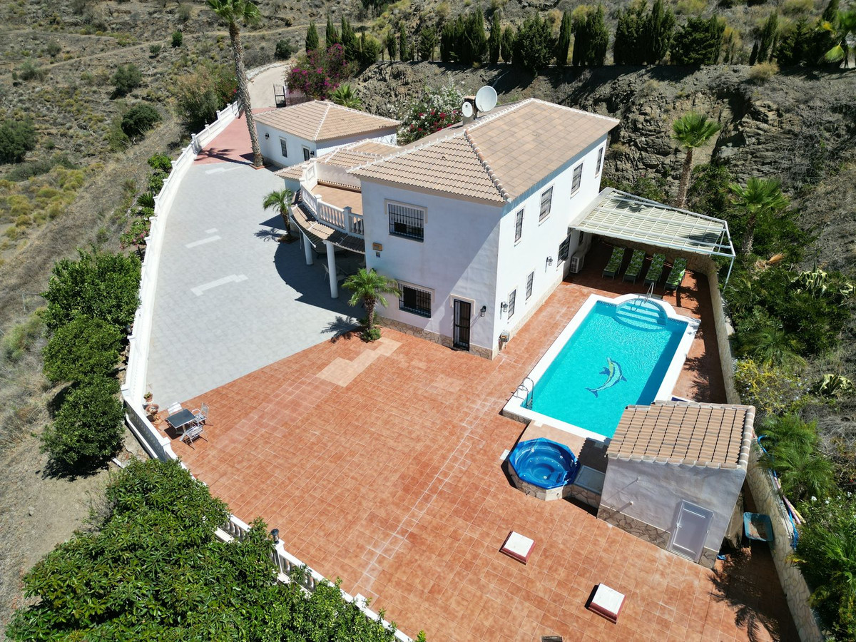 Denne villa har en af de bedste beliggenheder i Axarquia-regionen og består af et hovedhus med 2 etager, i alt 4 soveværelser og 3 ensuite badeværelser. I stueetagen er der en rummelig stue med aircondition og pejs, et fuldt udstyret køkken (ovn, mikroovn, opvaskemaskine og induktionskogeplade), et opbevaringsrum som ekstra køkkenplads og et opbevaringsrum som vaskerum. I forbindelse med opholdsstuen er der et rummeligt soveværelse med indbyggede skabe og eget badeværelse (håndvask, toilet, bidet og bruser). Desuden er der et ekstra soveværelse eller kontor og et separat gæstetoilet.