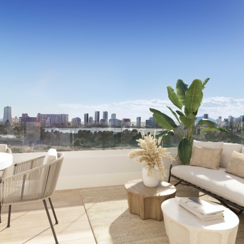 Beautiful large new construction apartment with panoramic sea views 12m from the Arenal Bol beach in Calpe. The apartment has an area of 143m2, distributed between large living room with access to the large terrace, open kitchen, 3 bedrooms and 2 bathrooms. The building has been built in 2019. The construction and finishes are of high quality. It has a communal pool and covered parking.