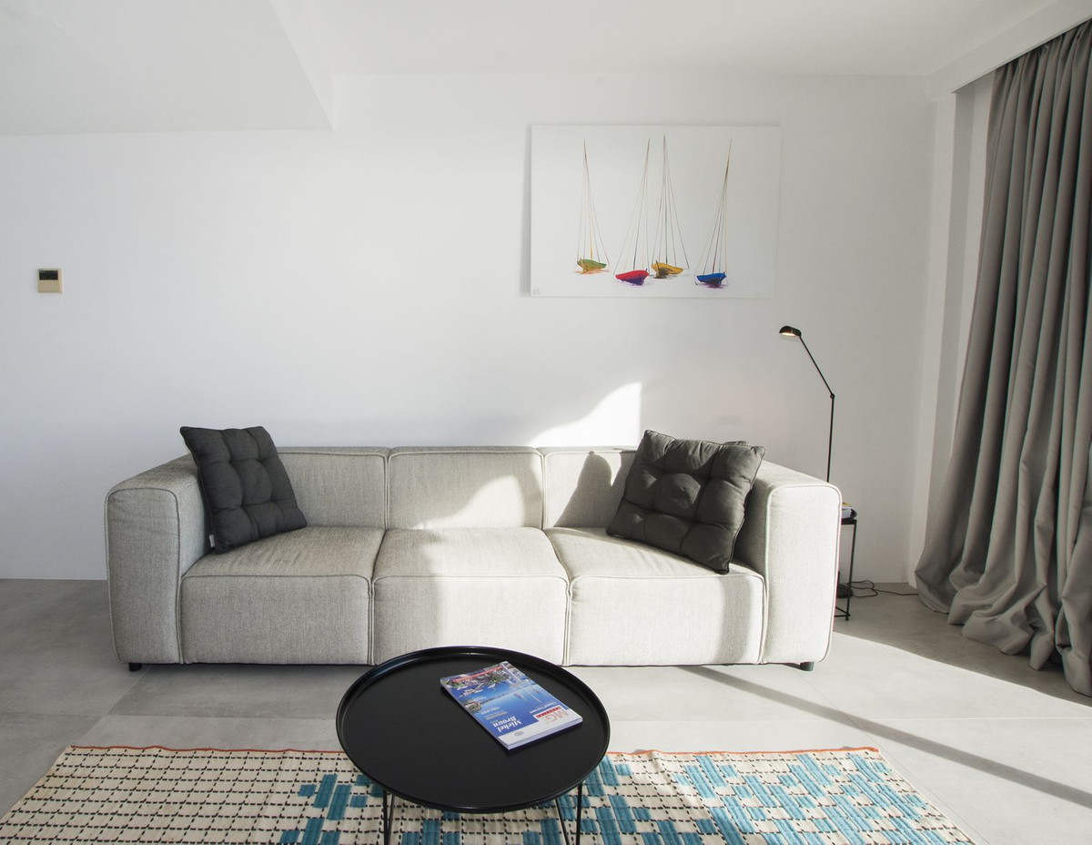 The living area is distributed over two levels and includes: a spacious living room with dining area, an open, fully equipped kitchen with an island, 2 bedrooms (both with ensuite, one with access to a terrace), 2 bathrooms, a guest toilet and 3 sunny terraces.