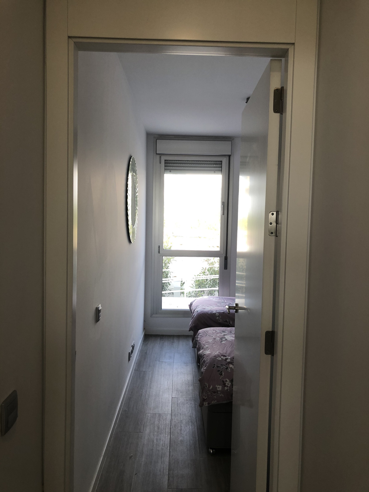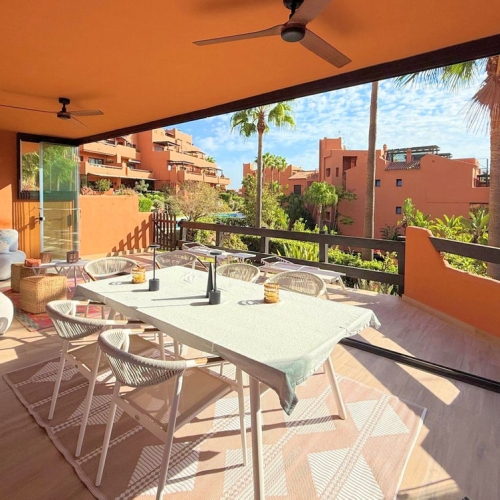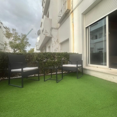 Modern apartment located in the charming village of Cancelada in Estepona. The garden apartment consists of a bright lounge and dining area have access to a private wouth facing terrace of 18 sqm and a garden of 30 sqm. The open plan kitchen is fully equipped with top range appliances. The 2 bedrooms have en-suite bathrooms and fitted wardrobes. The complex is gated with security services and concierge and has 2 swimming pools, kids pool and play area. Few minutes walking to shops, restaurants and services and only 5 minutes by car to the beach and Los Flamingos golf course.