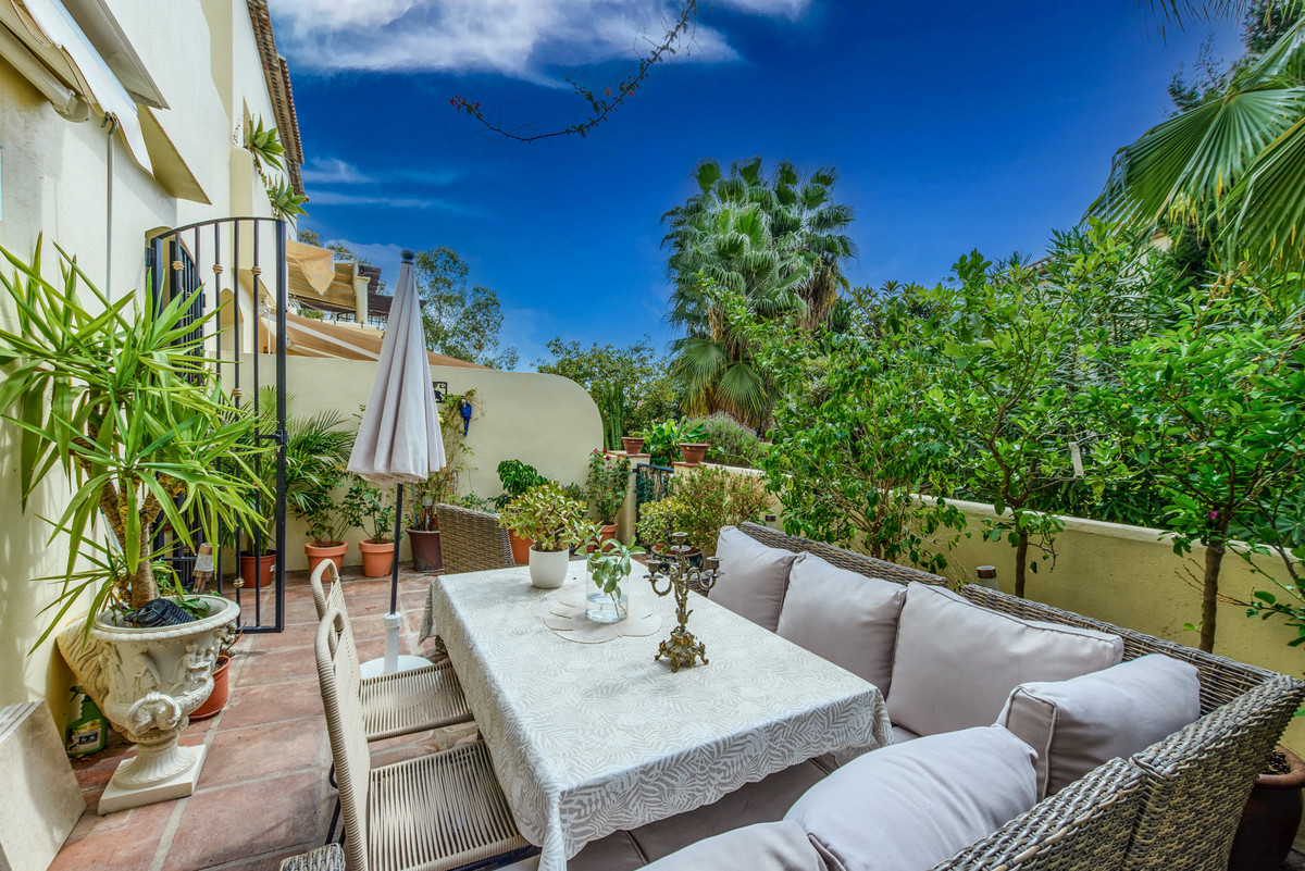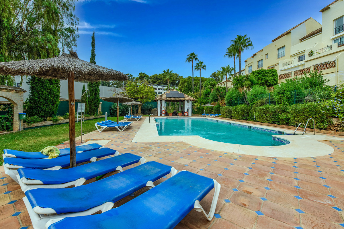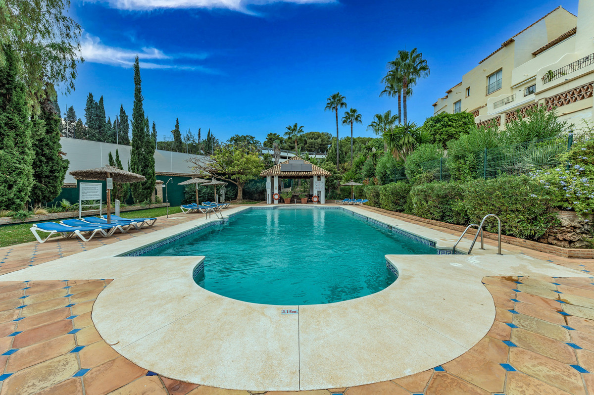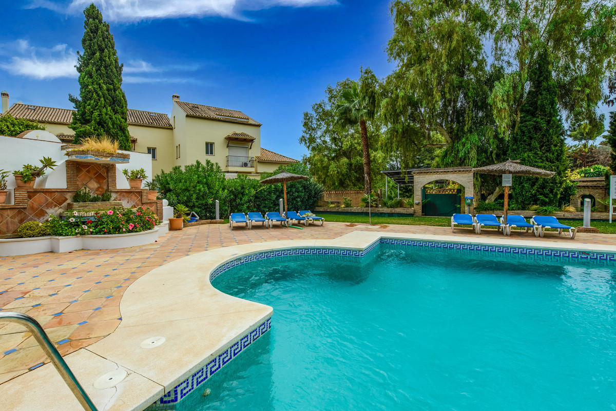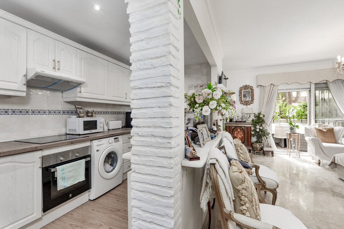 Velbeliggende og lys, toværelses, sydvestvendt lejlighed i stueetagen i et velbeliggende og populært lukket kompleks i Nueva Andalucía golfdalen.