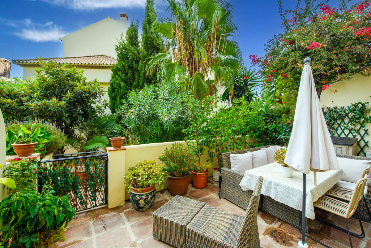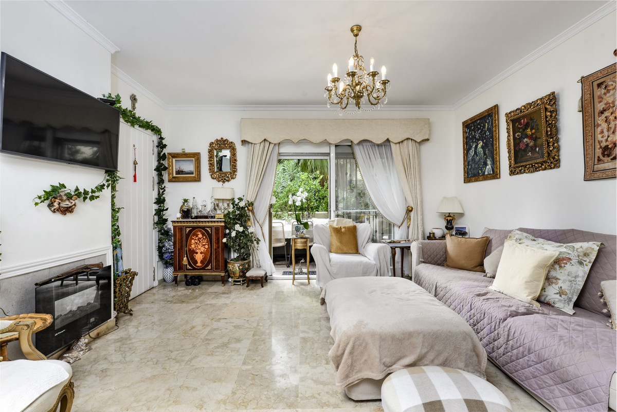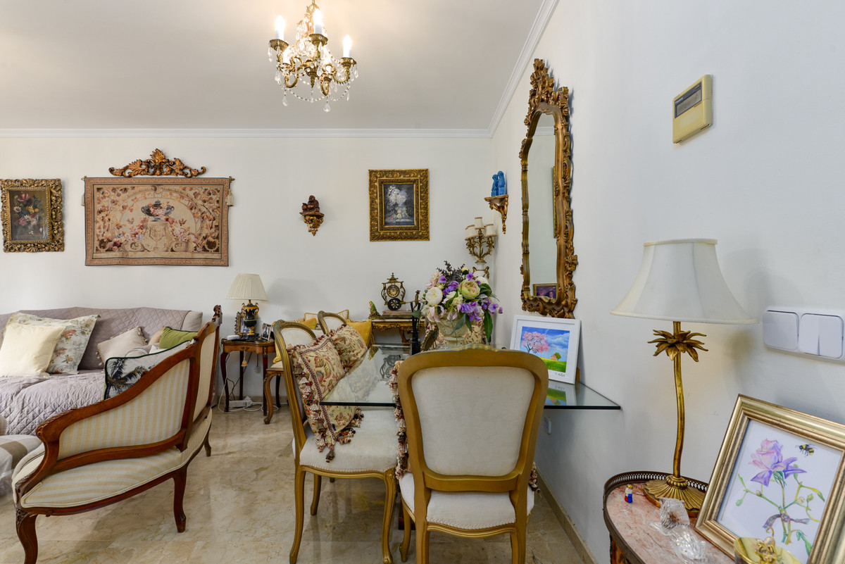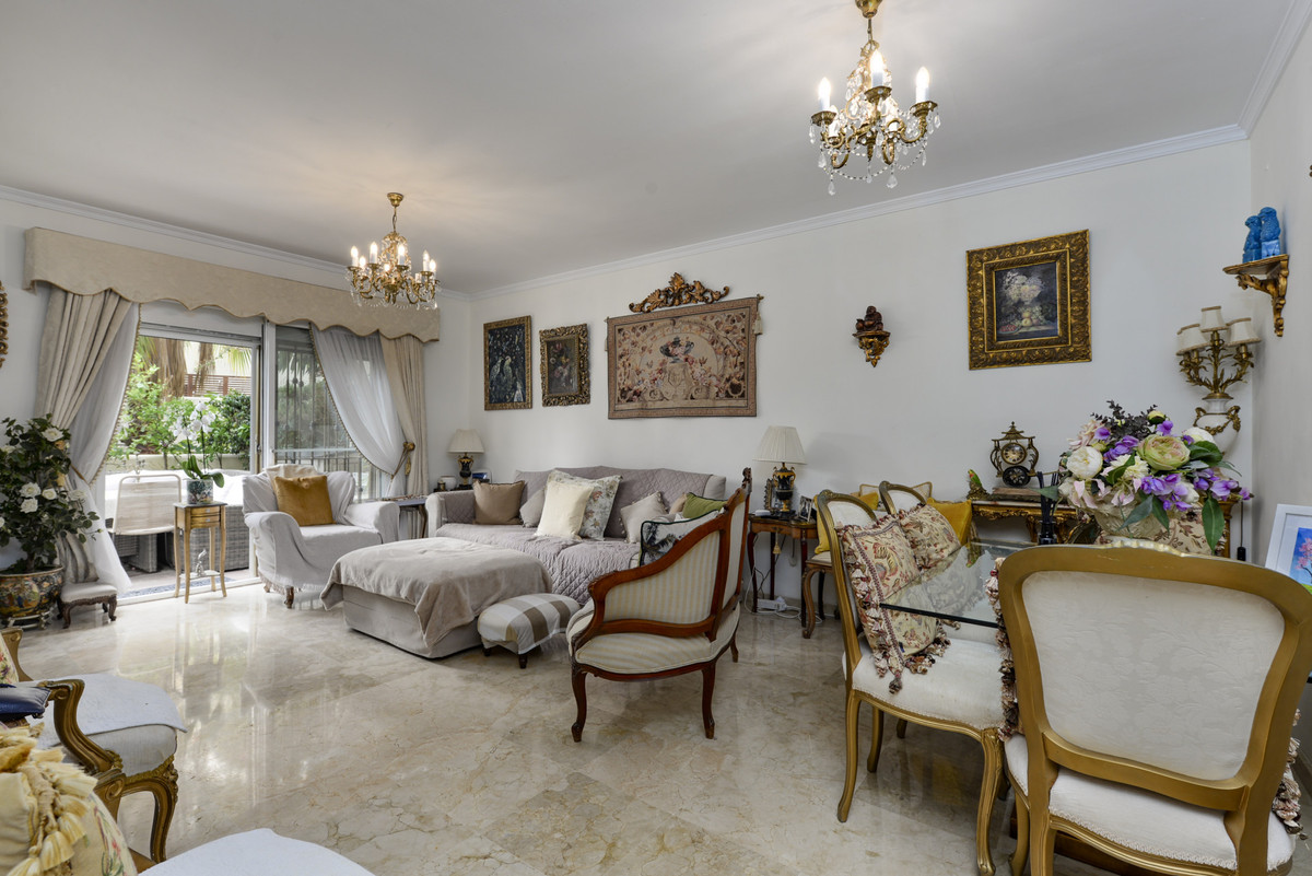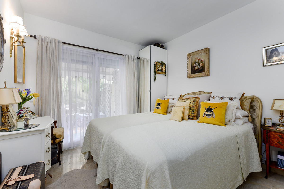 Velbeliggende og lys, toværelses, sydvestvendt lejlighed i stueetagen i et velbeliggende og populært lukket kompleks i Nueva Andalucía golfdalen.