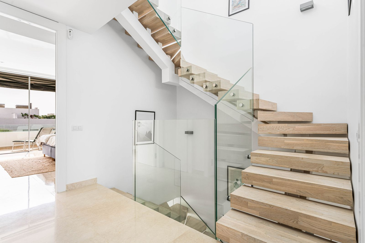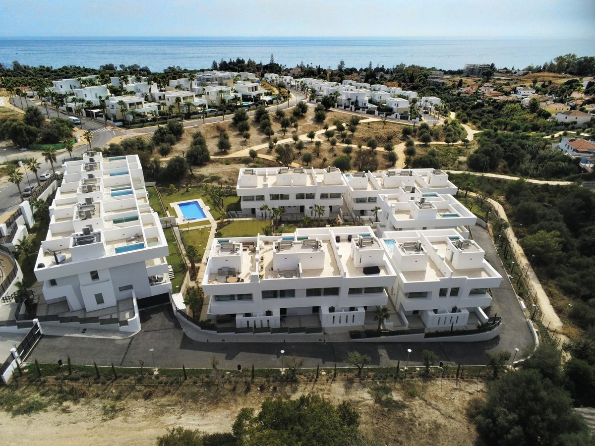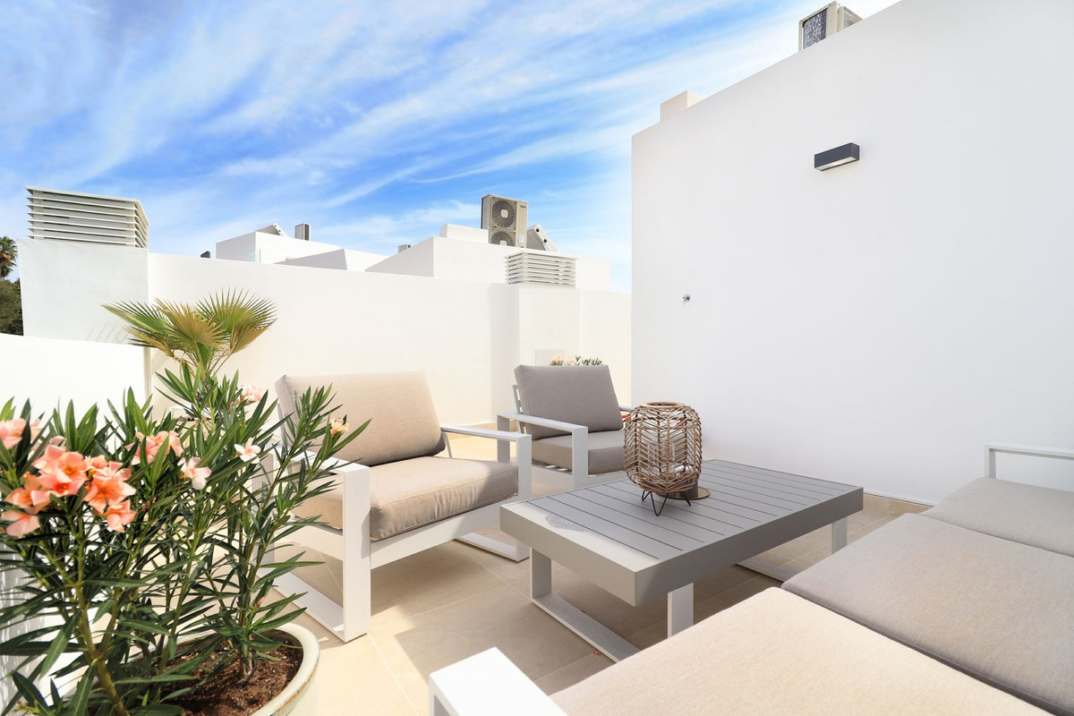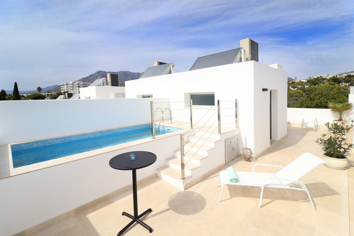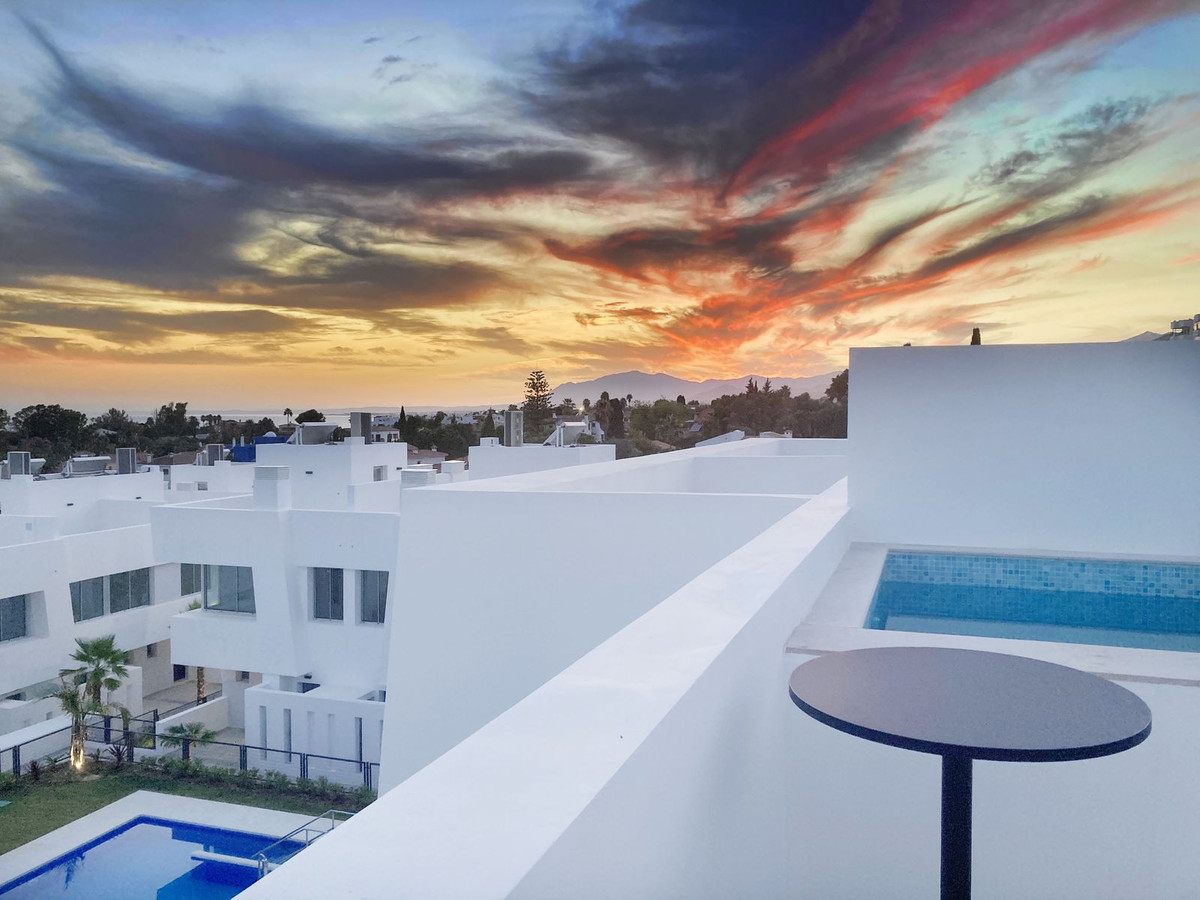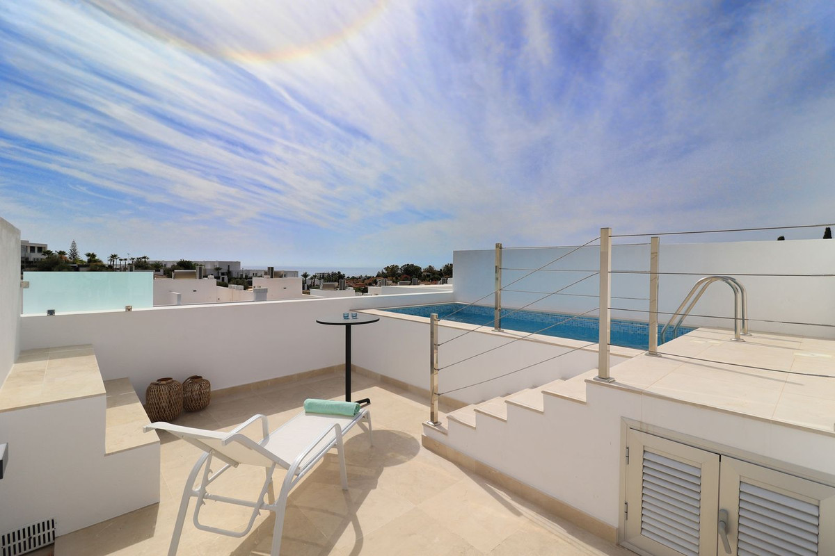 Dette eksklusive nybyggede rækkehus med tagterrasse, privat infinity pool, 4 soveværelser og beliggende i en af de mest populære områder i Marbella.