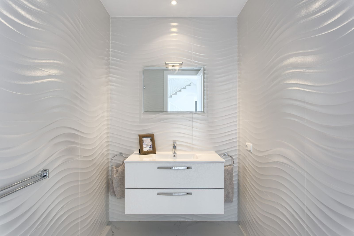 It consists of a beautiful hall/distributor that leads on one side to the spacious and bright living-dining room with access to the main terrace and from which, via stairs, you go down to the garden where the fantastic infinity pool is also located. On the other hand is the kitchen, fully equipped with Siemens and AEG appliances, open plan, very modern and attached to it, a laundry room. In addition there is a double bedroom with an en-suite bathroom and a guest toilet. From the lobby, via stairs or the elevator you can access the other floors.